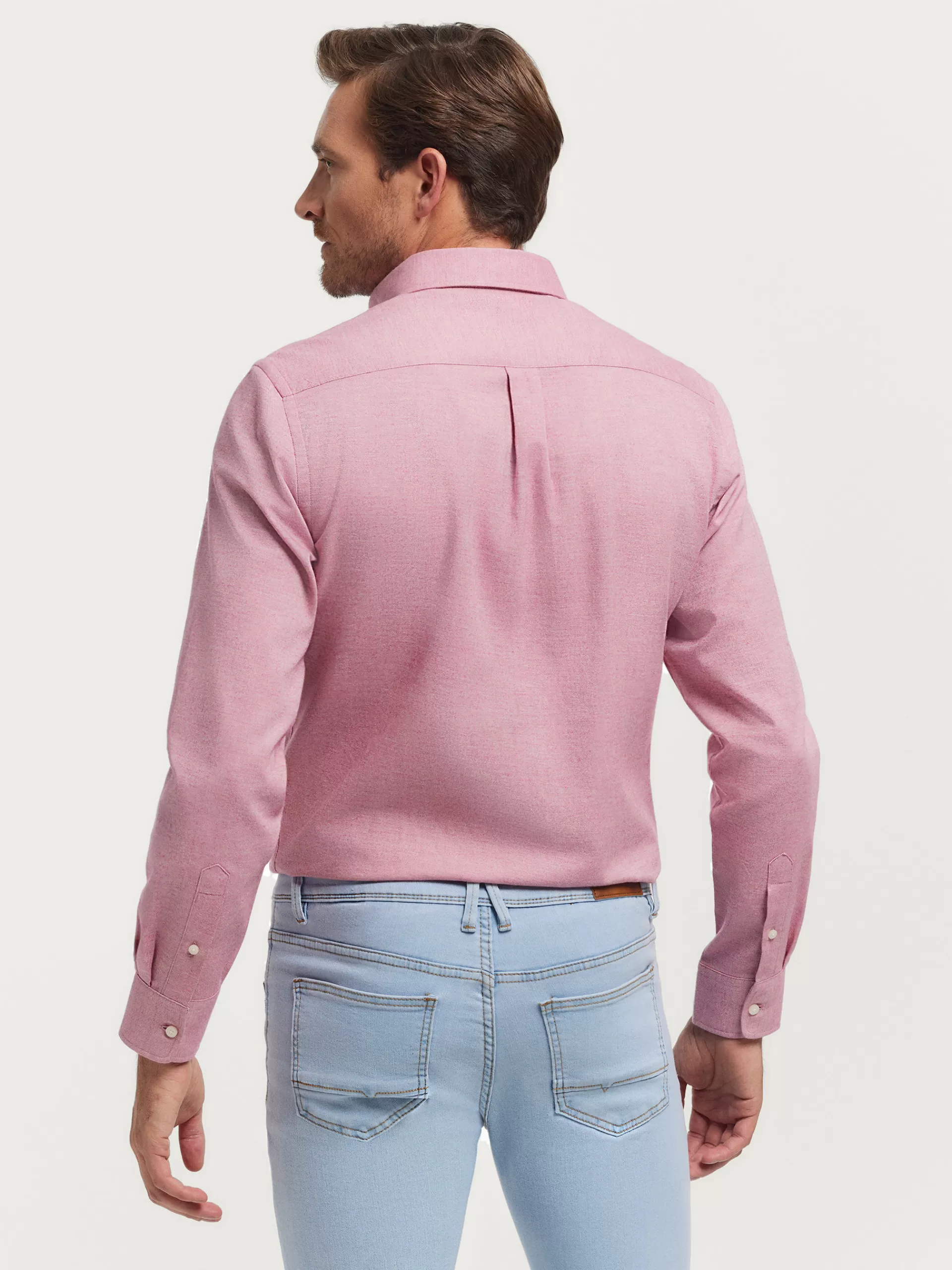Camisa confeccionada en tejido de franela con cuello clásico de botón, manga larga con puños simples y logo de marca grabado en el frontal. Corte regular fit.