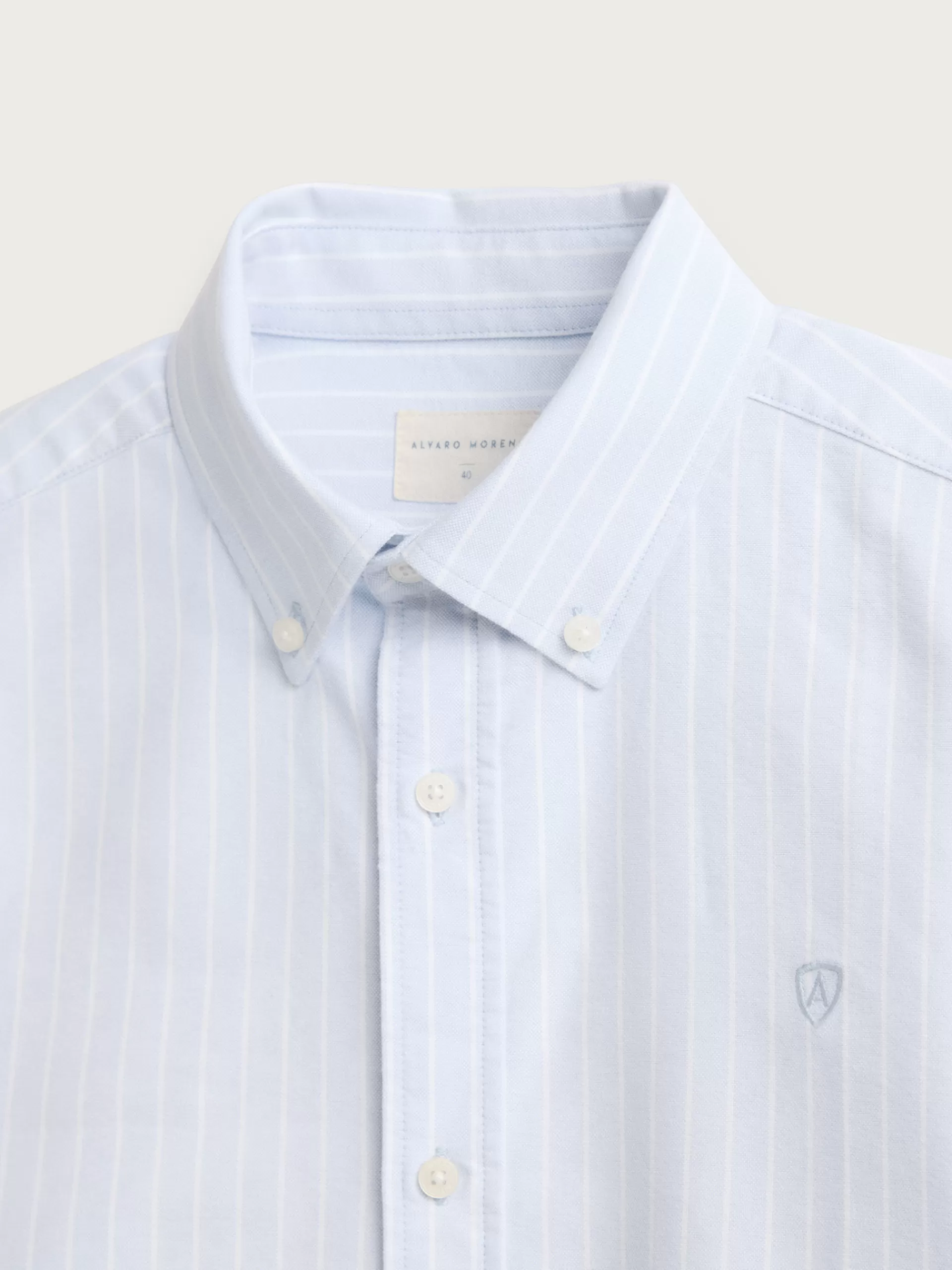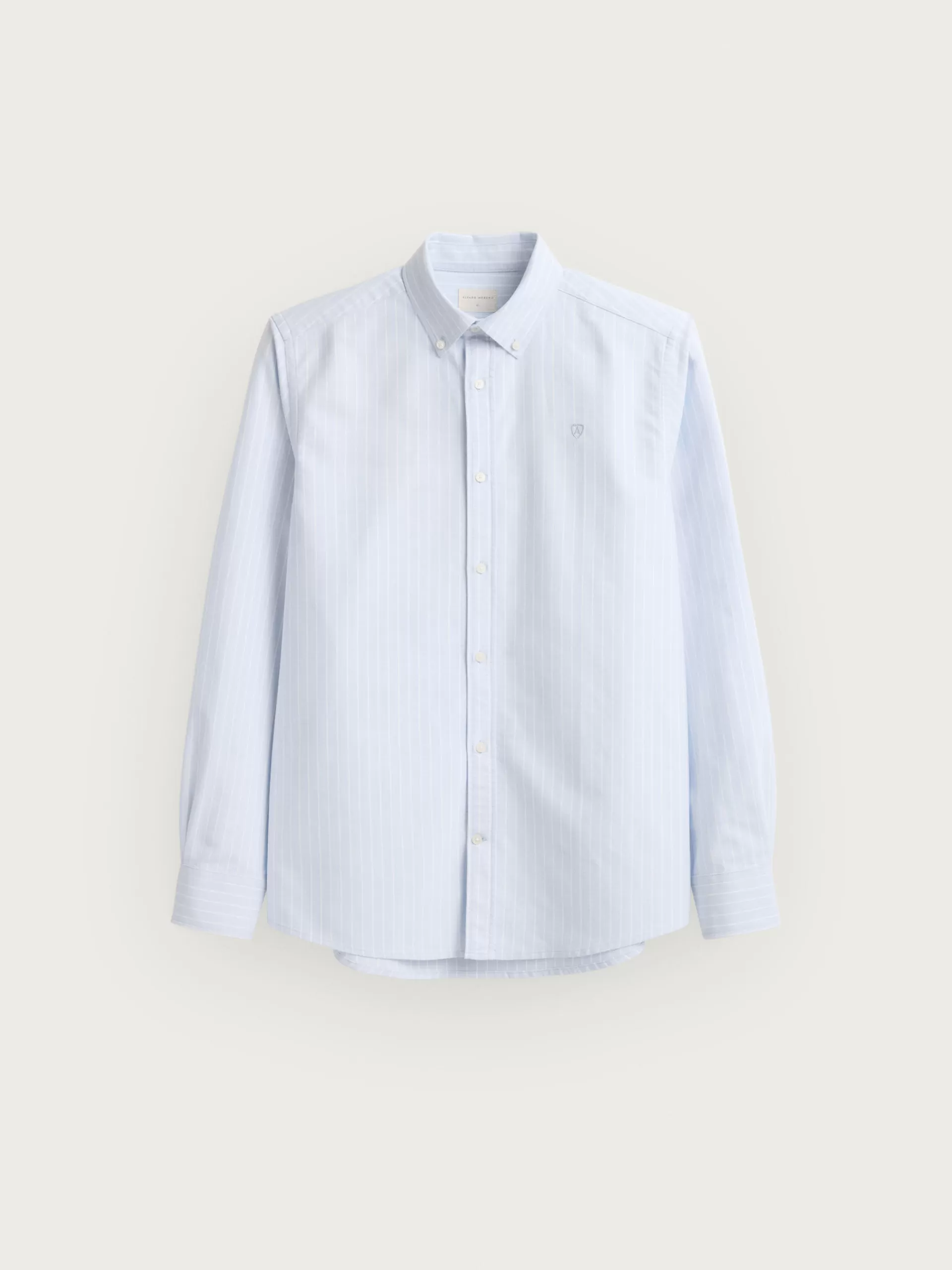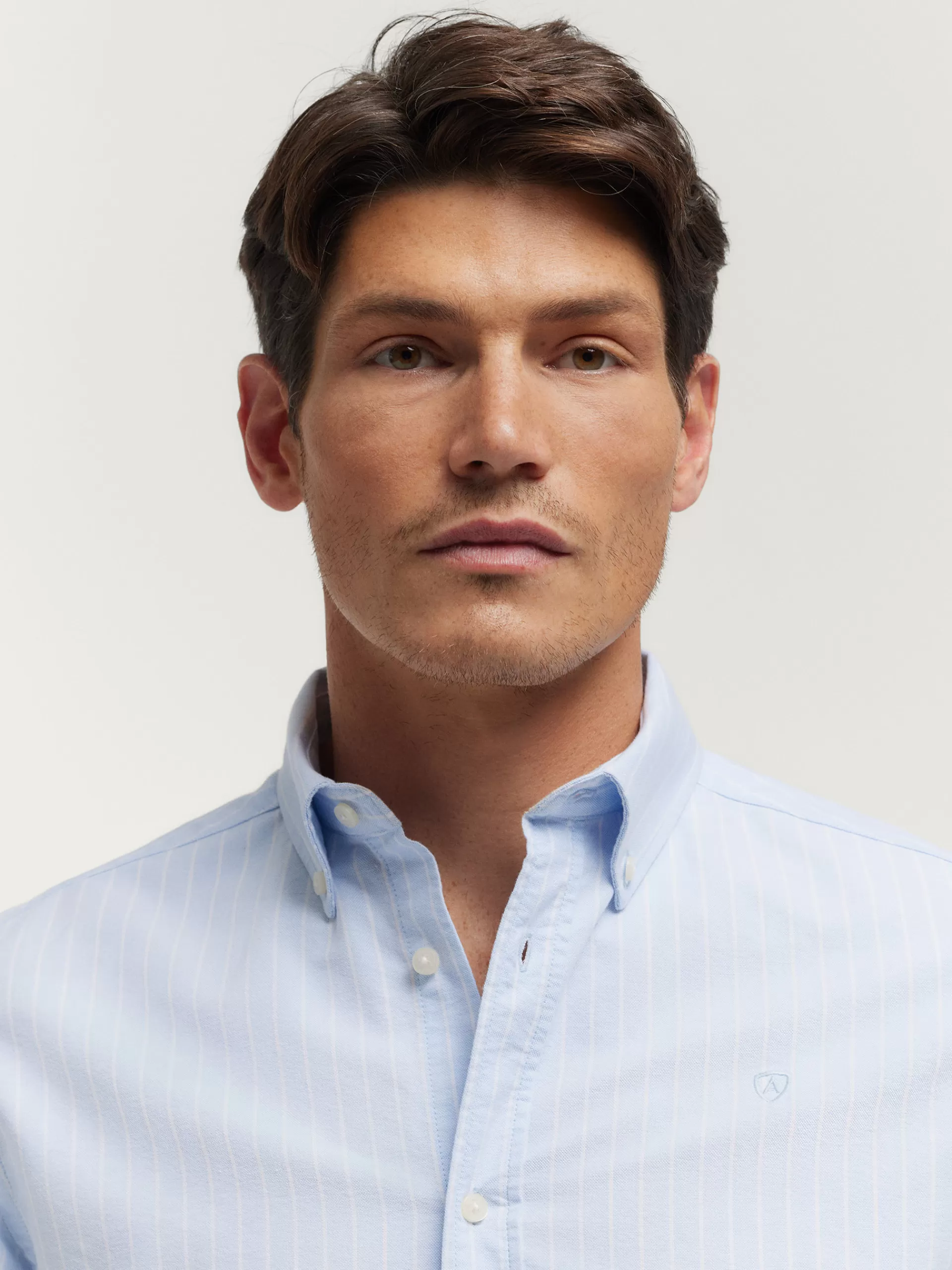 Camisa a rayas confeccionada en algodón con cuello clásico de botón, manga larga con puños simples y logo de la marca grabado en el frontal al tono. Corte regular fit.