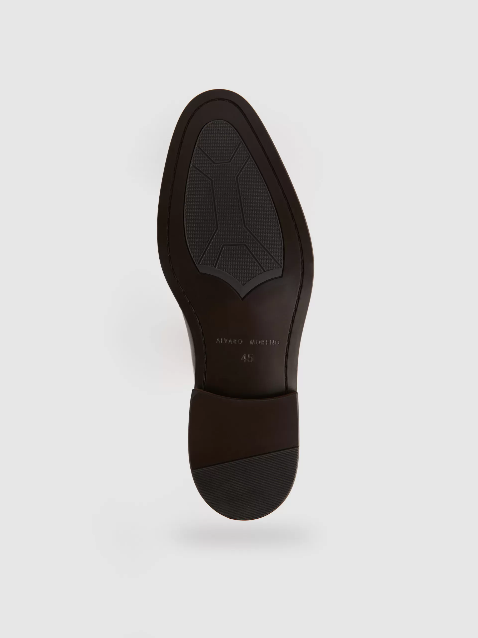 Mocasines confeccionados en piel. Cuenta con detalle en forma de borlas en el frontal, puntera redonda y suela cosida al corte con dos partes laminadas en goma antideslizante.