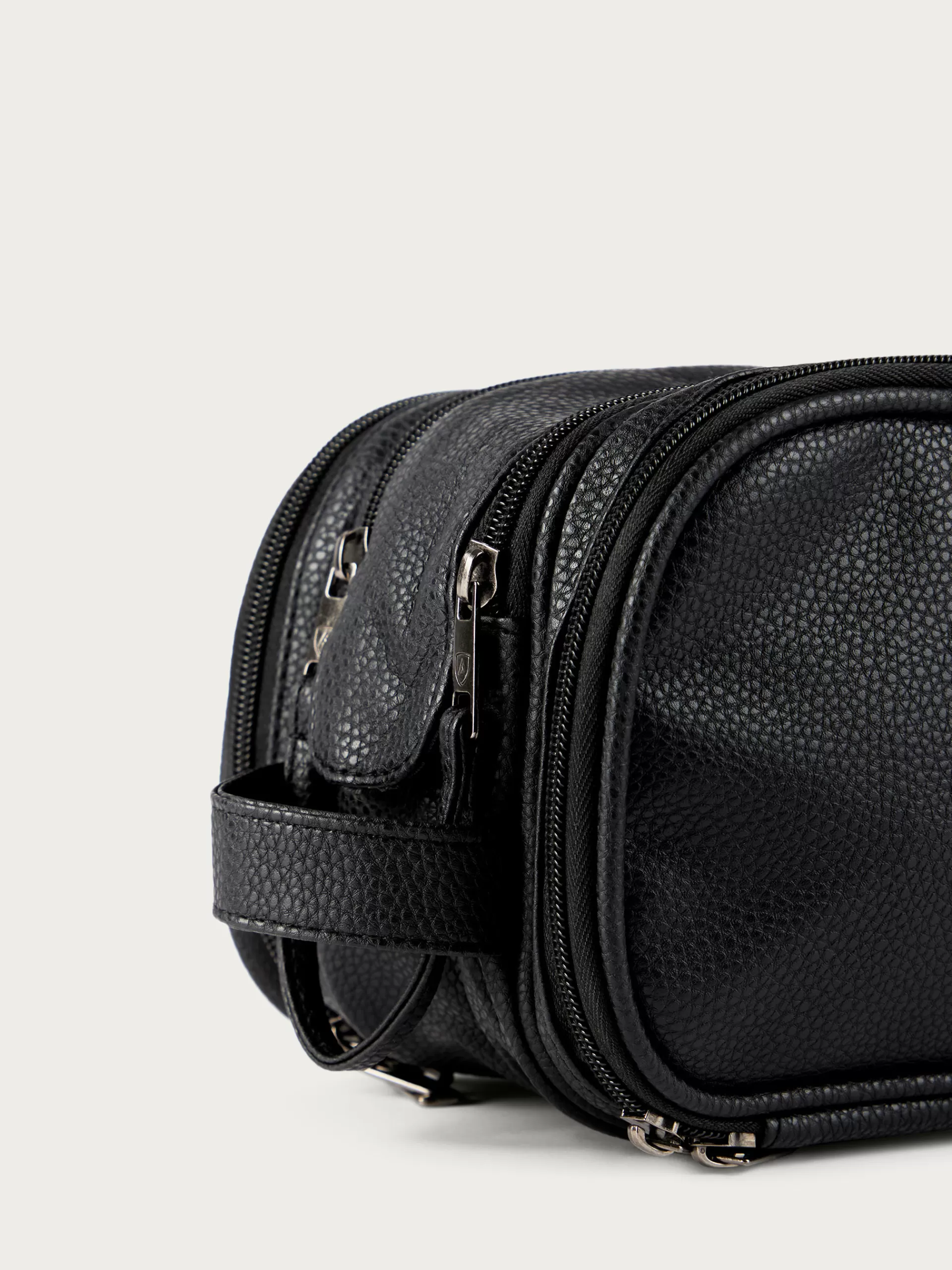 Neceser con asa de transporte lateral y detalle personalizado grabado en el frontal. Compartimento principal con cierre de doble cremallera y botón a presión. Compartimento en ambos laterales con cierre de cremallera. Forrado en su interior.