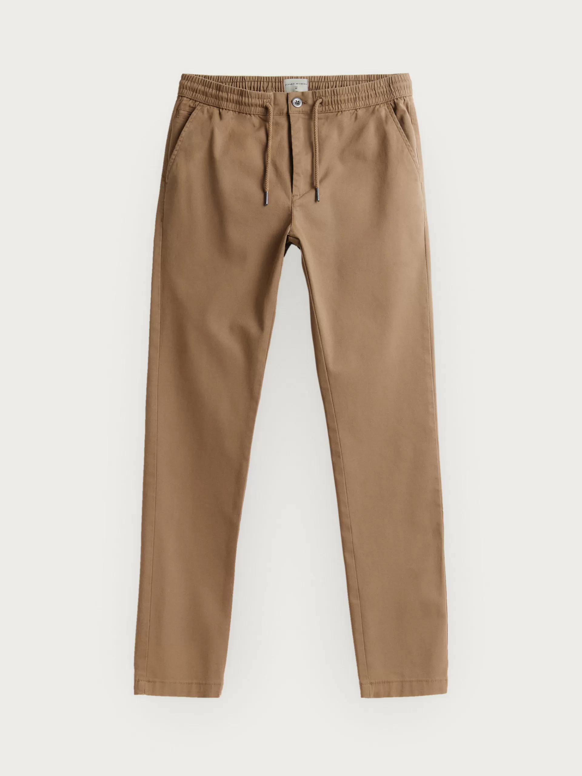 Pantalón con cordones ajustables al tono, cinturilla elástica y cierre mediante botón y cremallera. Tres bolsillos en la parte delantera y dos en la parte trasera con detalle personalizado sobre uno de ellos.