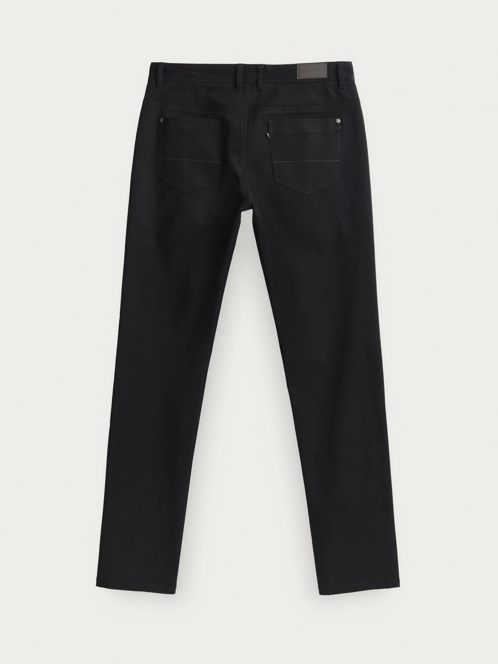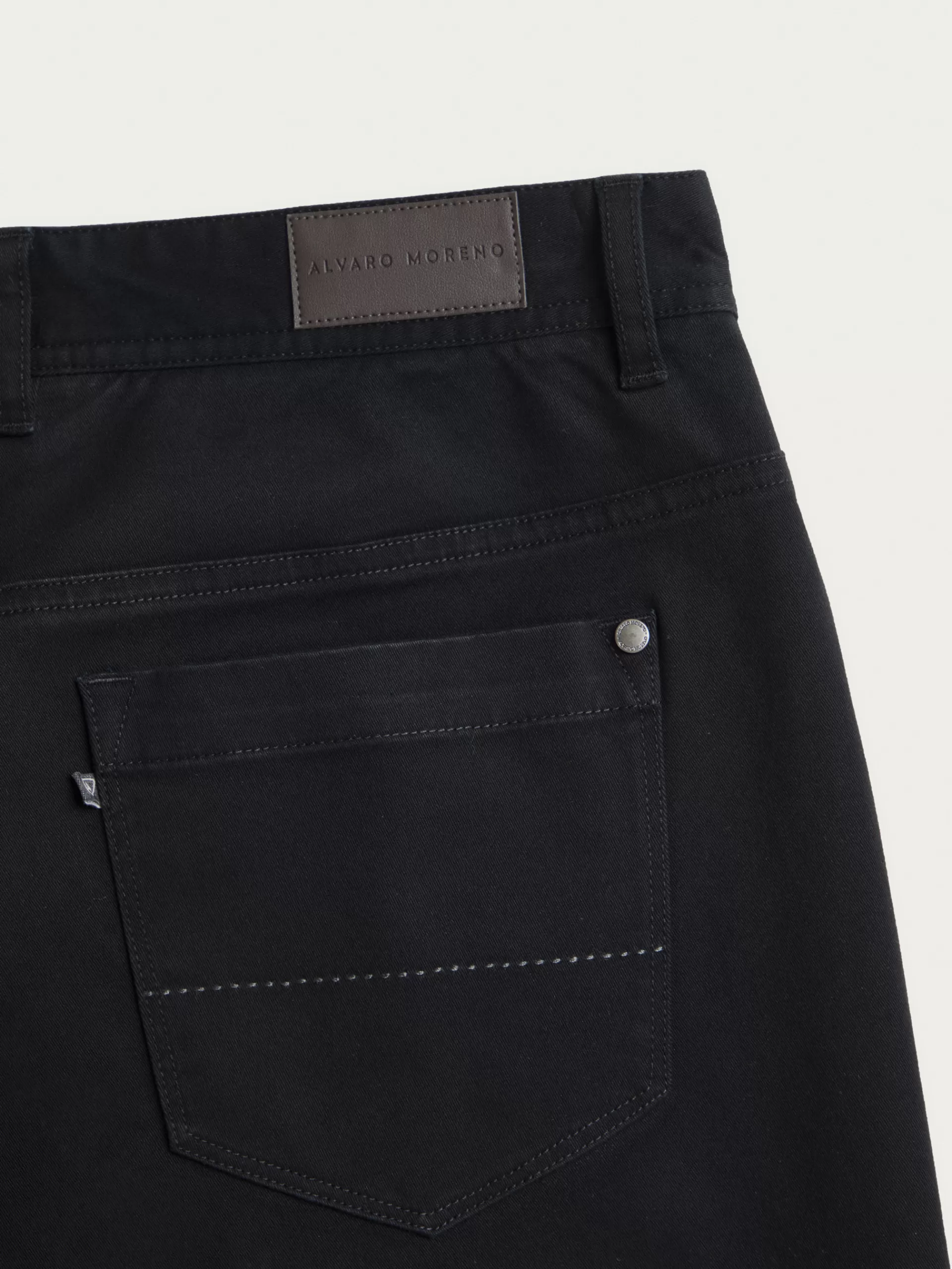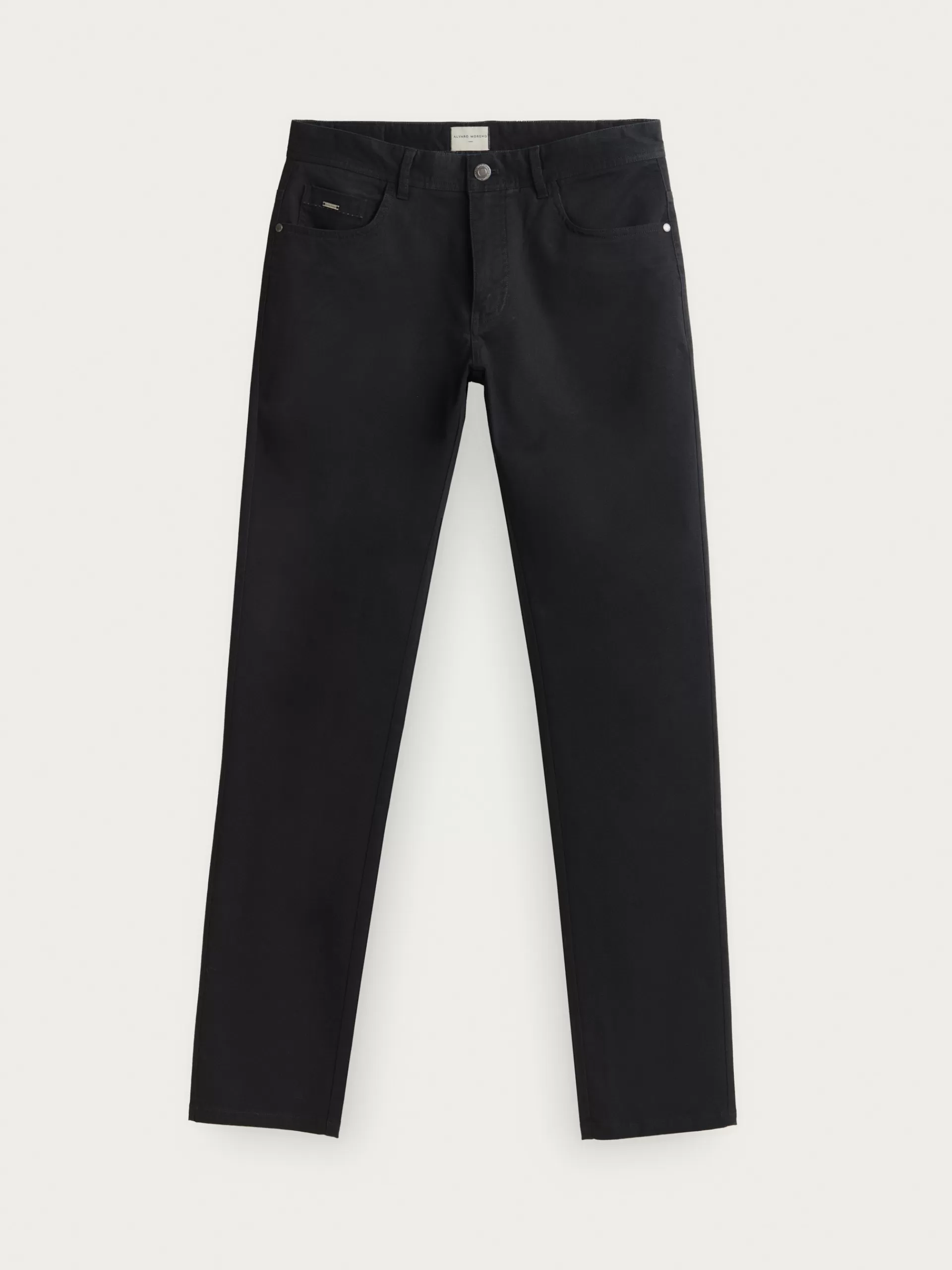 Pantalón de corte slim fit con 5 bolsillos. Cierre central mediante botón y cremallera, bolsillo cerillero y dos bolsillos traseros con pespunte al tono. Etiqueta personalizada en la cinturilla en aspecto piel.