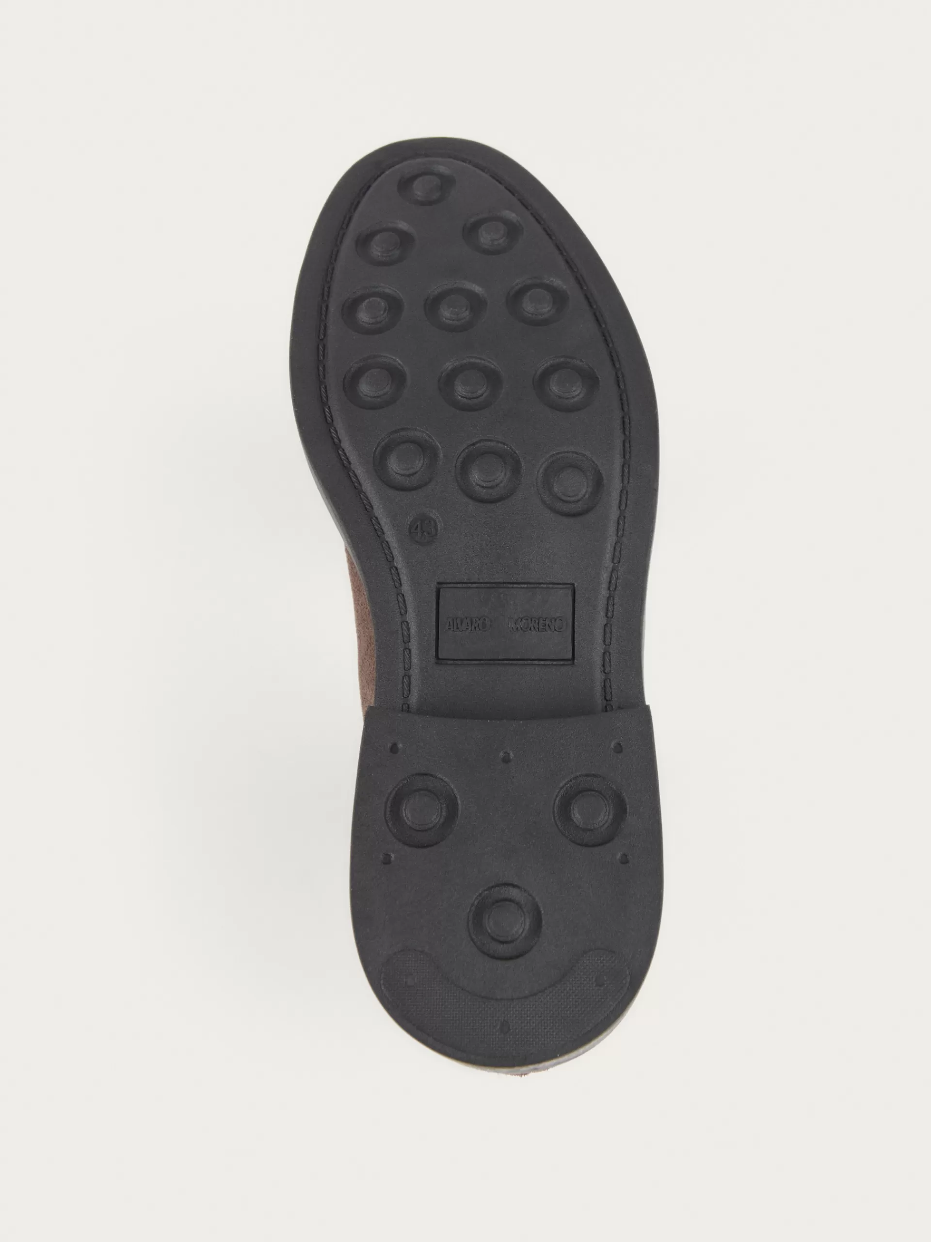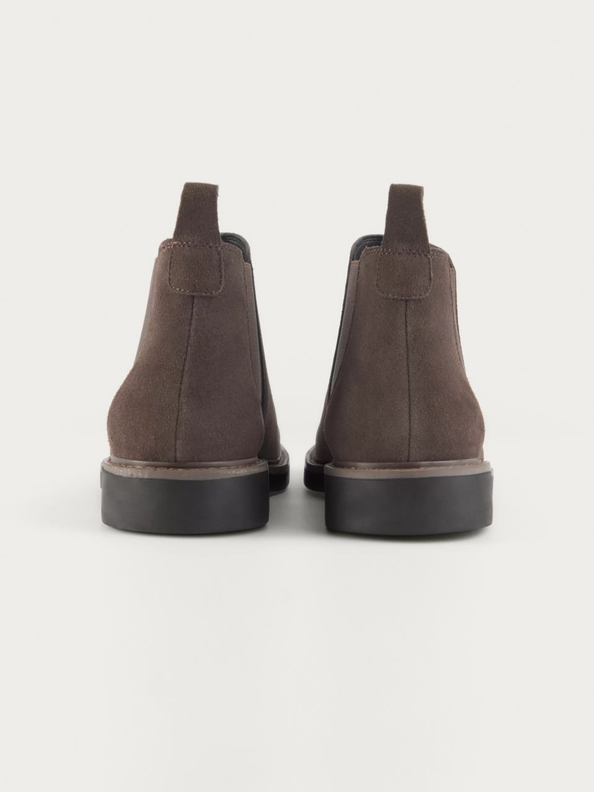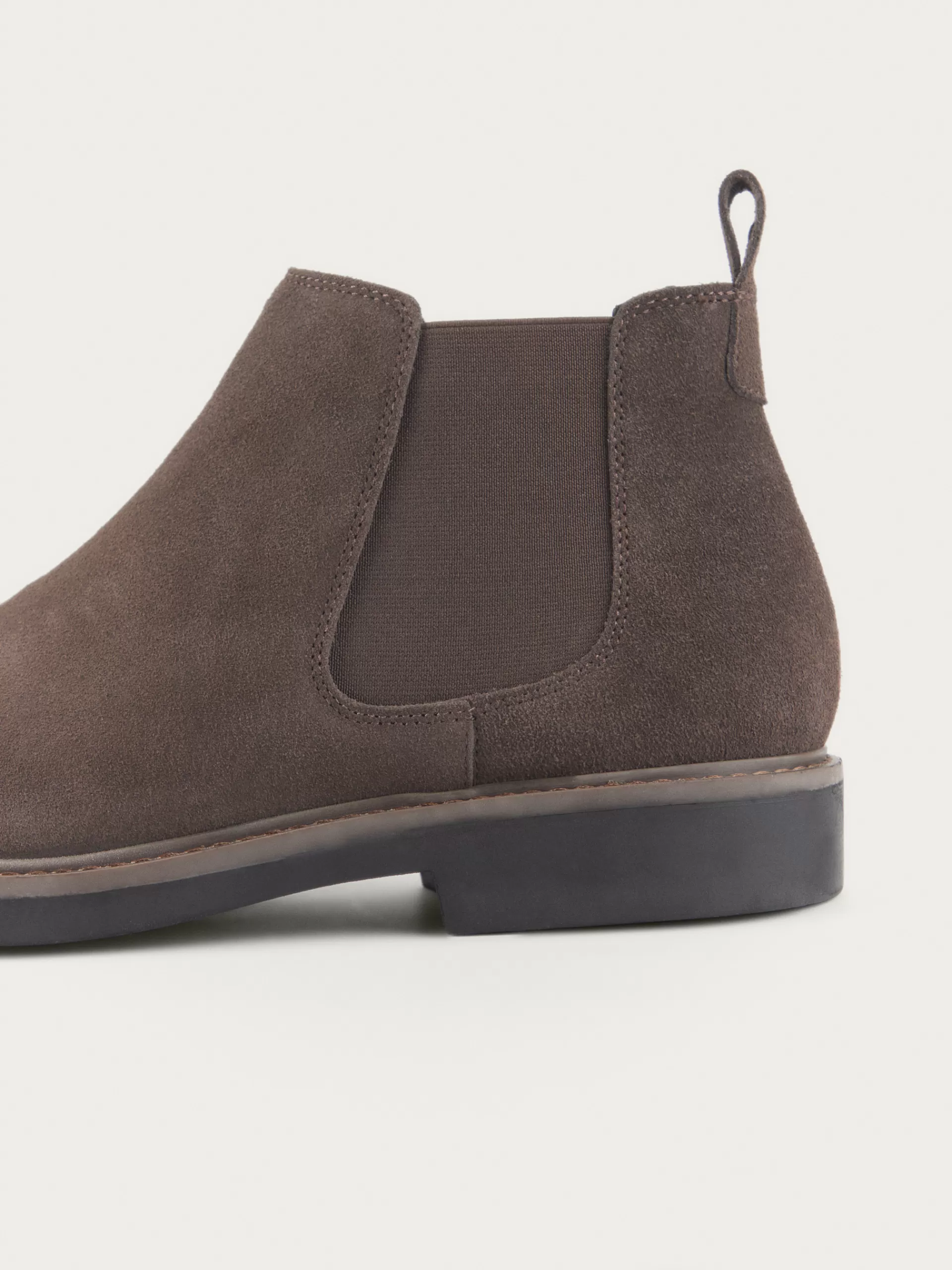 Botín estilo chelsea de caña media confeccionado en acabado serraje. Cuenta con dos piezas elásticas laterales y tirador trasero.