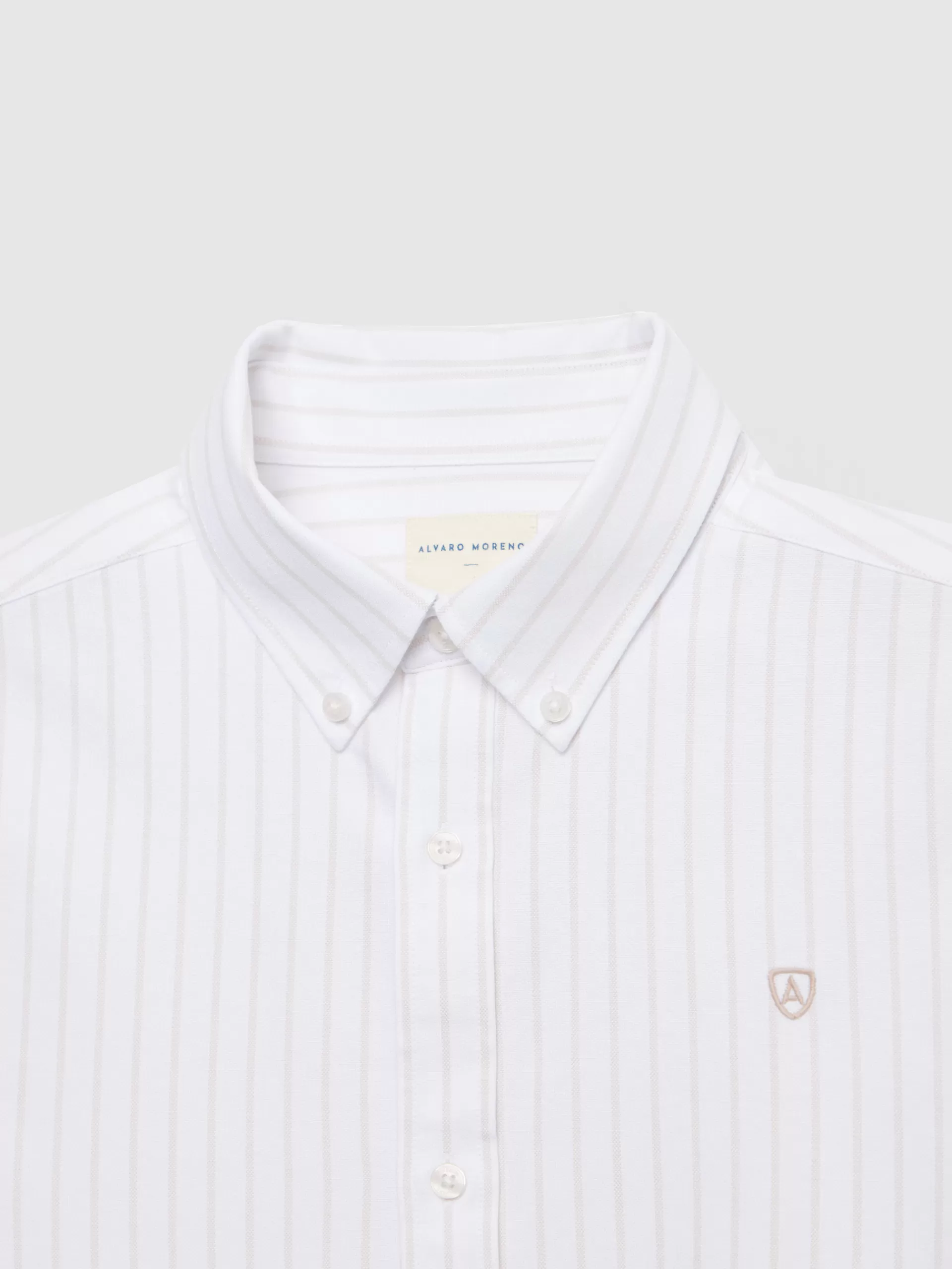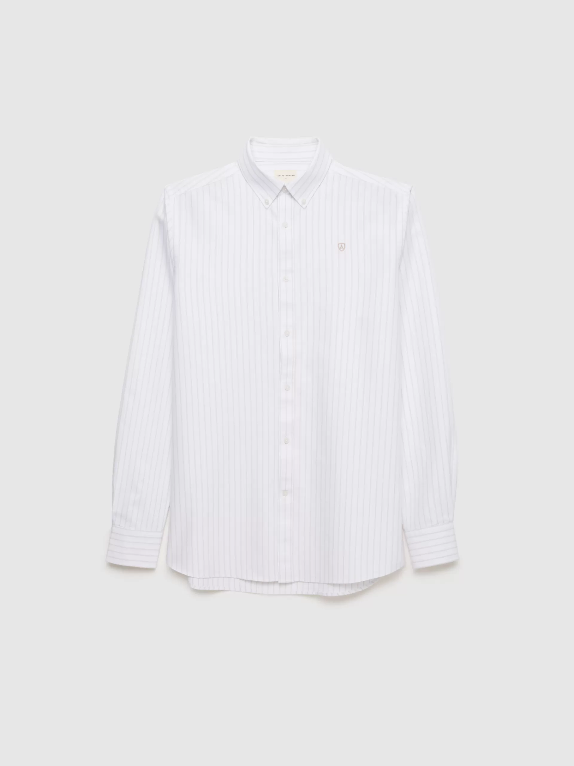 Camisa estilo a rayas confeccionada en algodón. Cuenta con cuello botón, manga larga de puños simples y logo grabado al tono en el frontal. Corte regular fit.