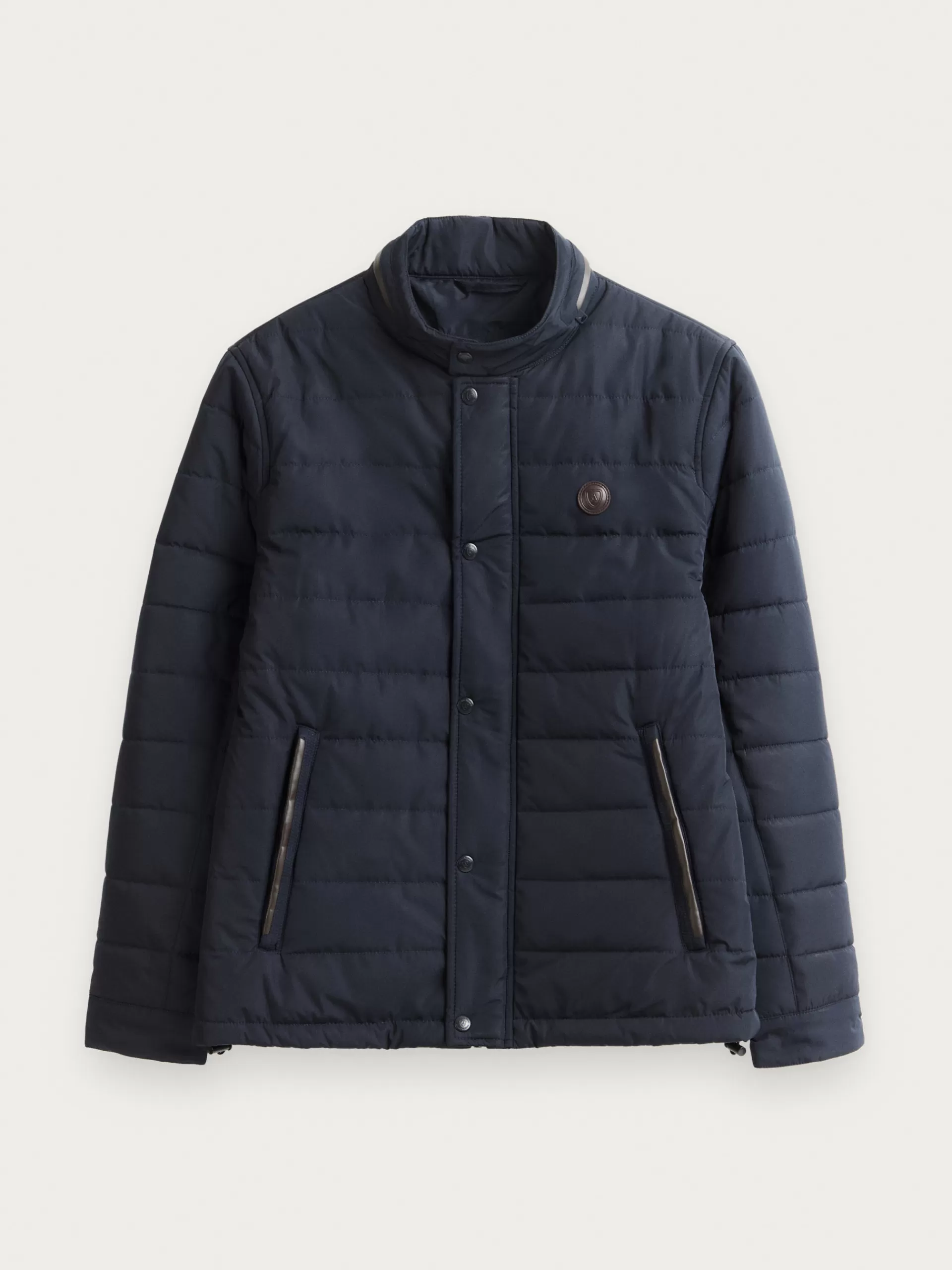 Cazadora acolchada con cuello subido y cremallera decorativa. Cuenta con cierre central de cremallera oculta por tapeta de botones a presión, manga larga con puños ajustables y dos bolsillos en la cintura. Parche en el pecho con el logo de la marca.