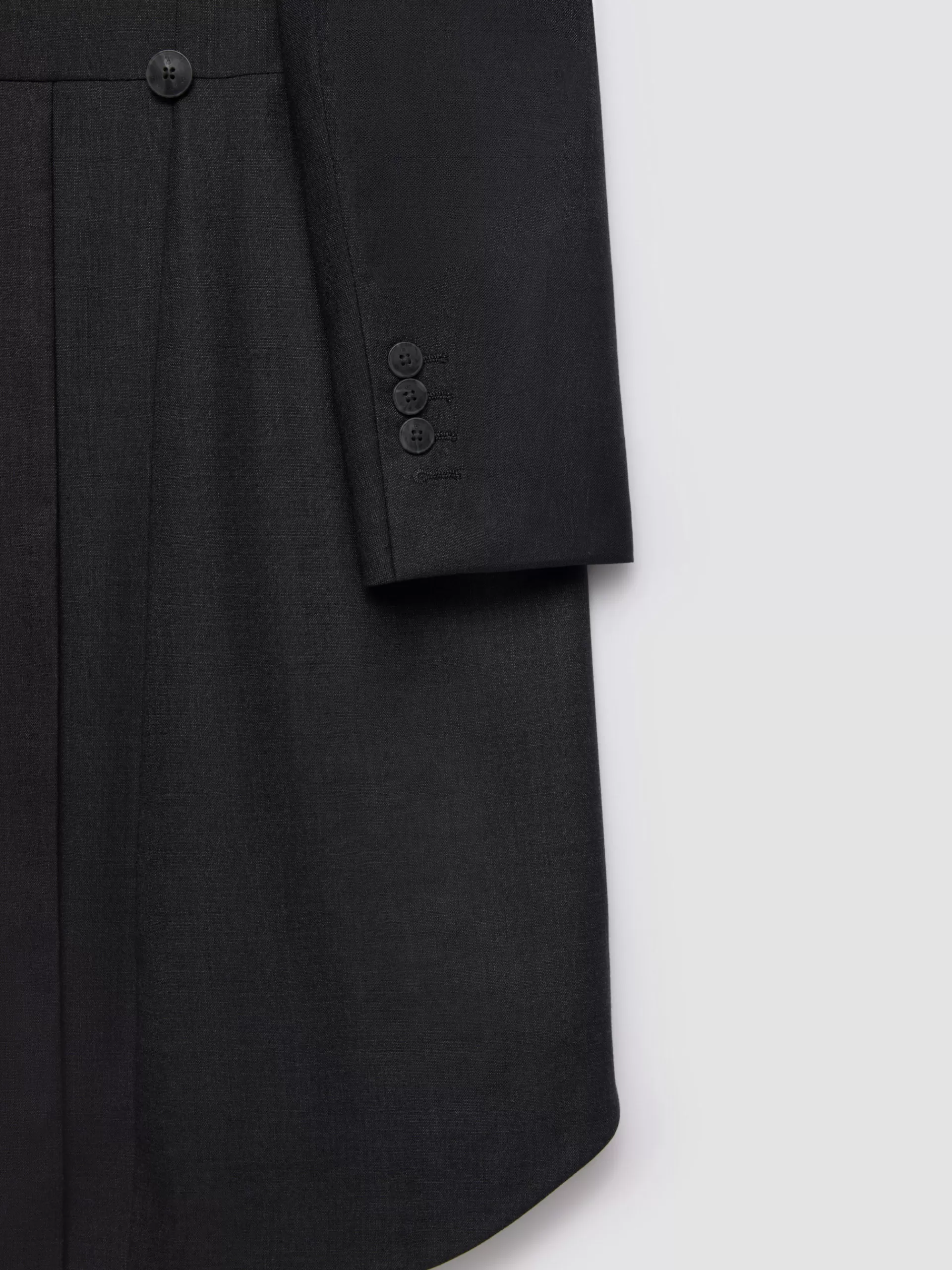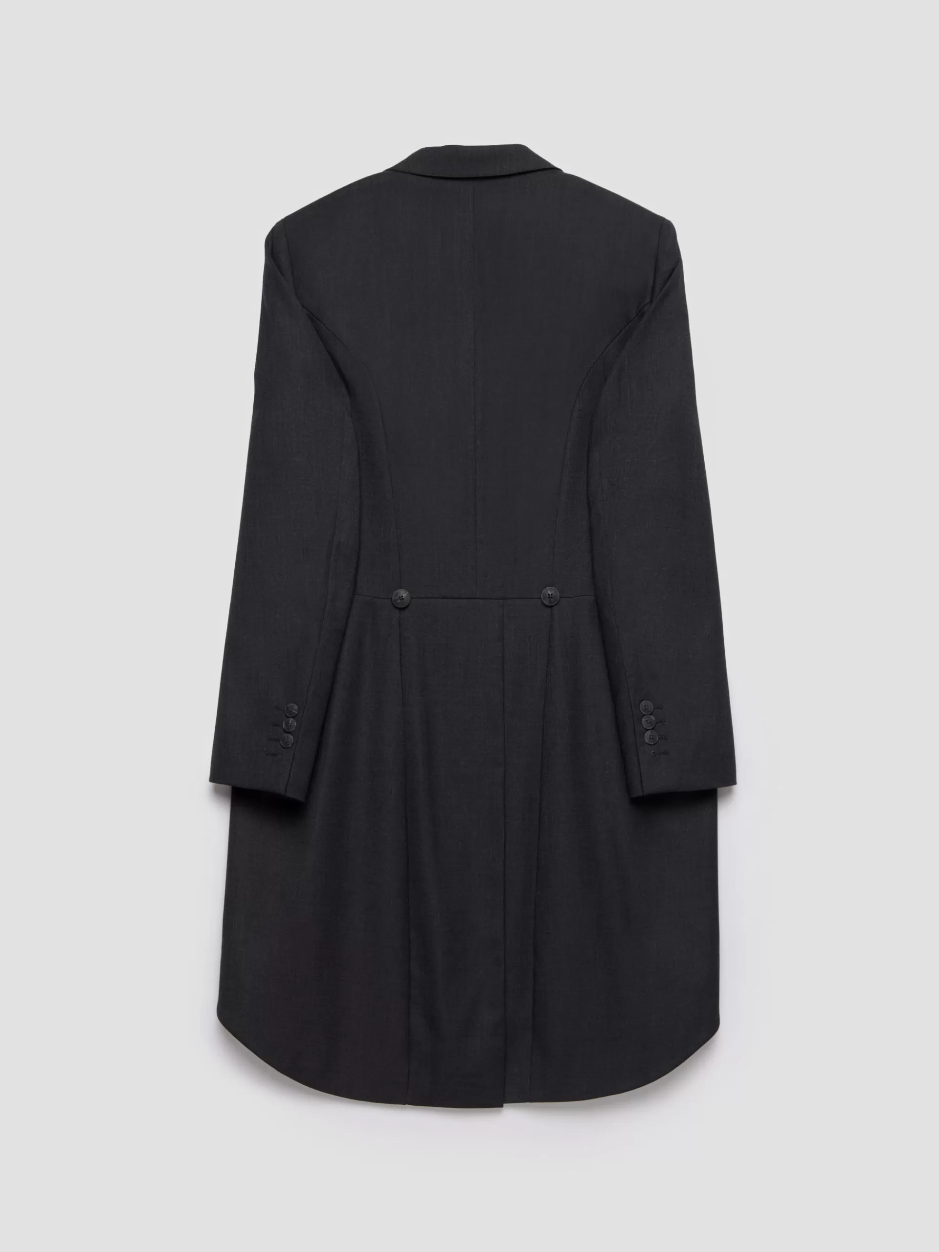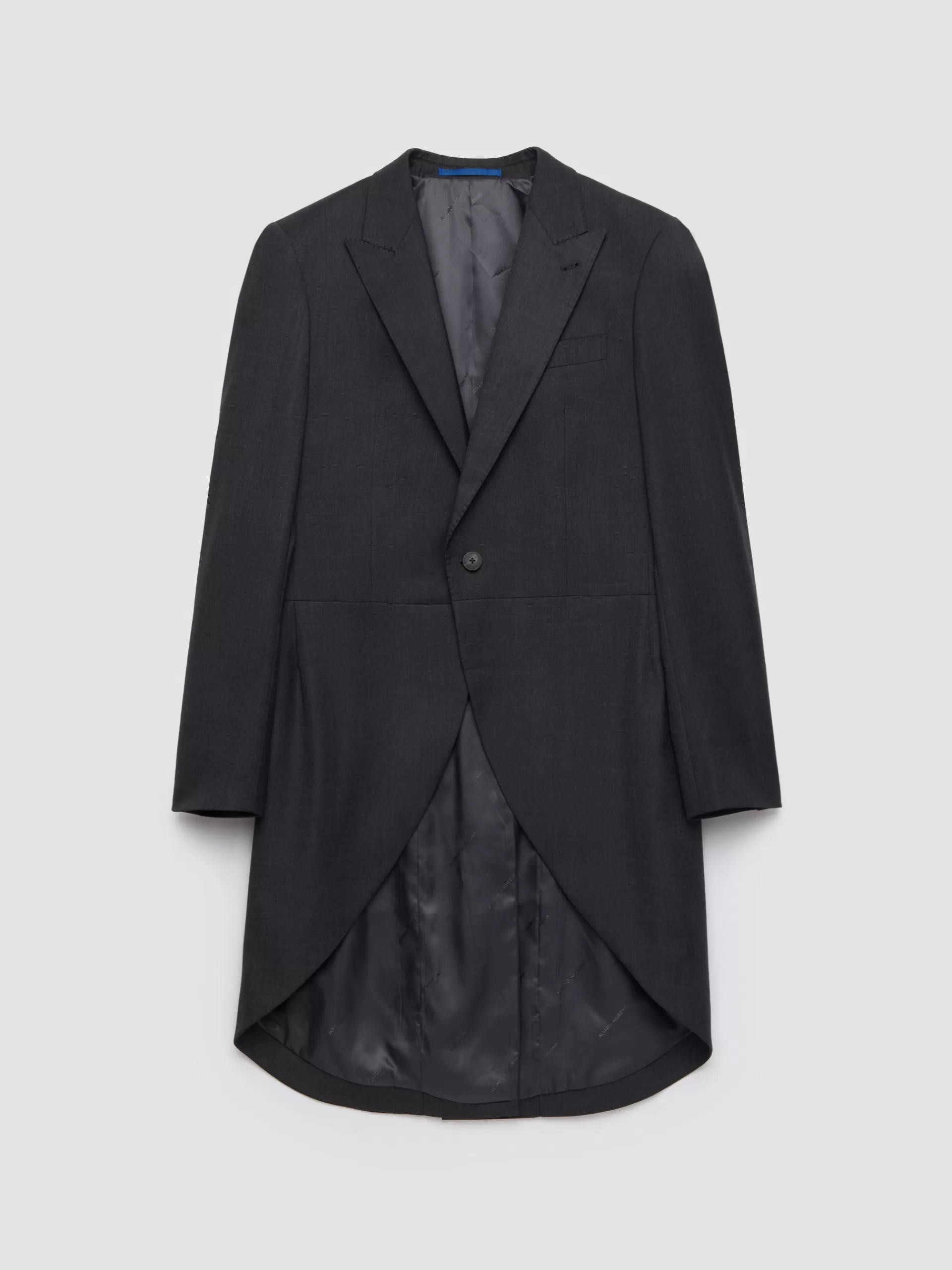 Levita clásico de un conjunto de dos piezas. Cuenta con cuello y solapa, cierre central mediante botonadura, bolsillo de ojal en el pecho, manga larga con botones en los puños, abertura en la espalda y forrada en su interior con bolsillos.