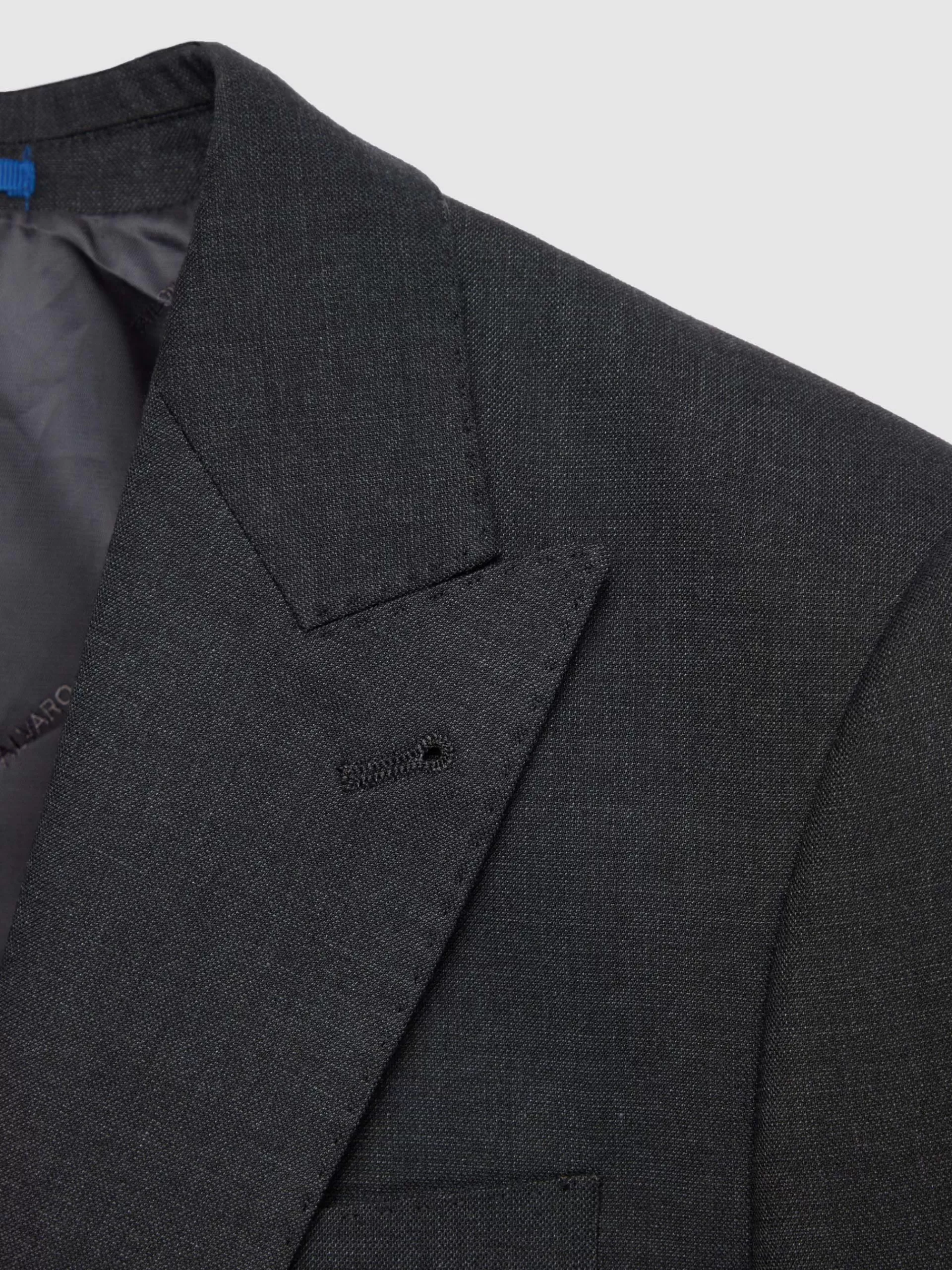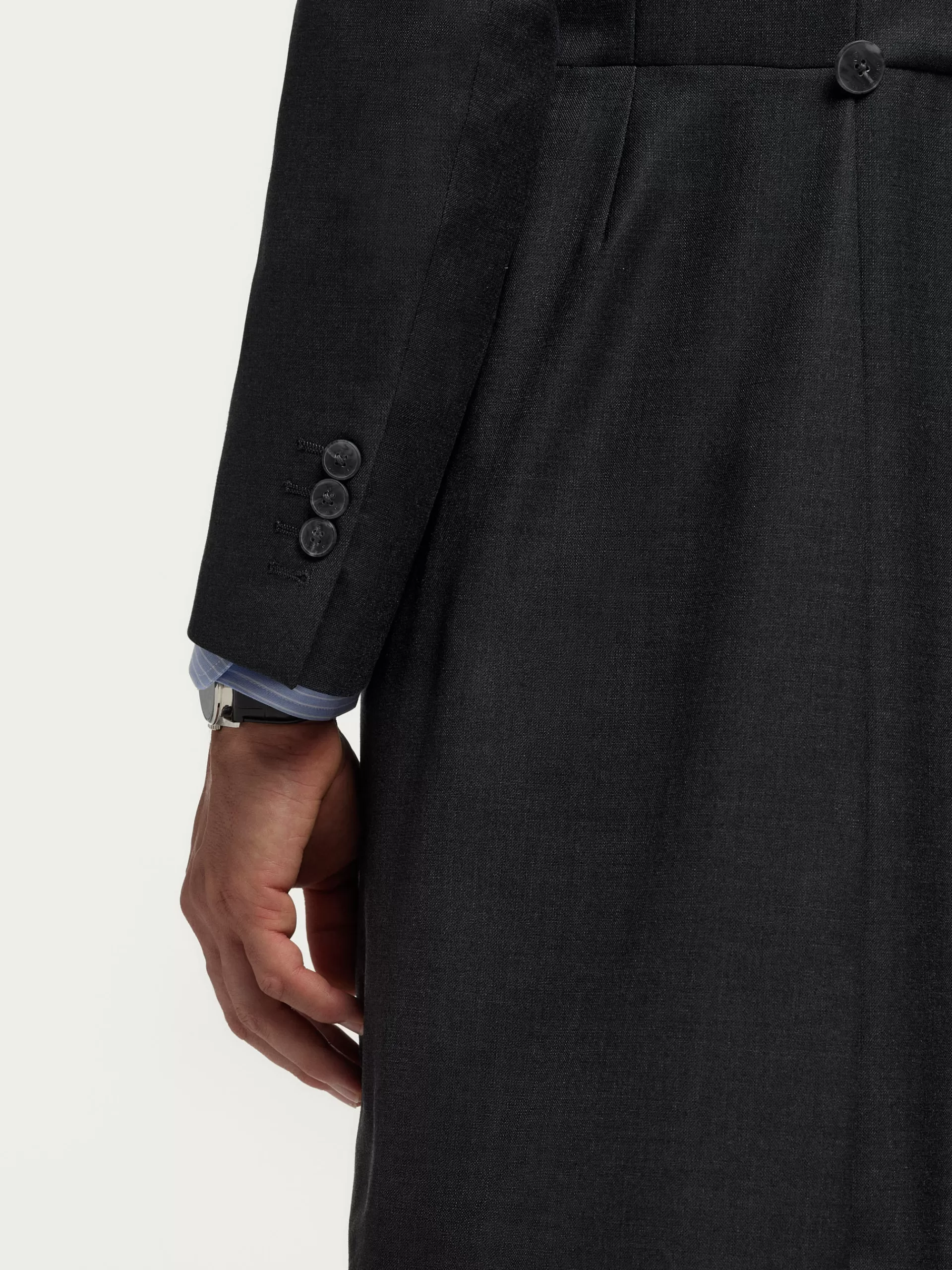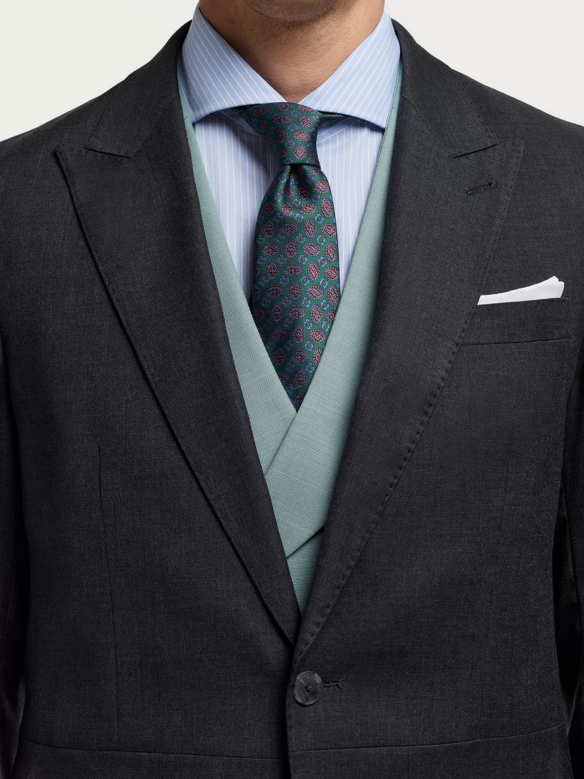 Levita clásico de un conjunto de dos piezas. Cuenta con cuello y solapa, cierre central mediante botonadura, bolsillo de ojal en el pecho, manga larga con botones en los puños, abertura en la espalda y forrada en su interior con bolsillos.
