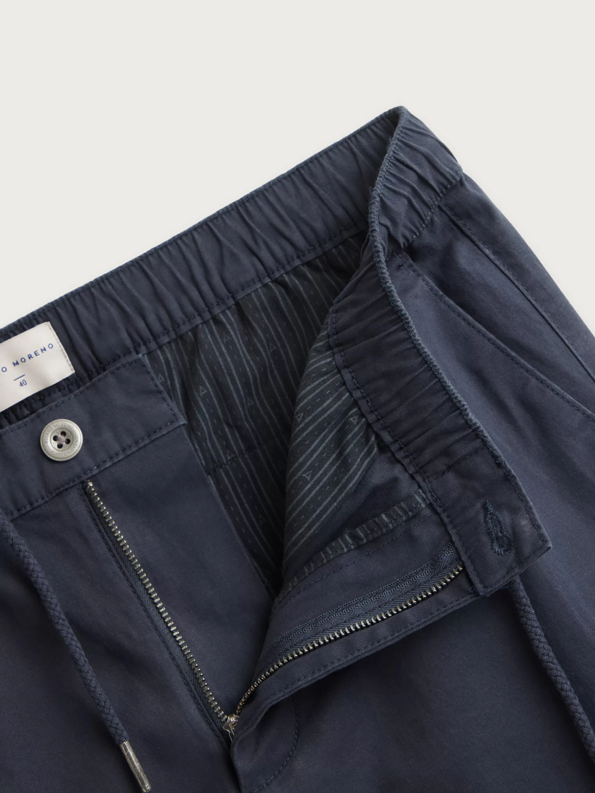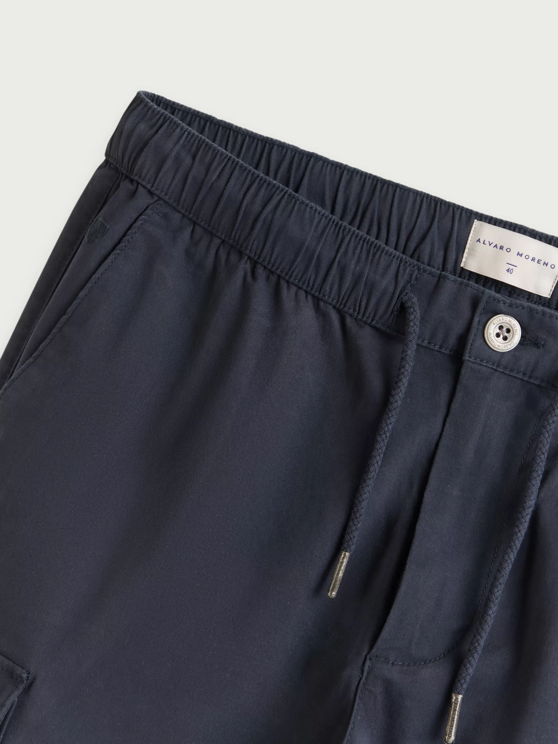 Pantalón cargo con cierre central mediante botón, cremallera y cordón ajustable al tono. Cinturilla elástica, bajo acabado en puño elástico y detalle personalizado en la parte trasera. Dos bolsillos frontales, dos en el lateral con cierre mediante tapeta y botón y dos bolsillos traseros. Corte regular fit.