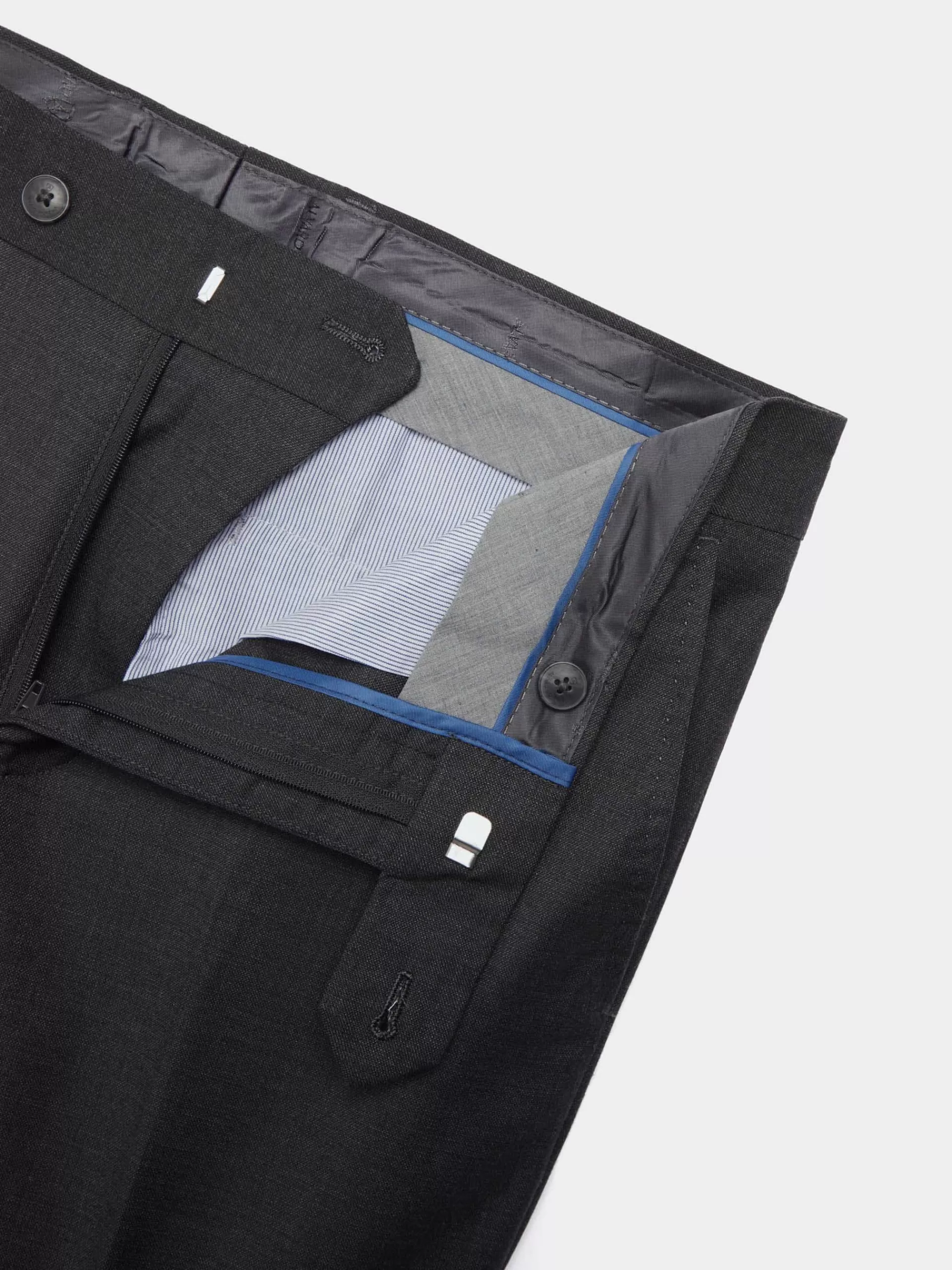 Pantalón en tejido fil fil que cuenta con cierre frontal de cremallera y botones personalizados. Dos bolsillos abiertos en la parte delantera y dos bolsillos traseros con cierre mediante botón. Forrado interiormente.