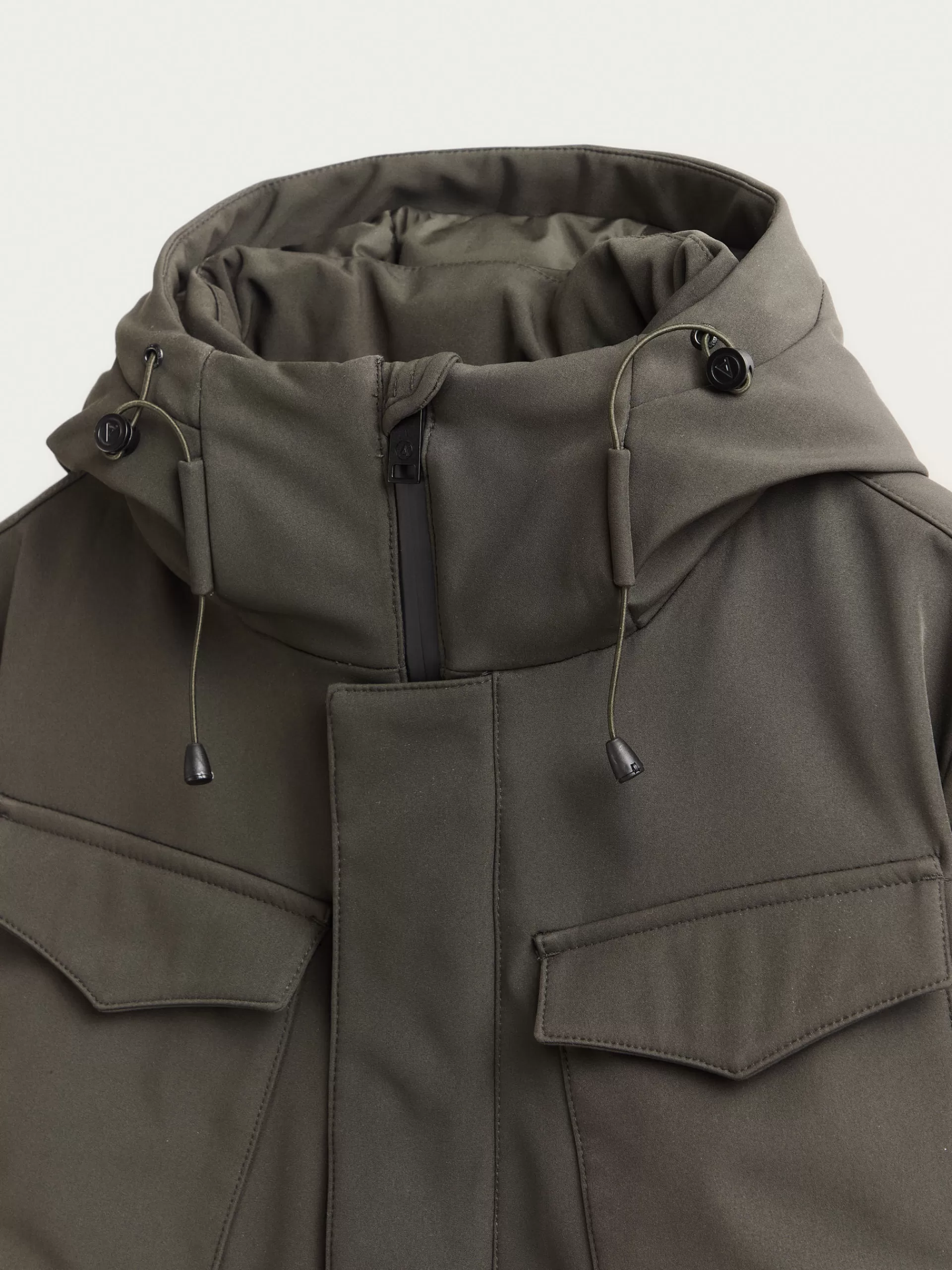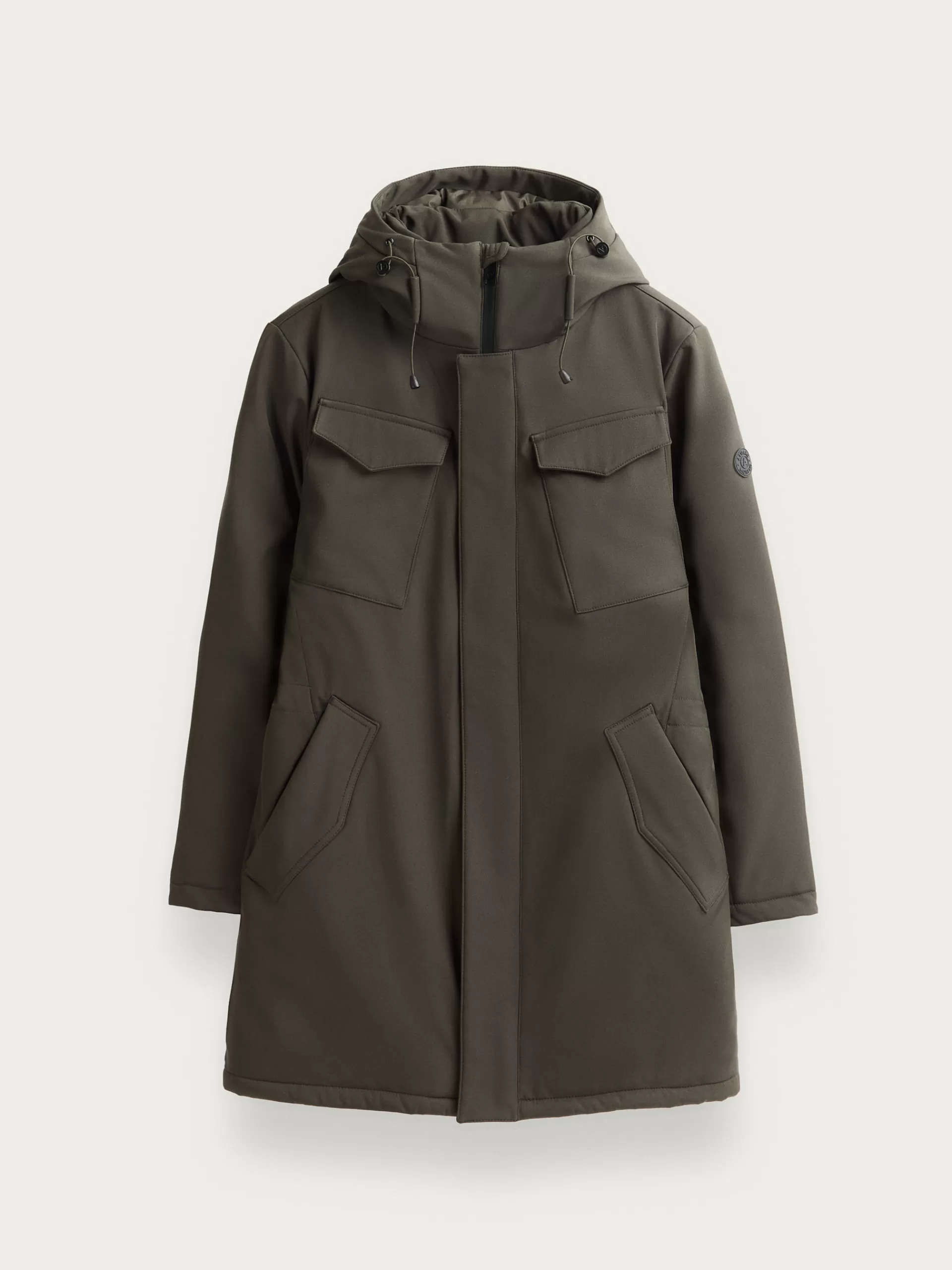 Parka larga con gorro ajustable y cierre central mediante doble cremallera oculta por tapeta de botones a presión. Dos bolsillos a la altura del pecho y dos bolsillos en la cintura. Detalle personalizado en una de sus mangas. Corte regular fit.