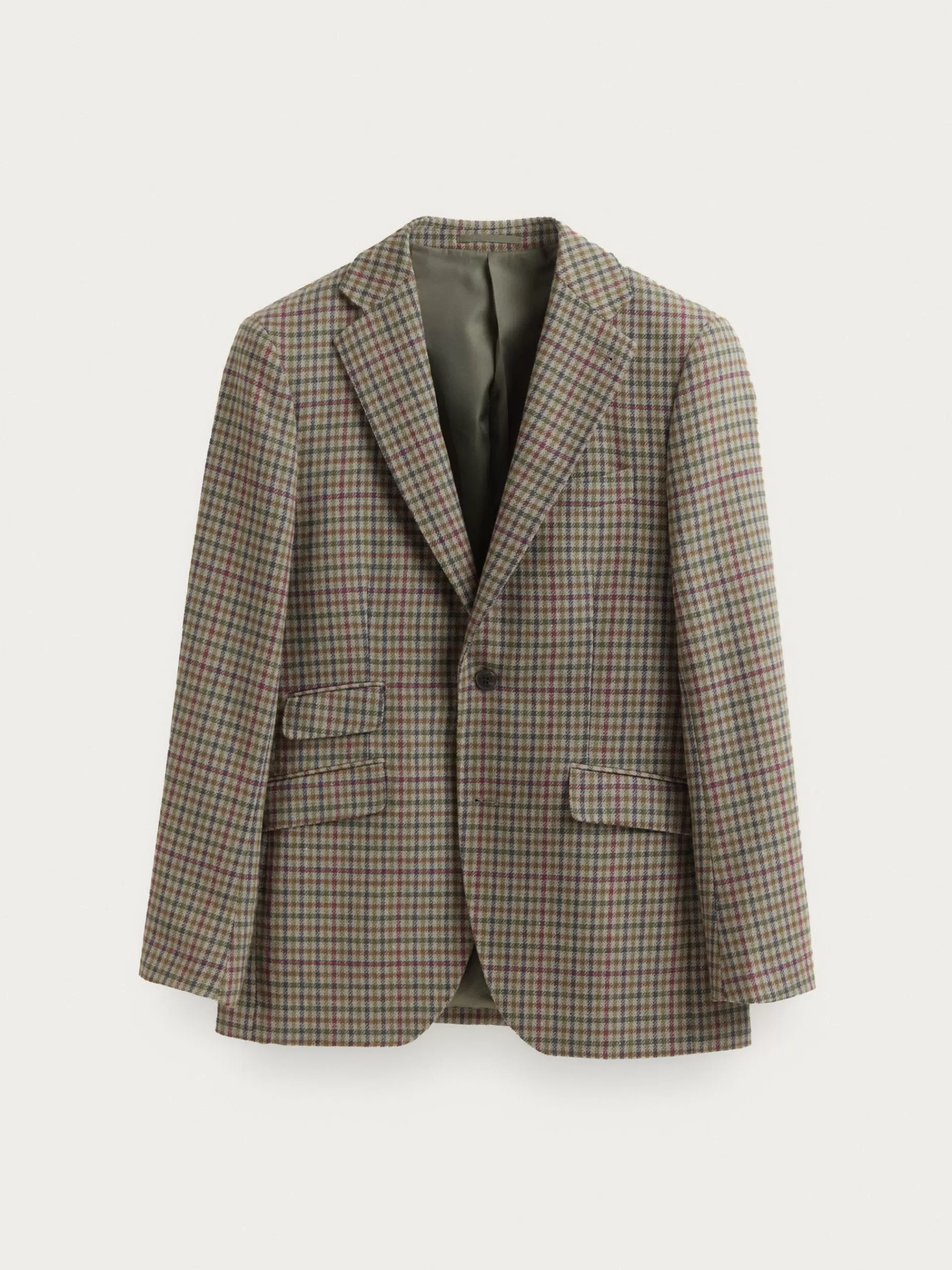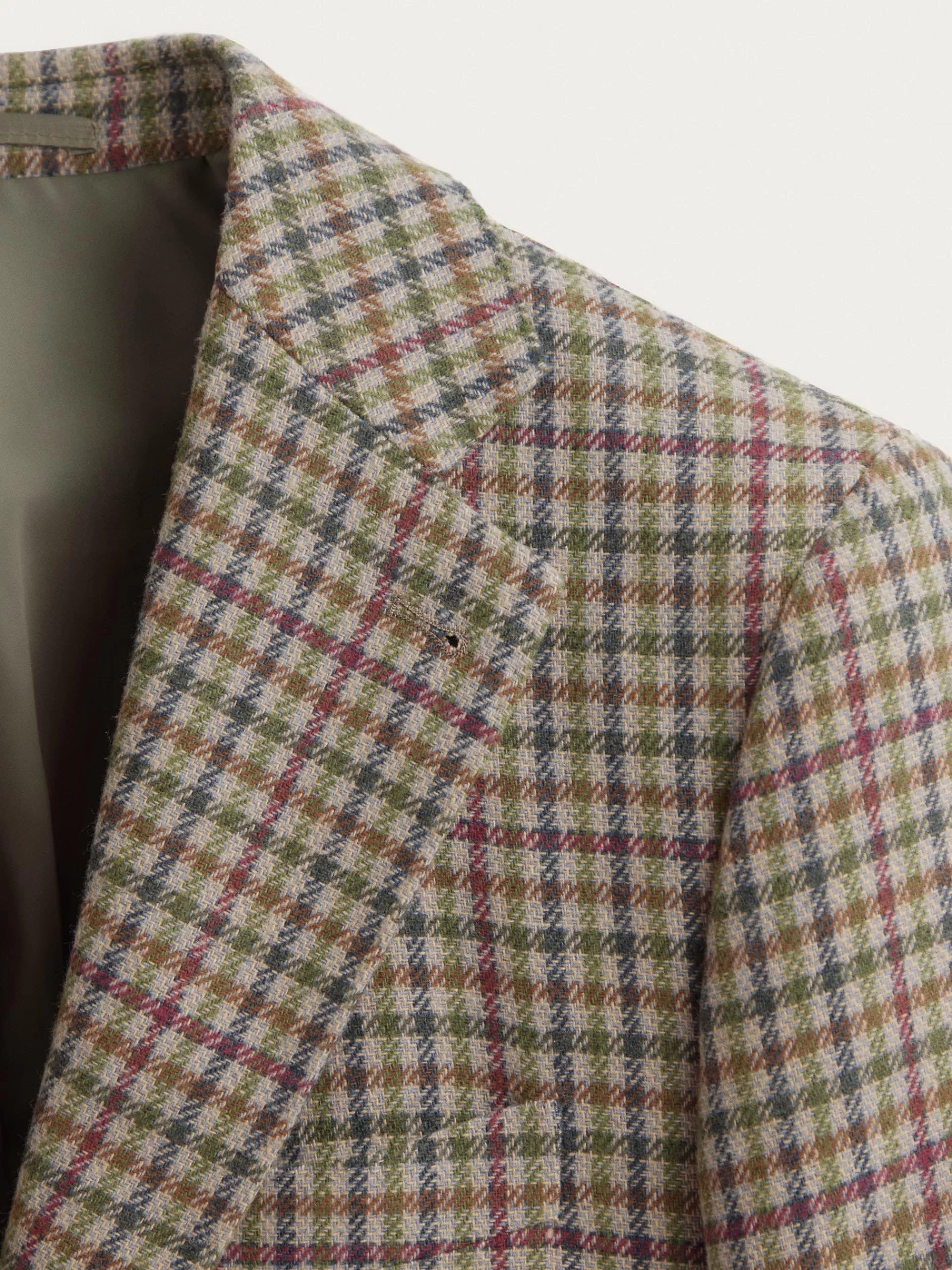 Americana confeccionada en tejido a cuadros de corte slim fit. Cuenta con cuello y solapa, cierre central simple mediante dos botones y puños con botones decorativos. Pinzas en el frontal, tres bolsillos de solapa en la cintura y un bolsillo a la altura del pecho. Interior forrado con dos bolsillos.