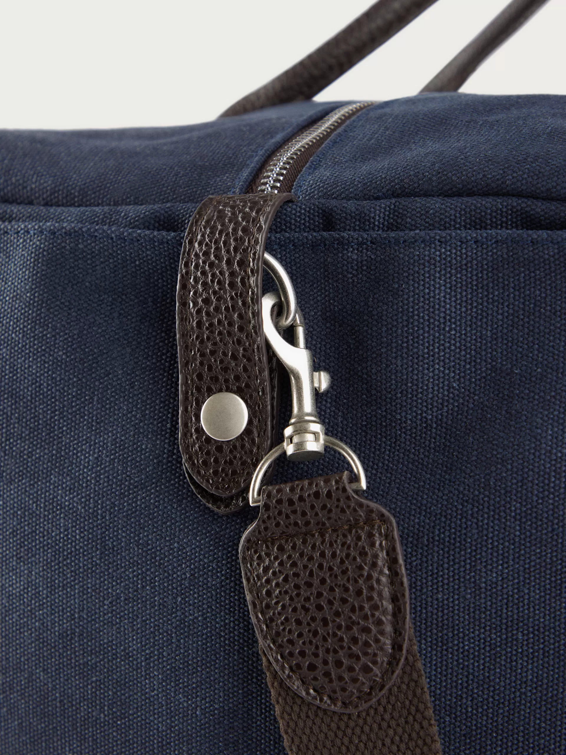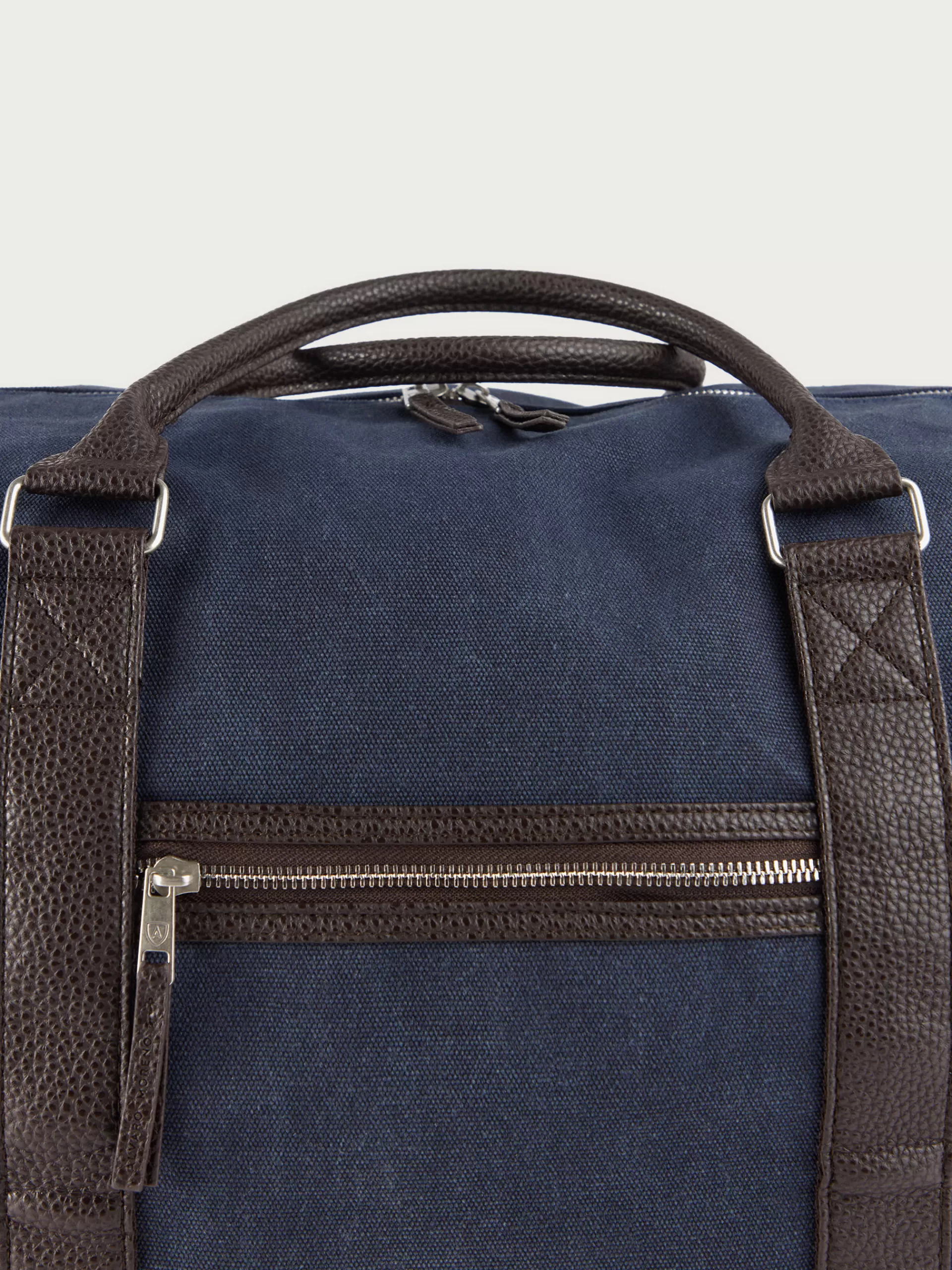 Bolsa de viaje con asas superiores y correa desmontable por mosquetones. Cuenta con un amplio compartimento principal de cierre mediante cremallera, bolsillo interior y uno exterior. Detalles personalizados. Forrado en su interior.
