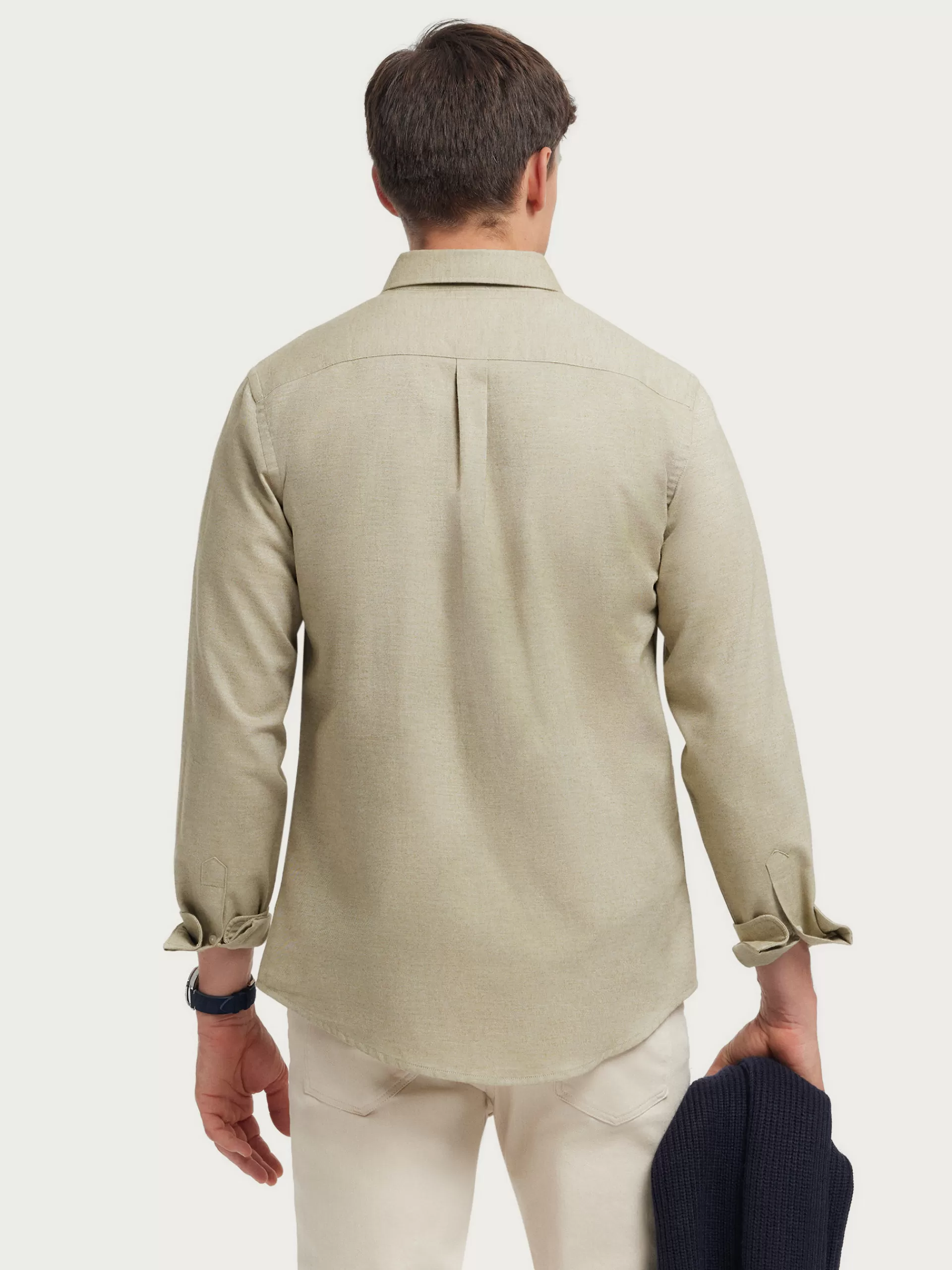 Camisa confeccionada en tejido de franela con cuello clásico de botón, manga larga con puños simples y logo de marca grabado en el frontal. Corte regular fit.
