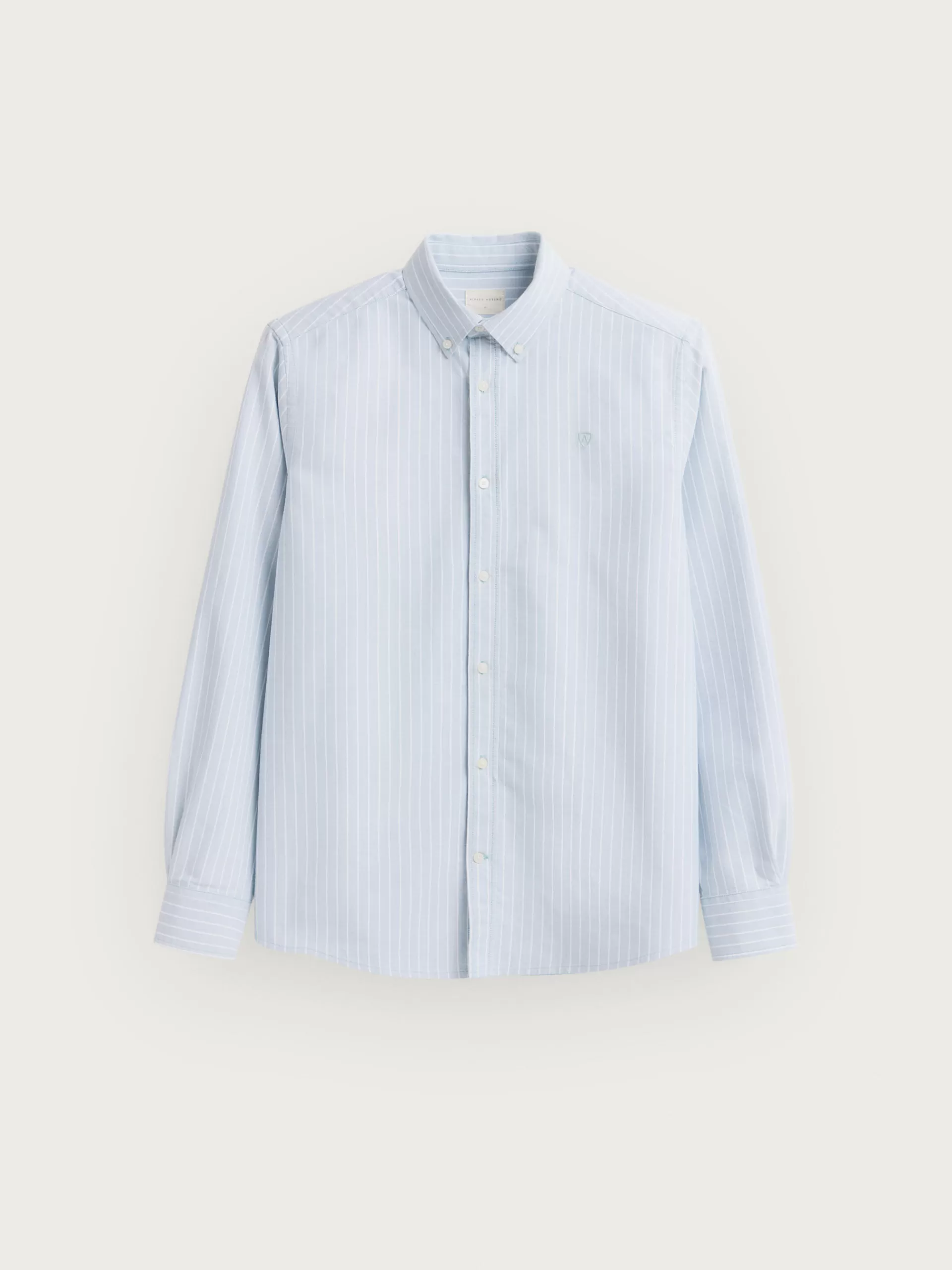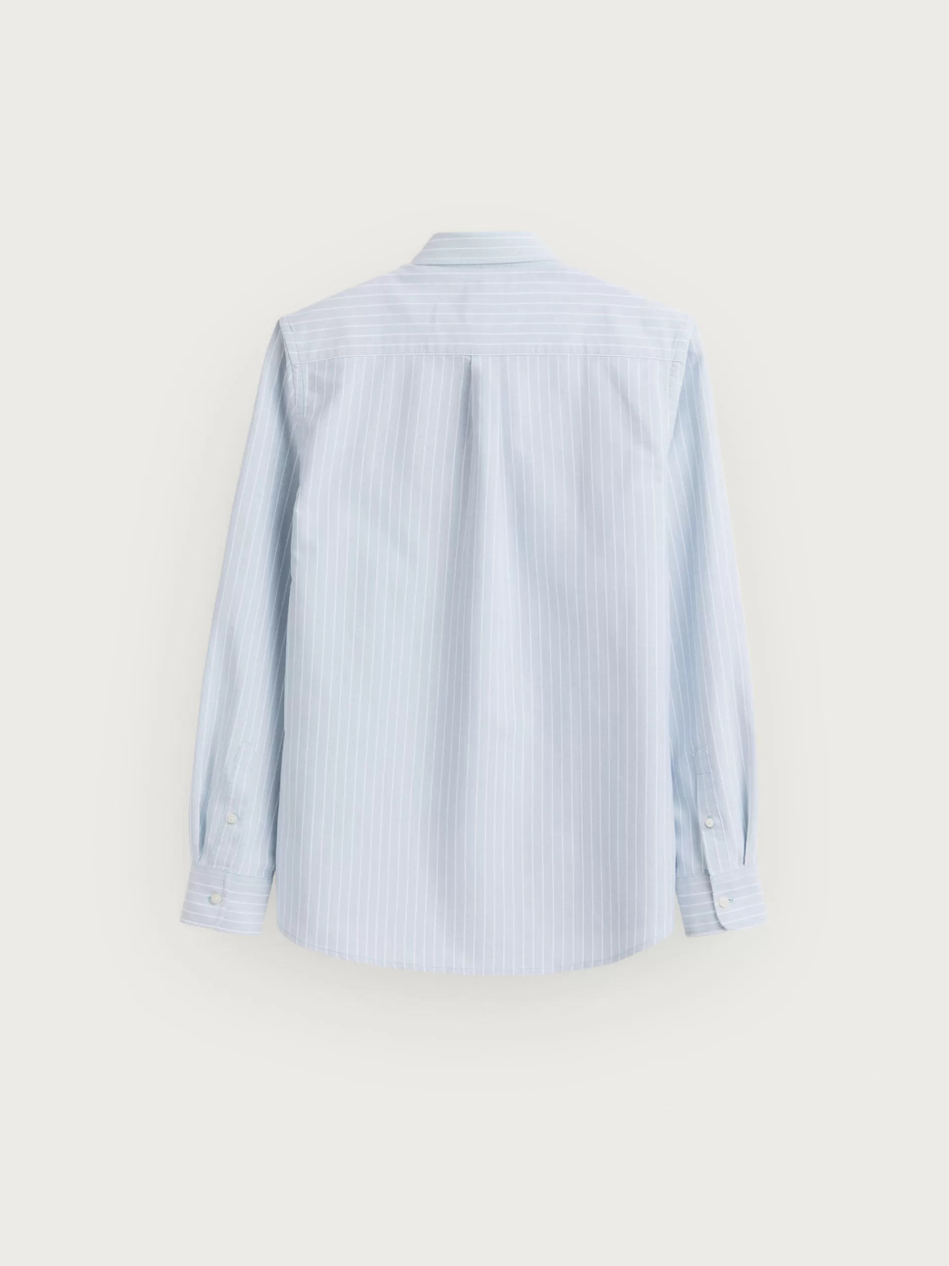 Camisa a rayas confeccionada en algodón con cuello clásico de botón, manga larga con puños simples y logo de la marca grabado en el frontal al tono. Corte regular fit.
