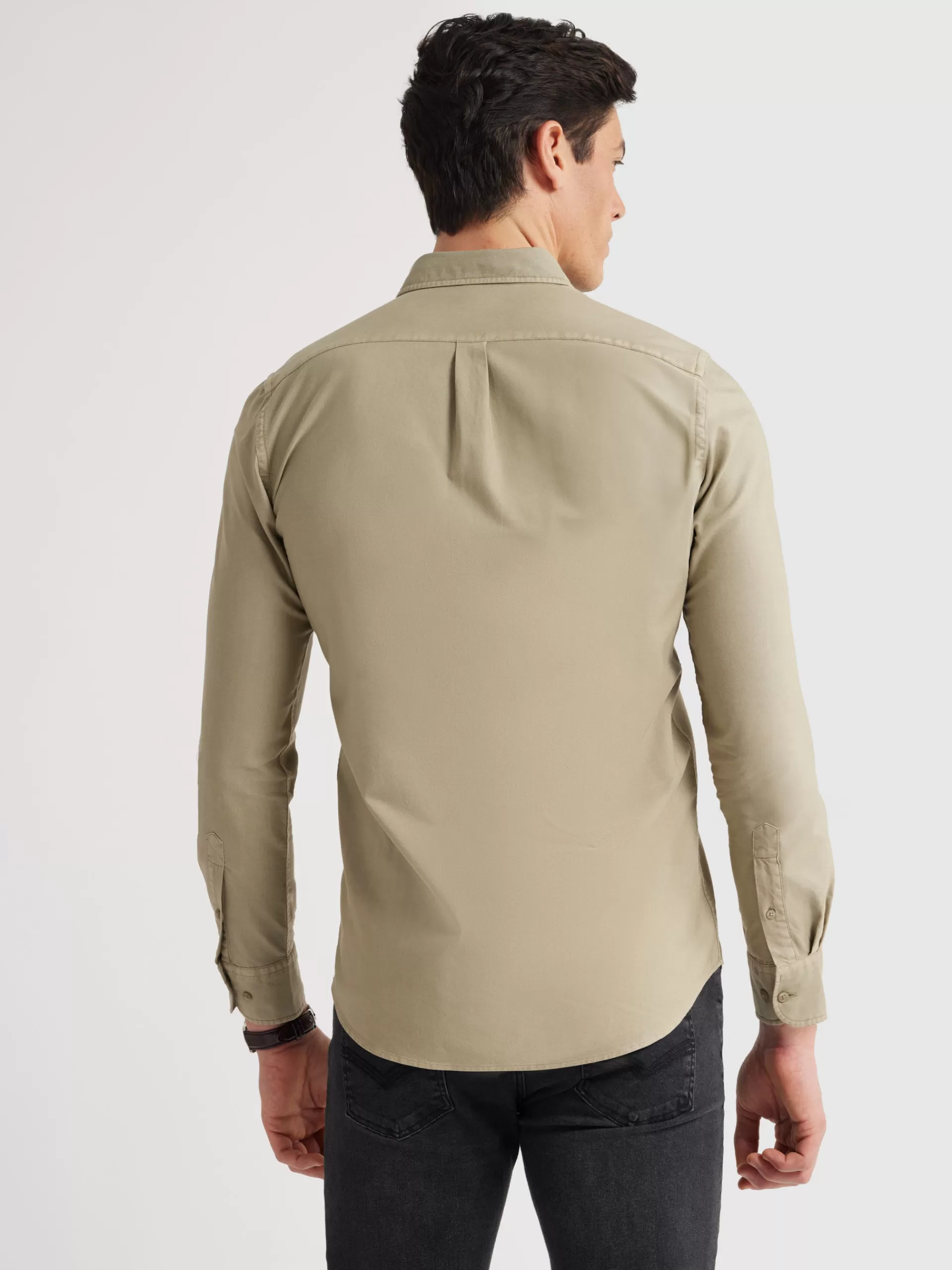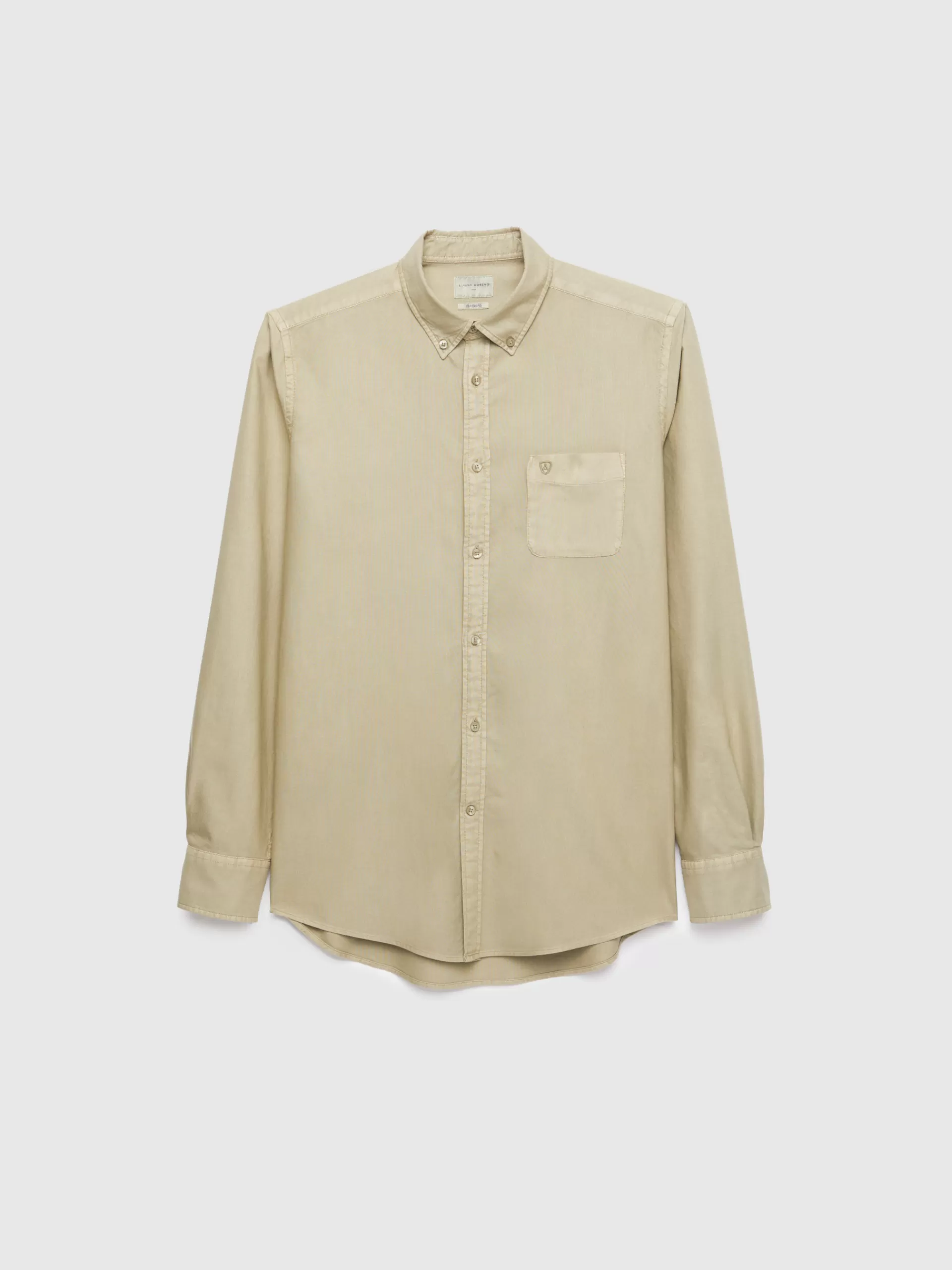 Camisa confeccionada en algodón con cuello clásico de botón, bolsillo en el frontal y manga larga de puños simples. Corte regular fit.