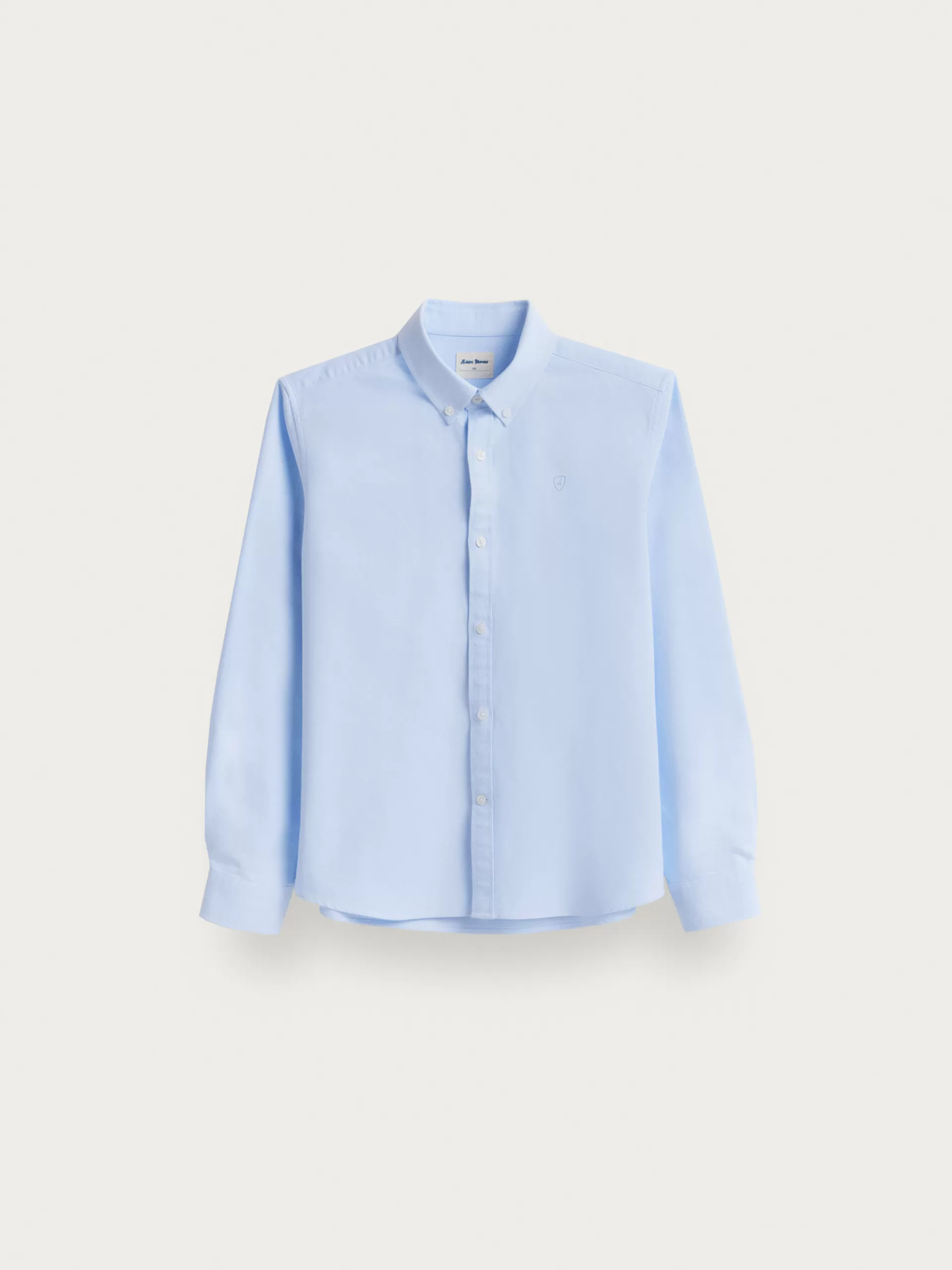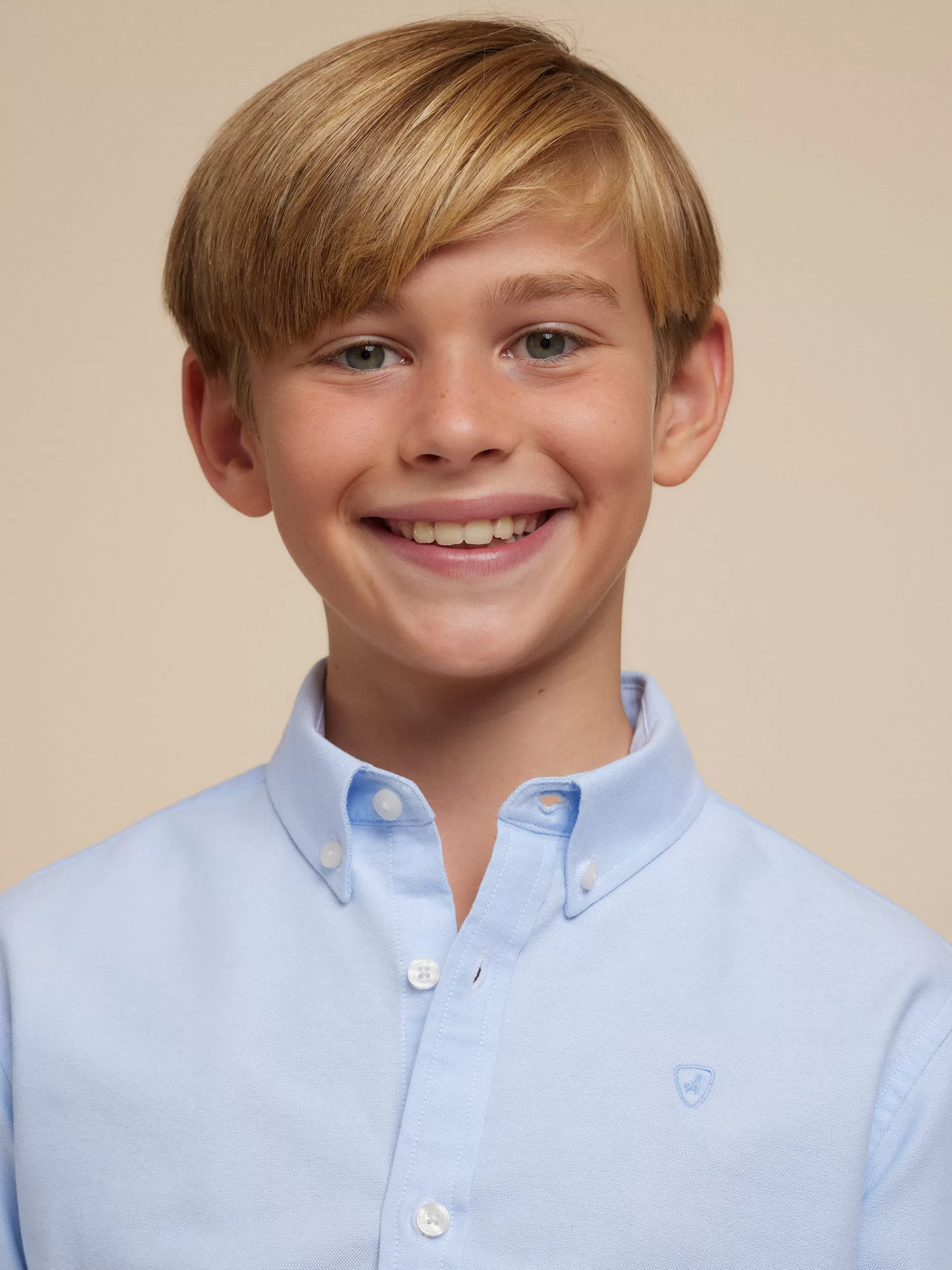 Camisa de corte regular fit con cuello clásico de botón, manga larga con puños simples y logo de la marca grabado en el frontal al tono.
