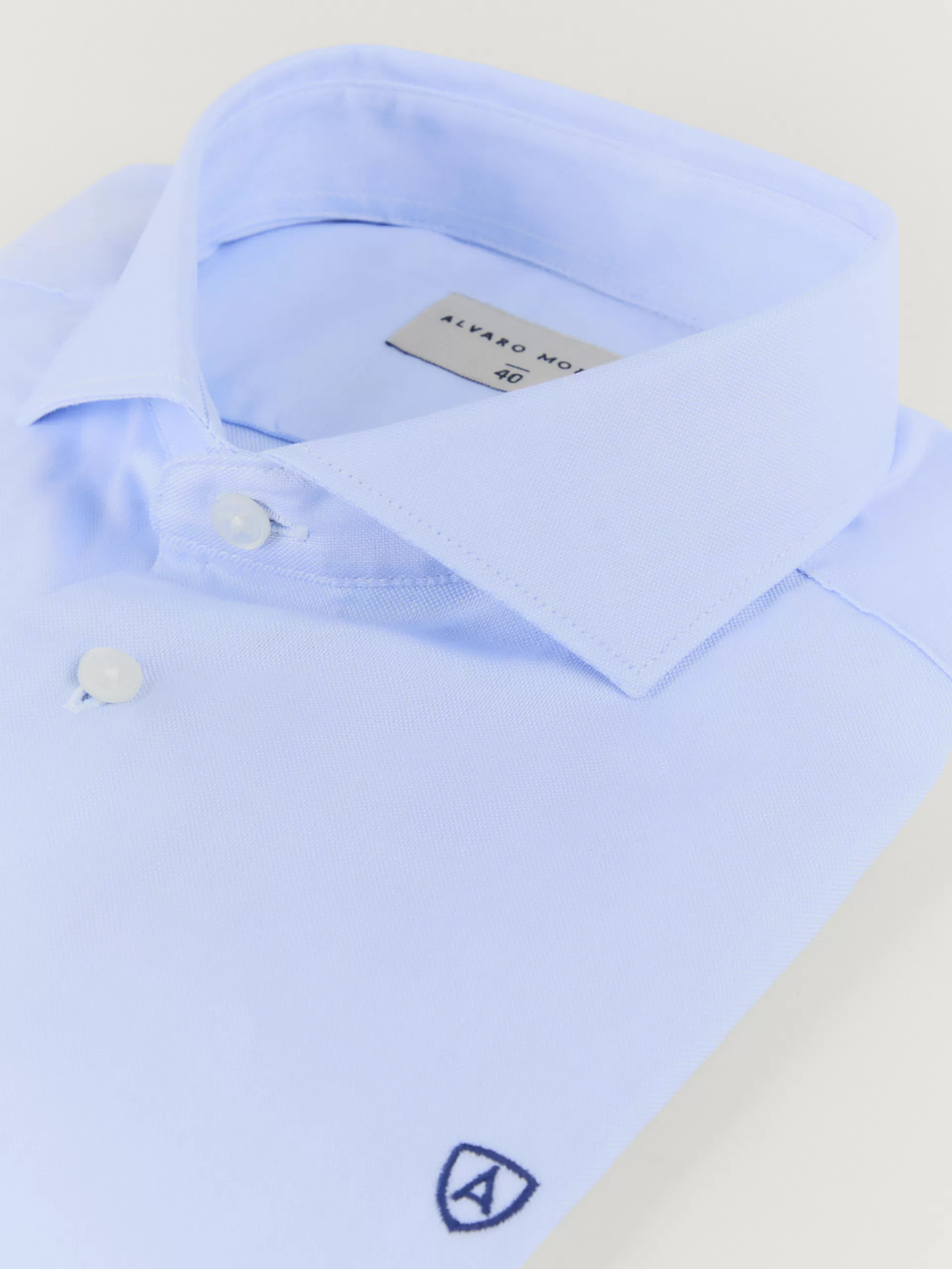 Camisa de vestir de corte slim fit. Cuenta con una ligera estructura en su tejido, cuello italiano y manga larga con puños dobles para gemelos. Logo de la marca grabado al tono en el frontal.