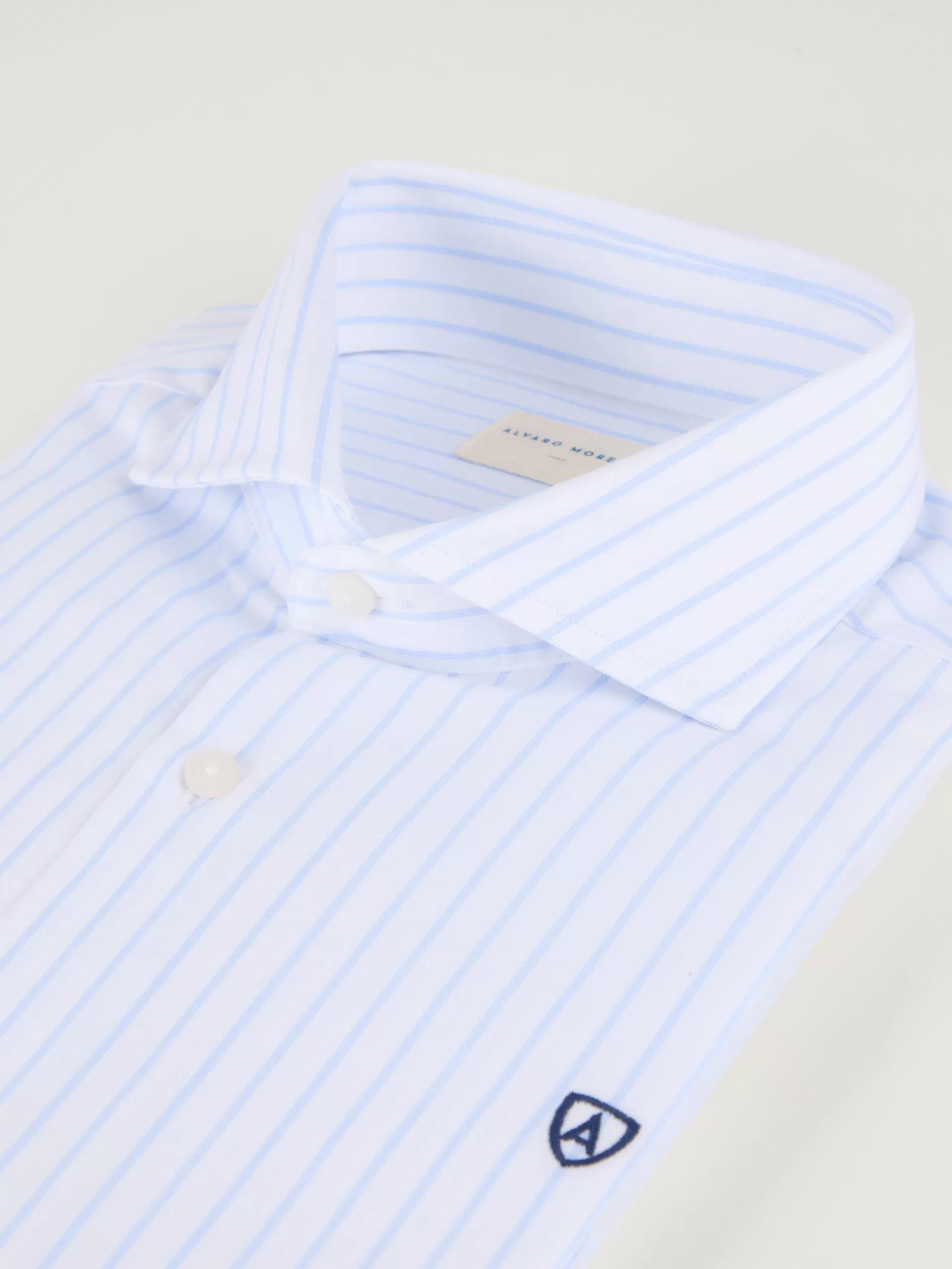 Camisa de vestir a rayas confeccionada en algodón. Cuenta con cuello italiano, manga larga con puños simples y logo de la marca grabado en el frontal. Corte slim fit.