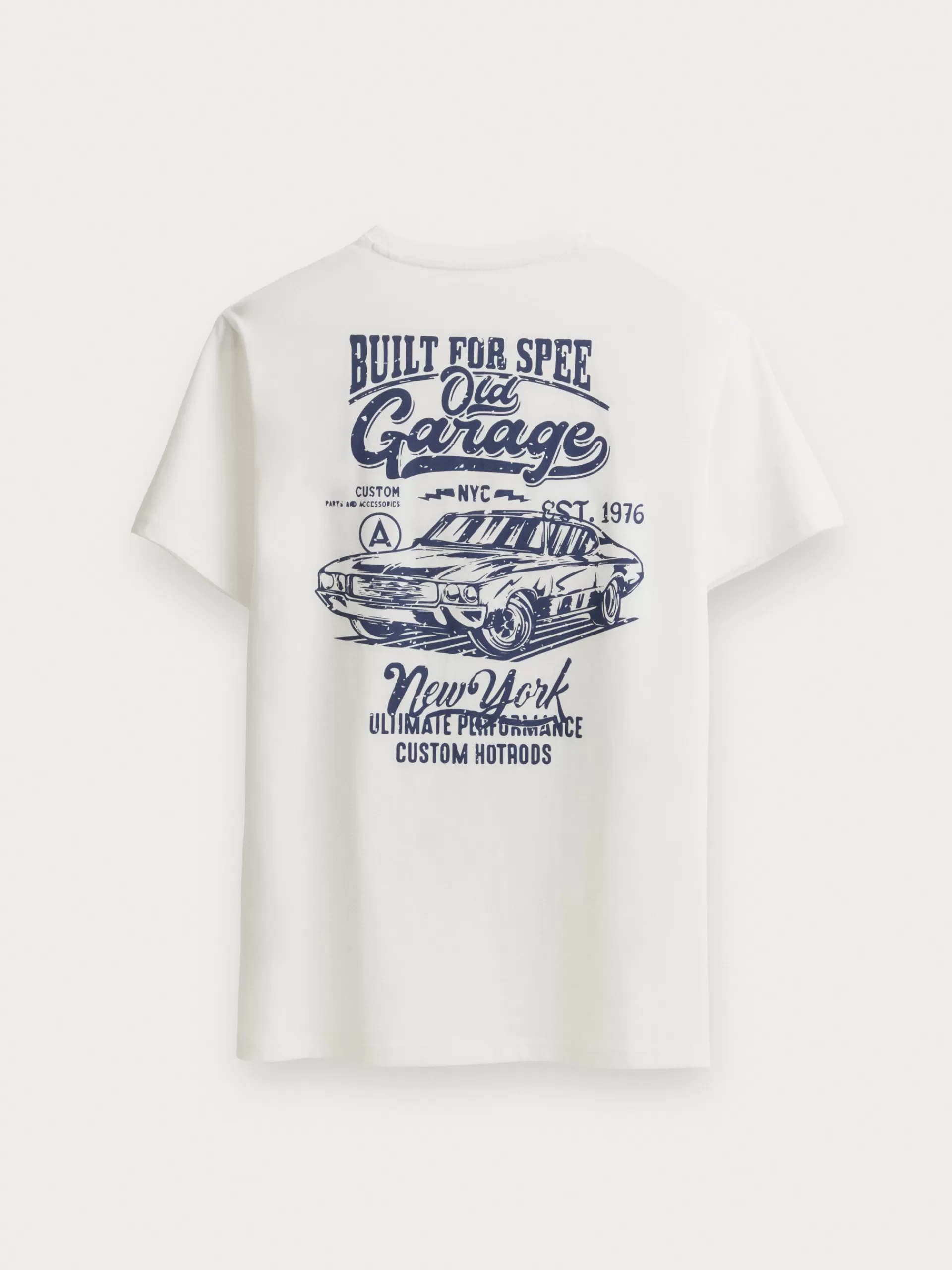 Camiseta con estampado personalizado a contraste en el frontal y en la espalda. Cuenta con cuello redondo, manga corta y corte regular fit.