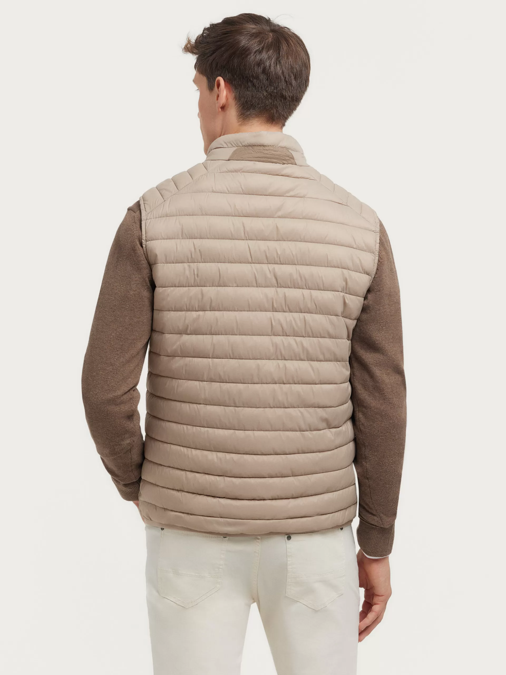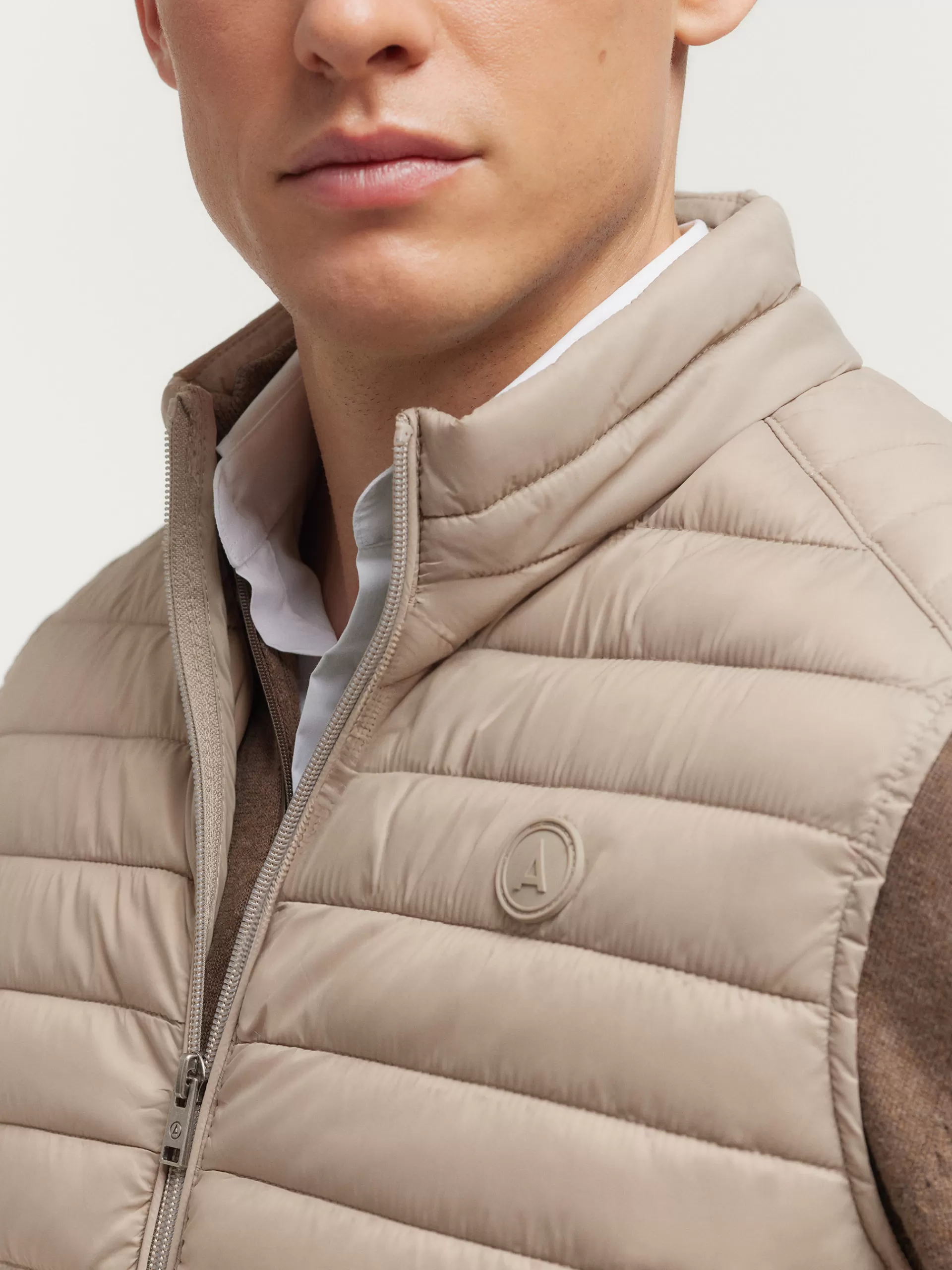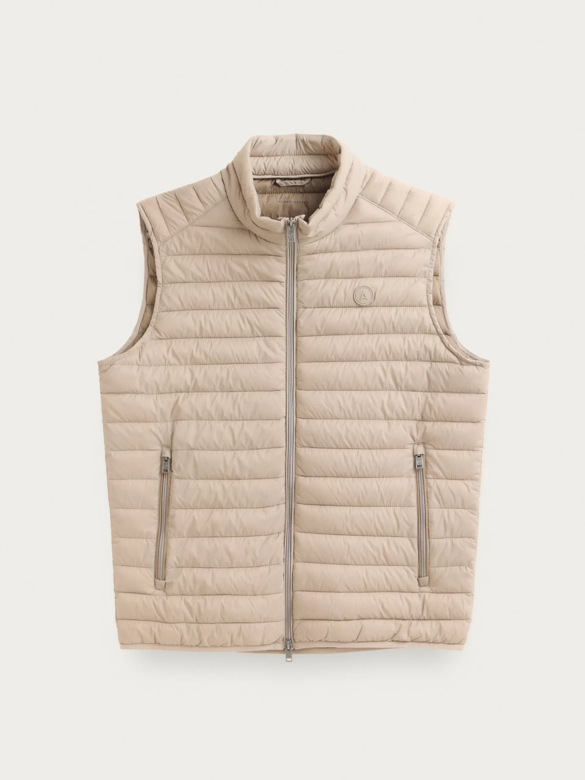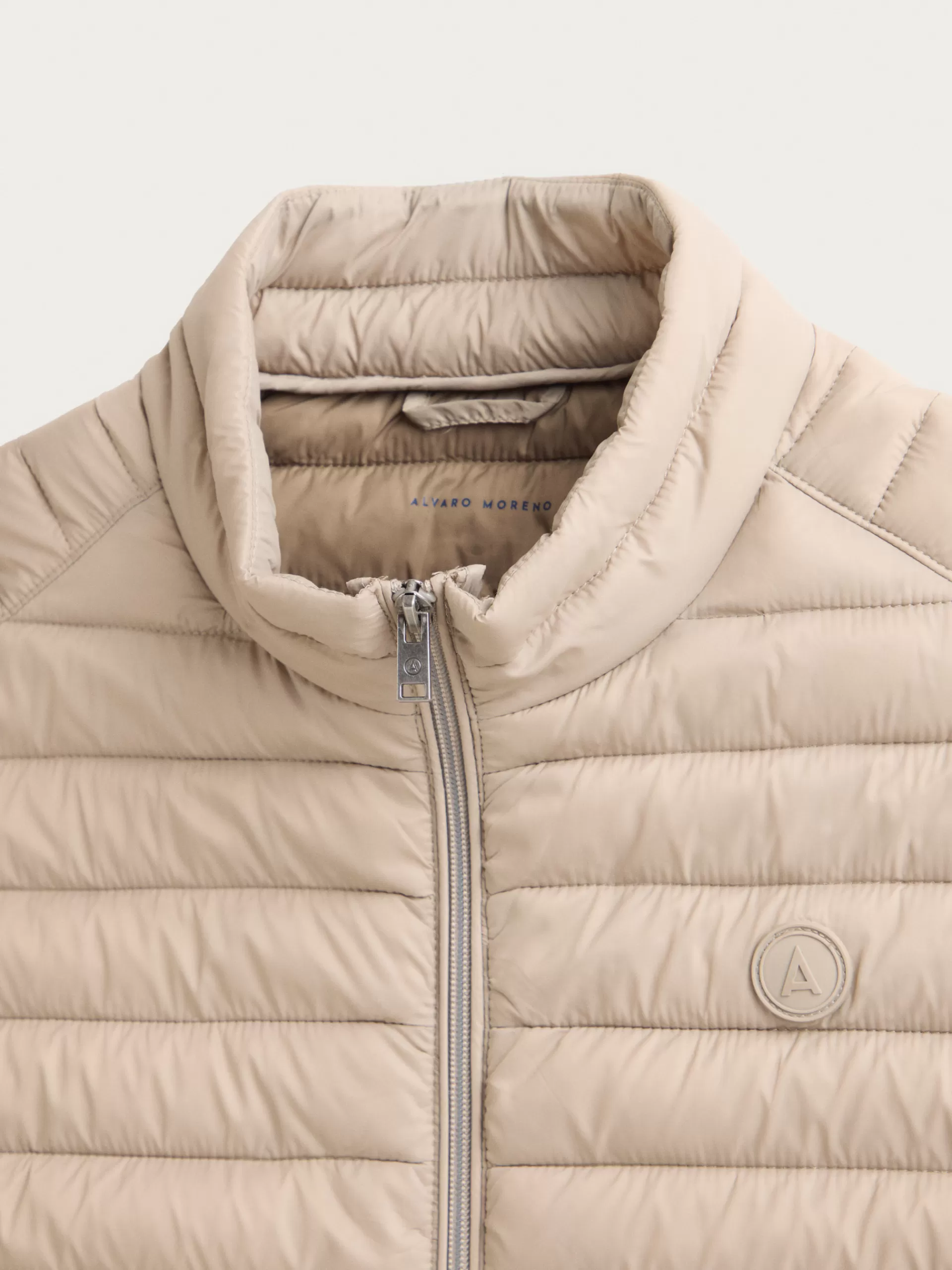 Chaleco acolchado con cuello subido. Cierre central mediante doble cremallera, dos bolsillo a la altura de la cintura y logo de la marca grabado en el pecho. Elástico en la sisa y cintura. Detalle a contraste en la parte trasera del cuello.