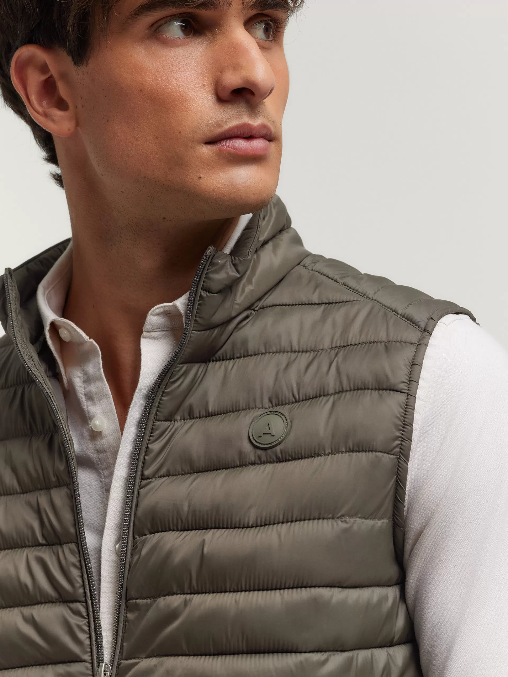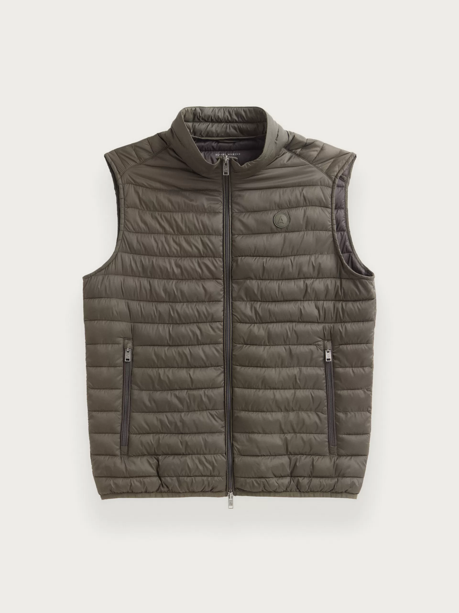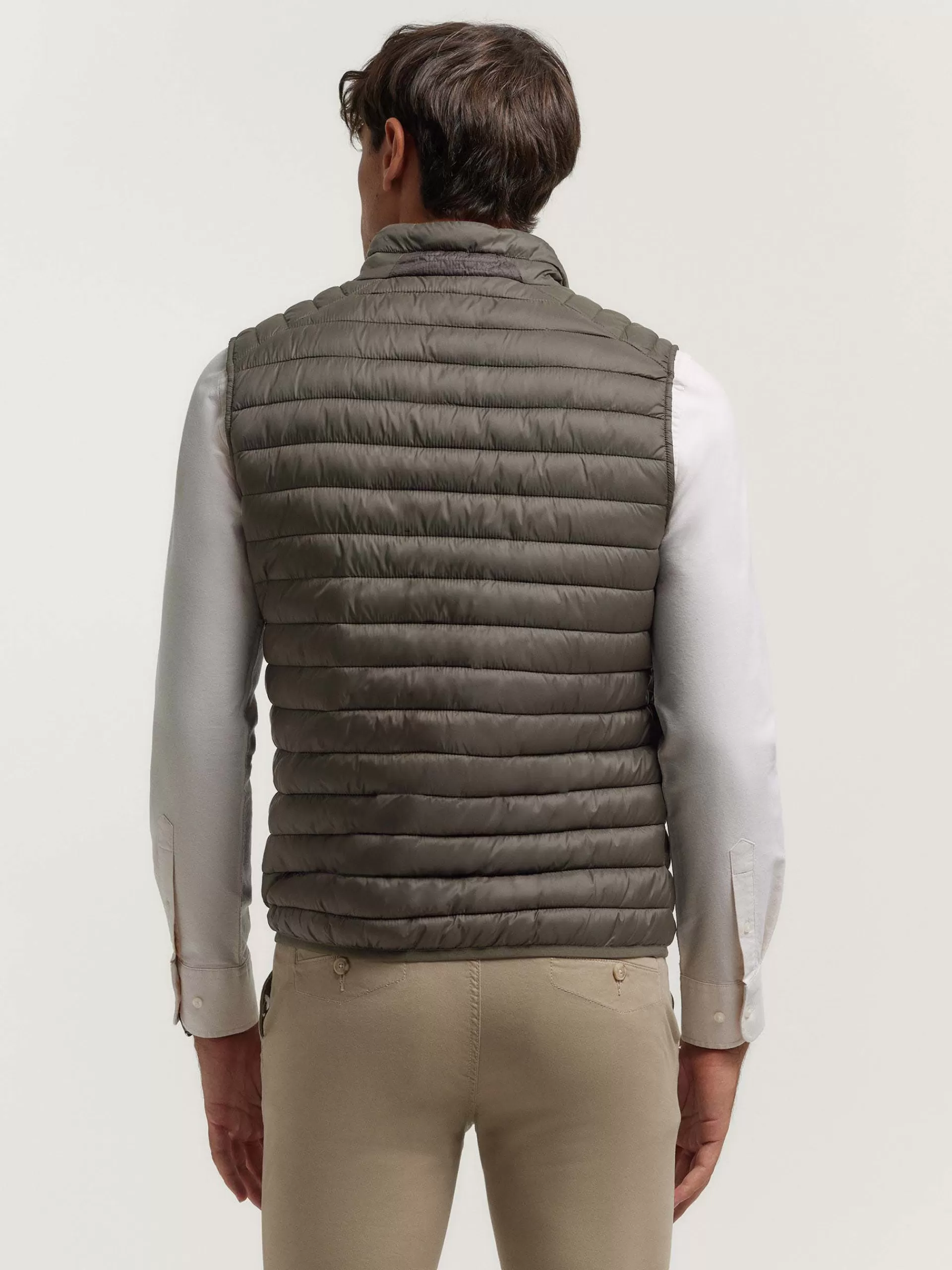 Chaleco acolchado con cuello subido. Cierre central mediante doble cremallera, dos bolsillo a la altura de la cintura y logo de la marca grabado en el pecho. Elástico en la sisa y cintura. Detalle a contraste en la parte trasera del cuello.