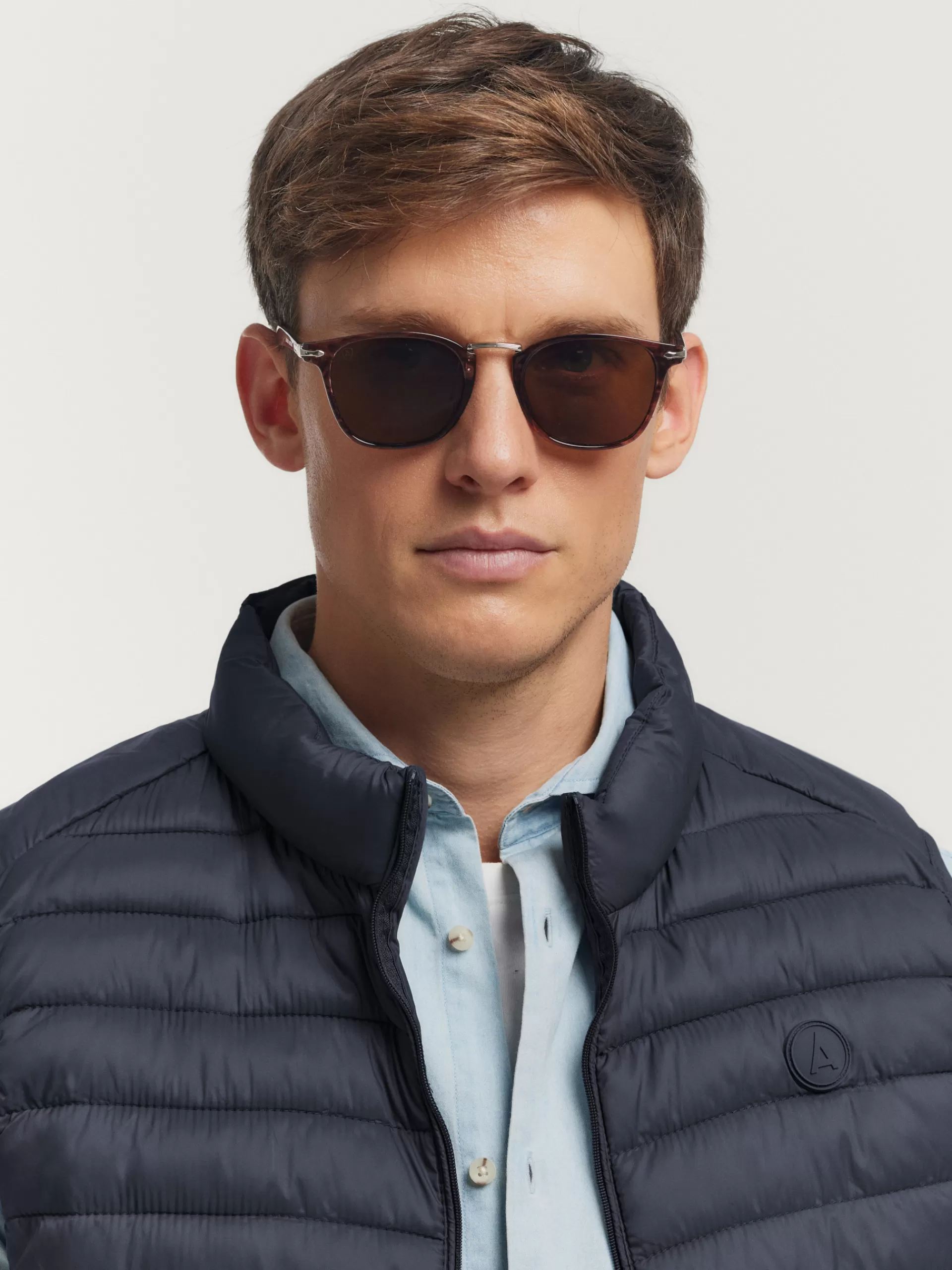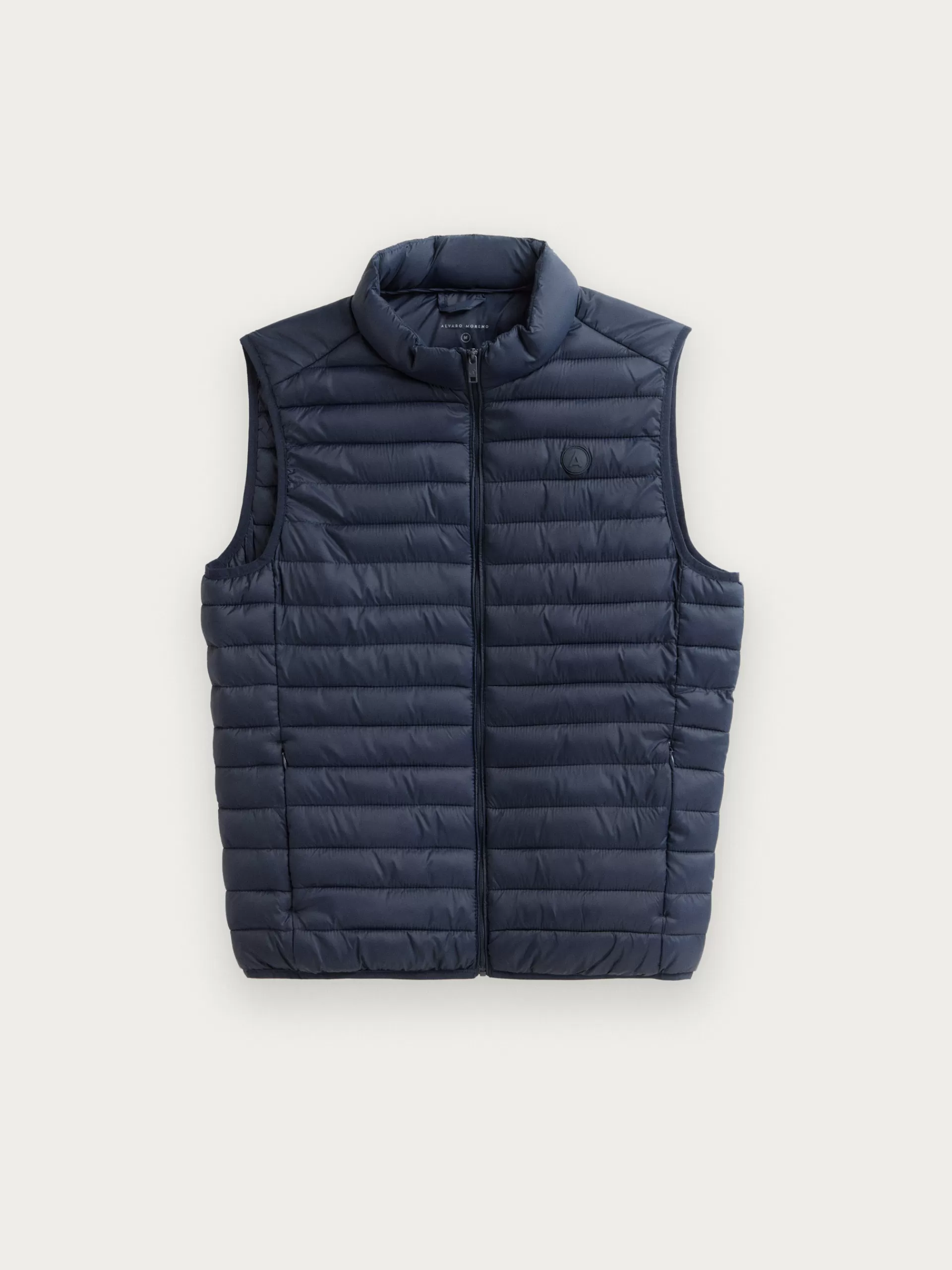 Chaleco acolchado con cuello subido y cierre central mediante cremallera, dos bolsillos a la altura de la cintura y logo de la marca grabado en el pecho. Elástico en la sisa y cintura. Forro interior a contraste con bolsillos.
