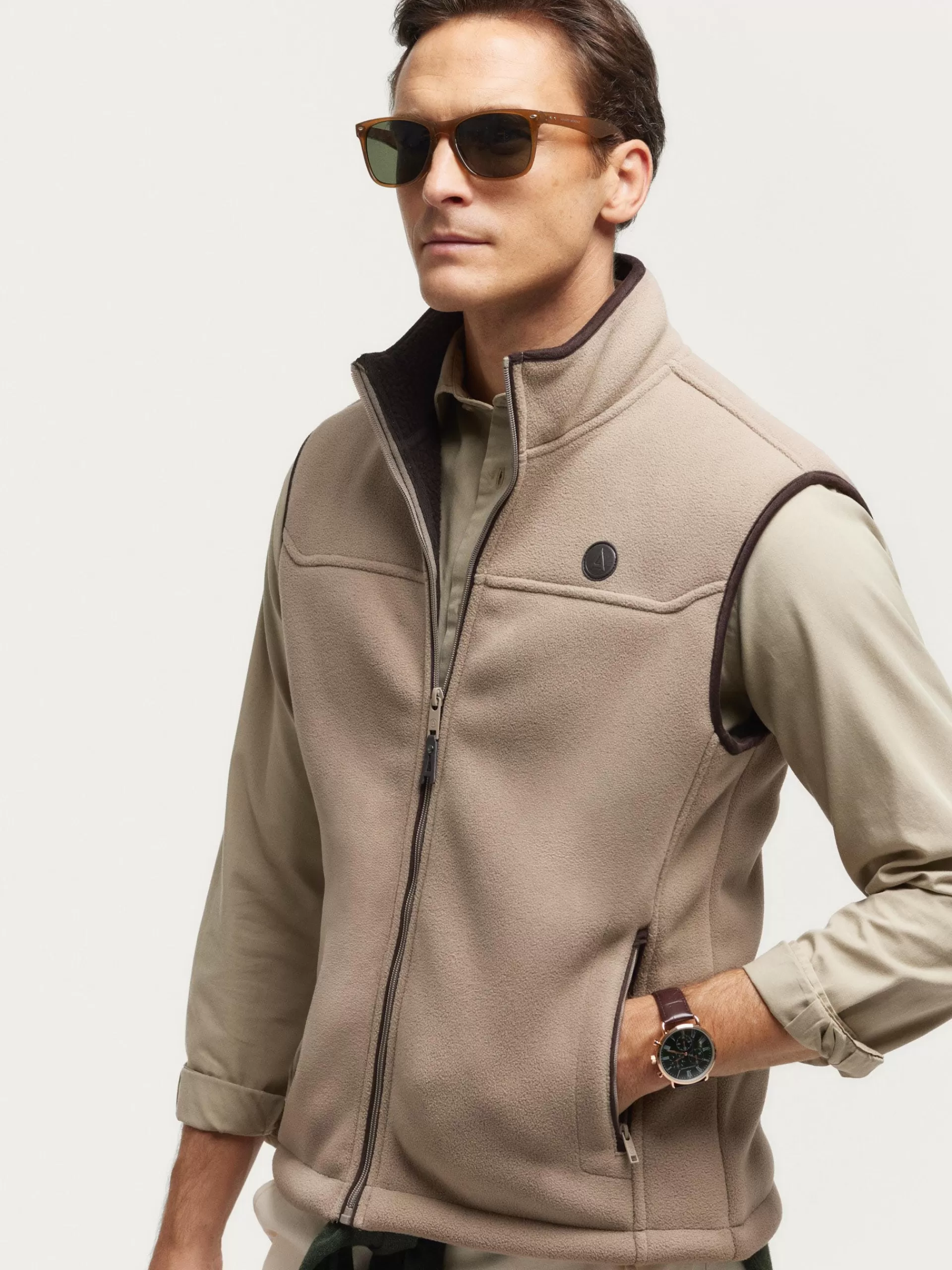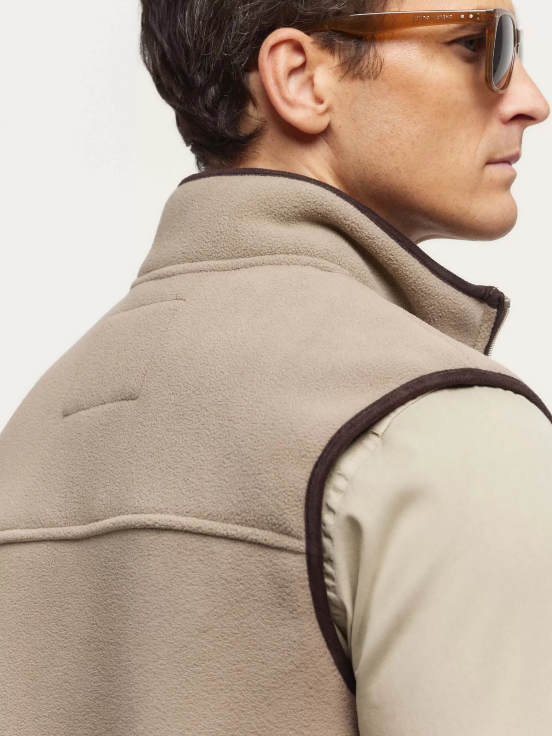 Chaleco confeccionado en tejido avivado en antelina en su exterior y forrado en su interior en borreguillo. Cuenta con cierre central mediante cremallera personalizada, dos bolsillos en su exterior y logo grabado en su frontal. Corte regular fit.