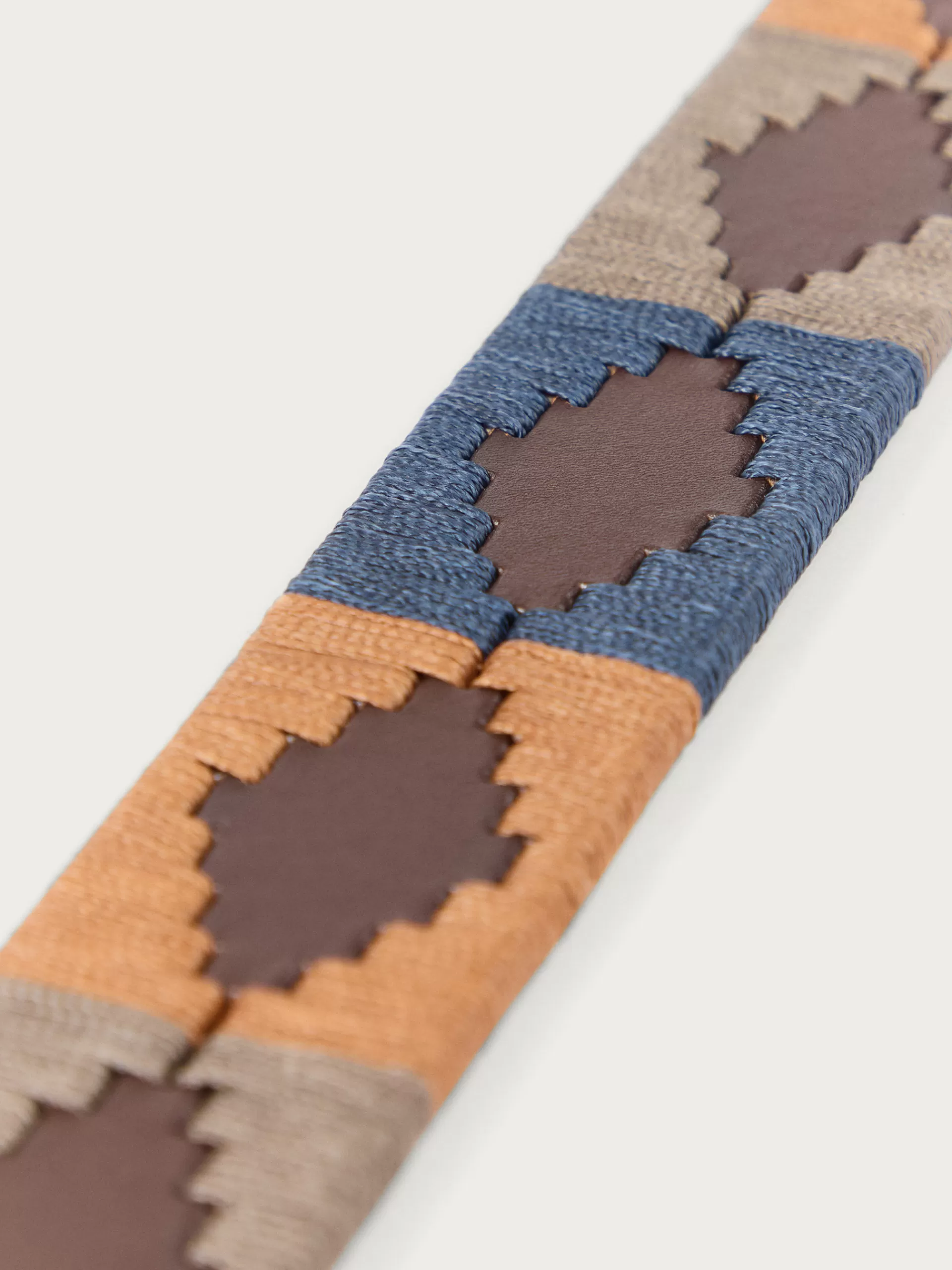 Cinturón con detalles personalizados a contraste y cierre central mediante hebilla metálica y pasador.
