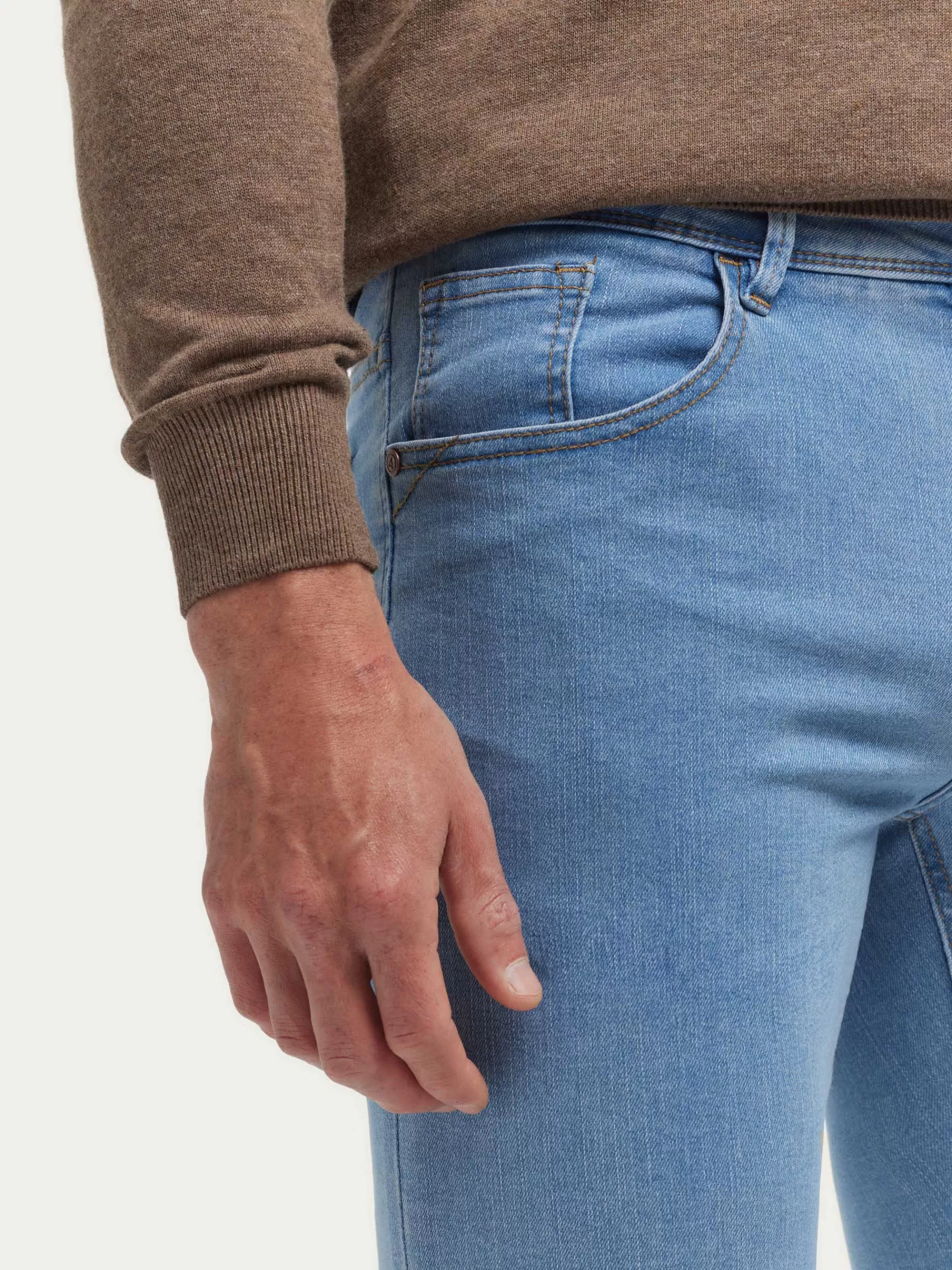 Pantalón denim de corte slim fit con cinco bolsillos y cierre central mediante botón y cremallera, pespuntes en color …