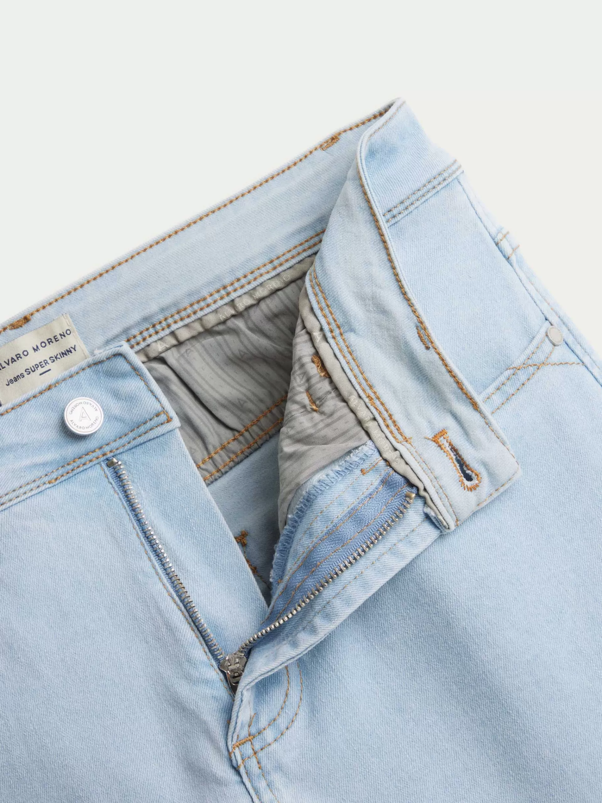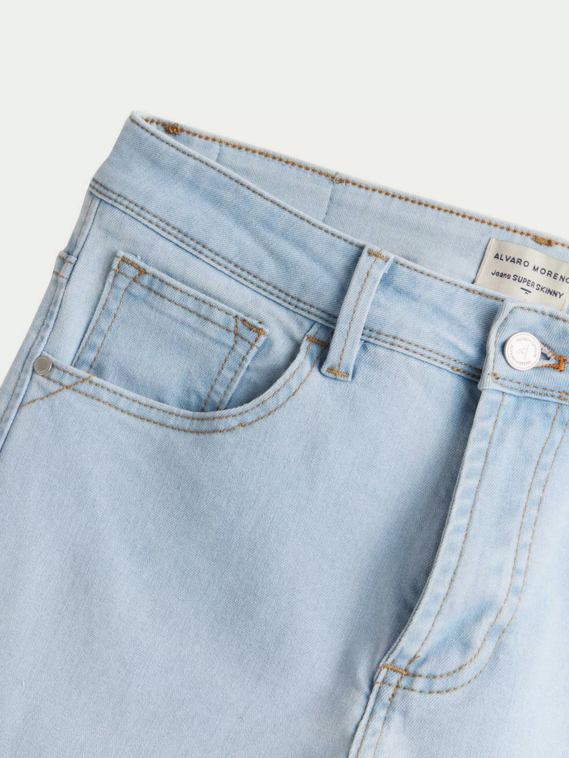 Pantalón denim de corte super skinny fit con cinco bolsillos y cierre central mediante botón y cremallera, pespuntes en color camel, fornituras personalizadas y etiqueta en efecto piel en la cinturilla.