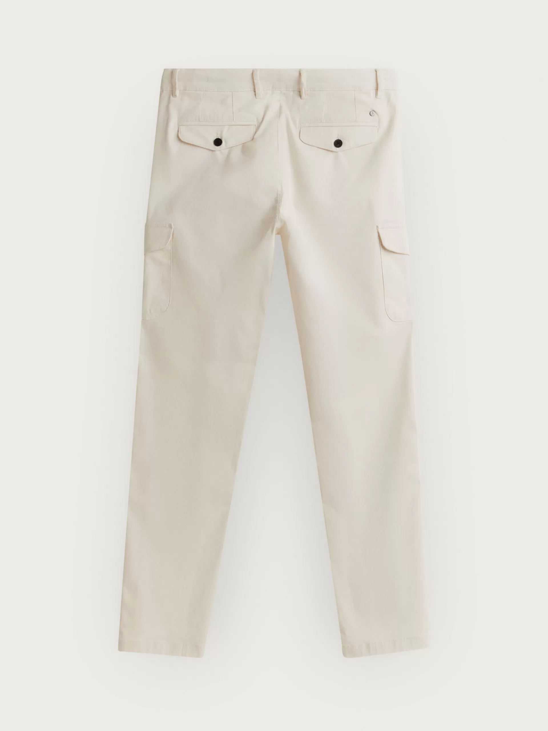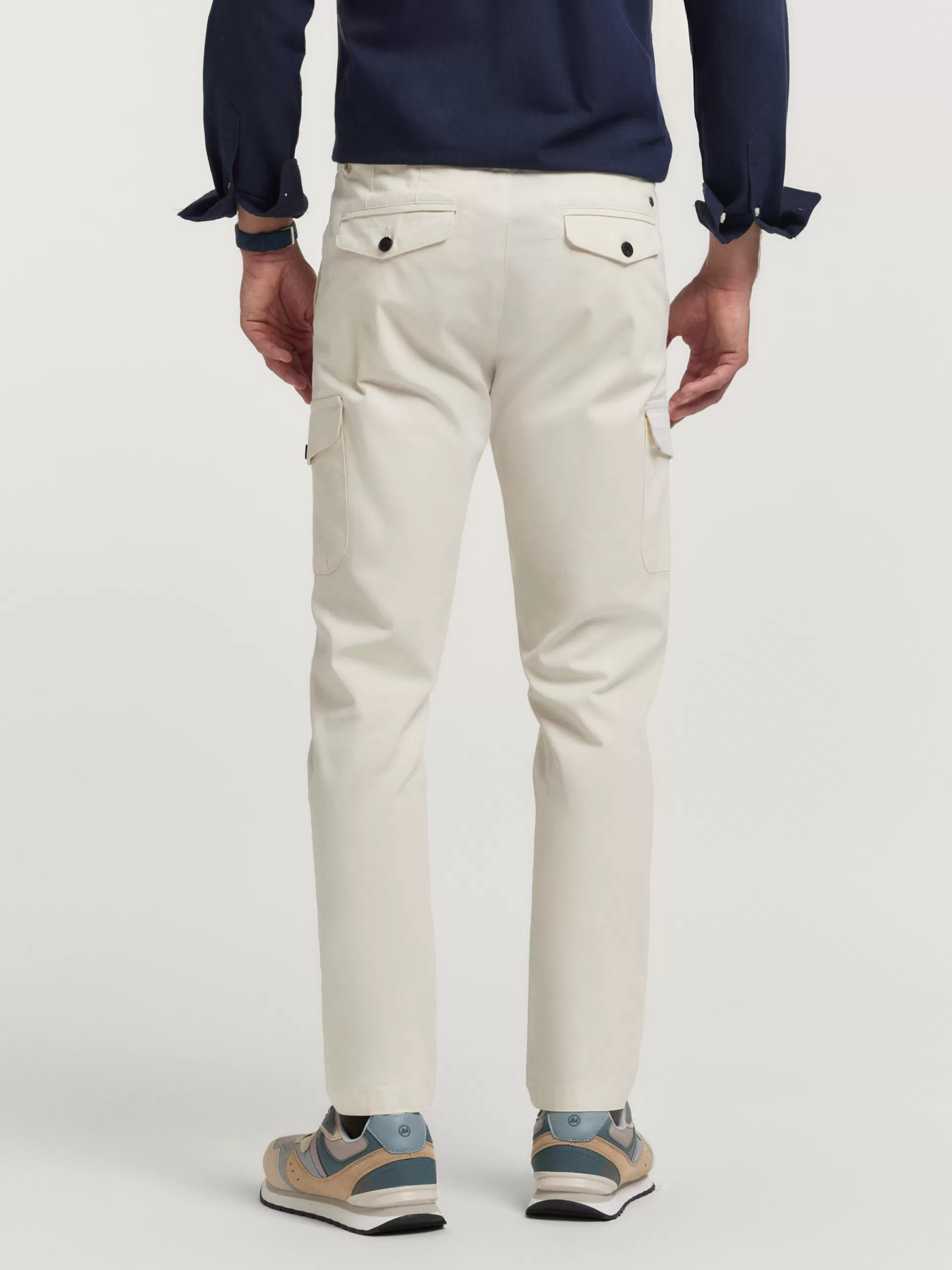 Pantalón cargo con cierre central mediante botón y cremallera. Dos bolsillos laterales y dos más bajos con cierre med…