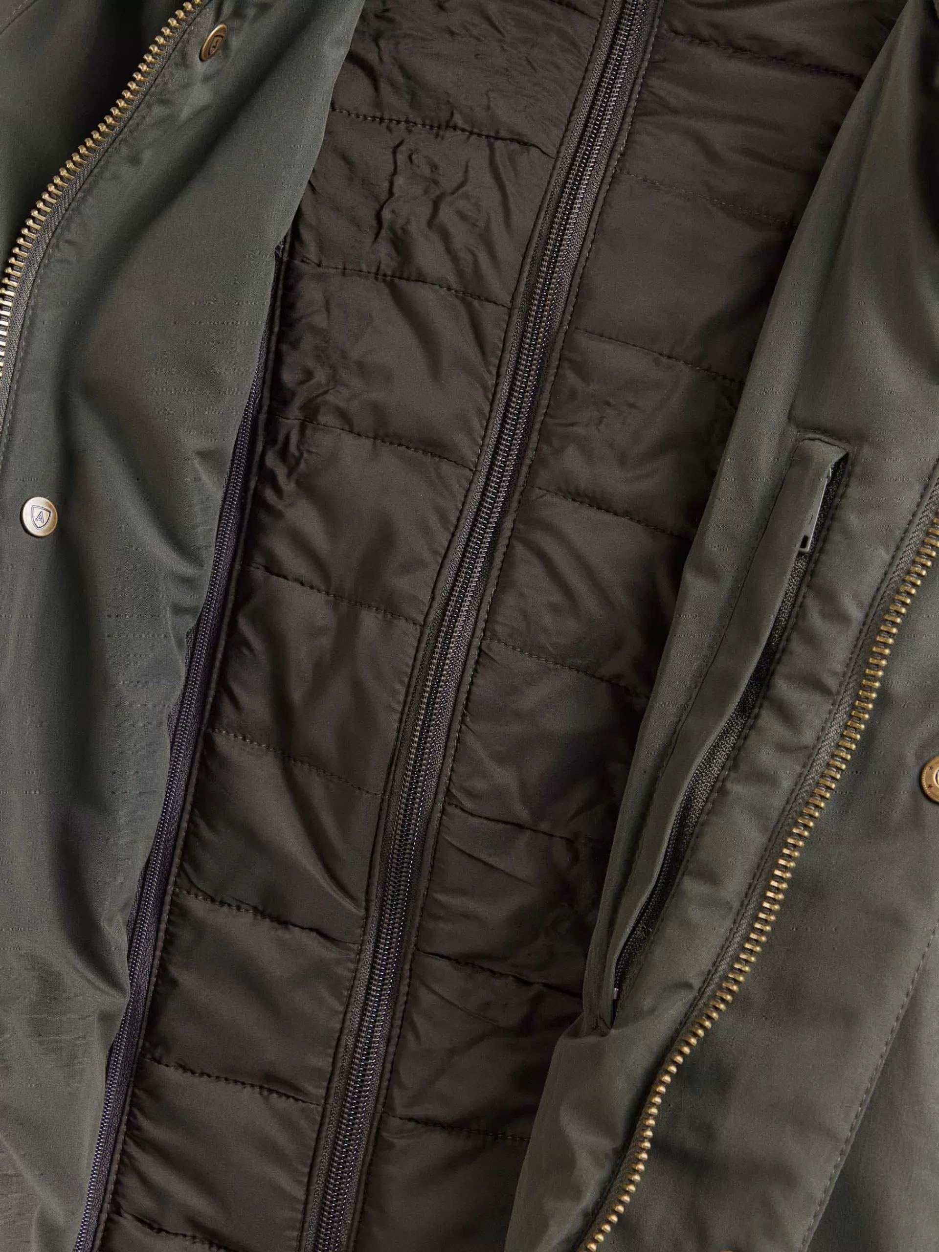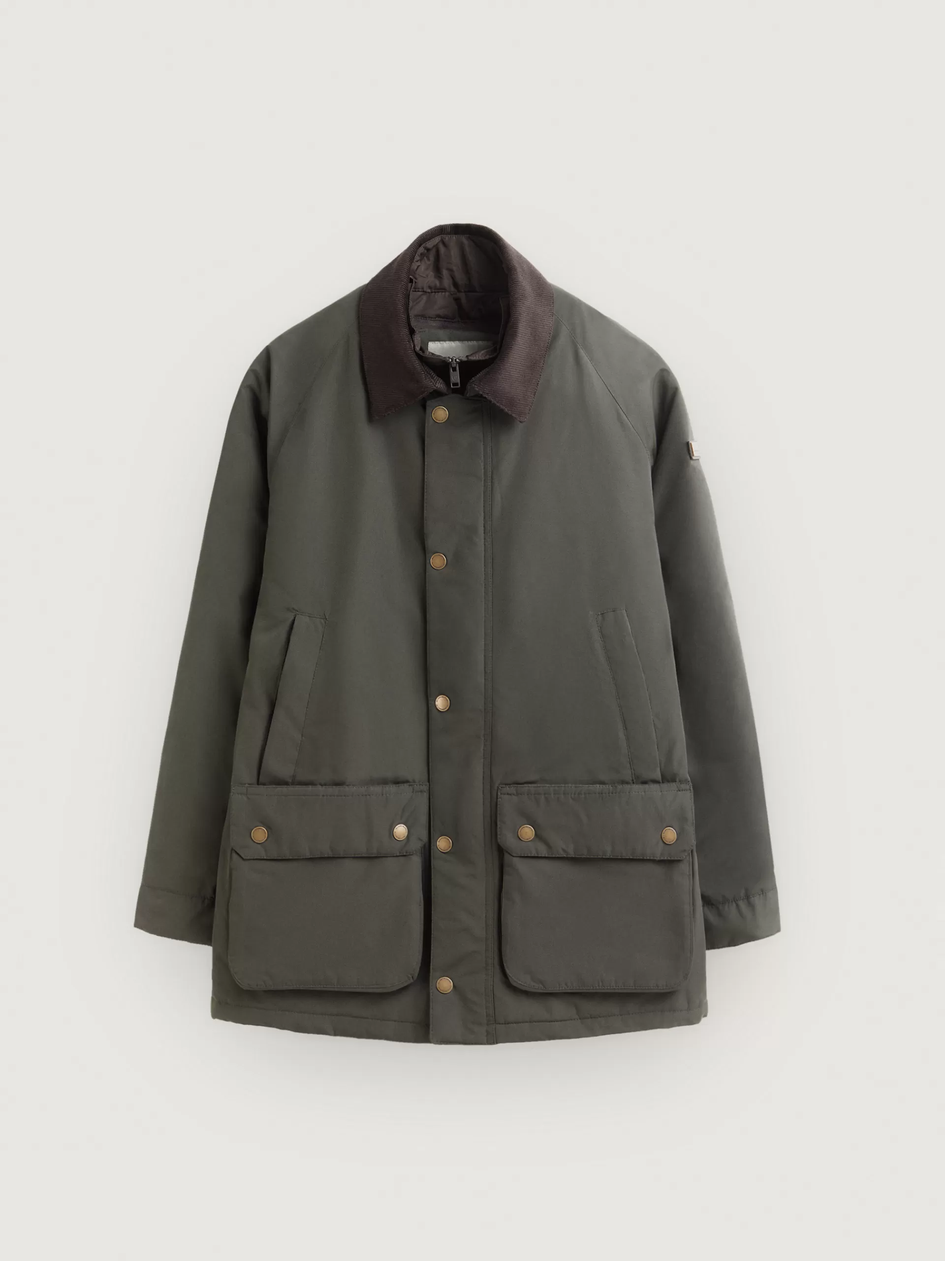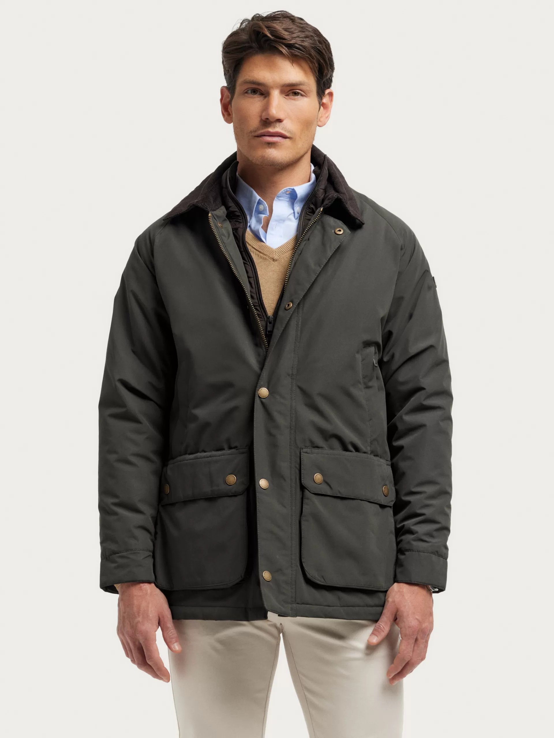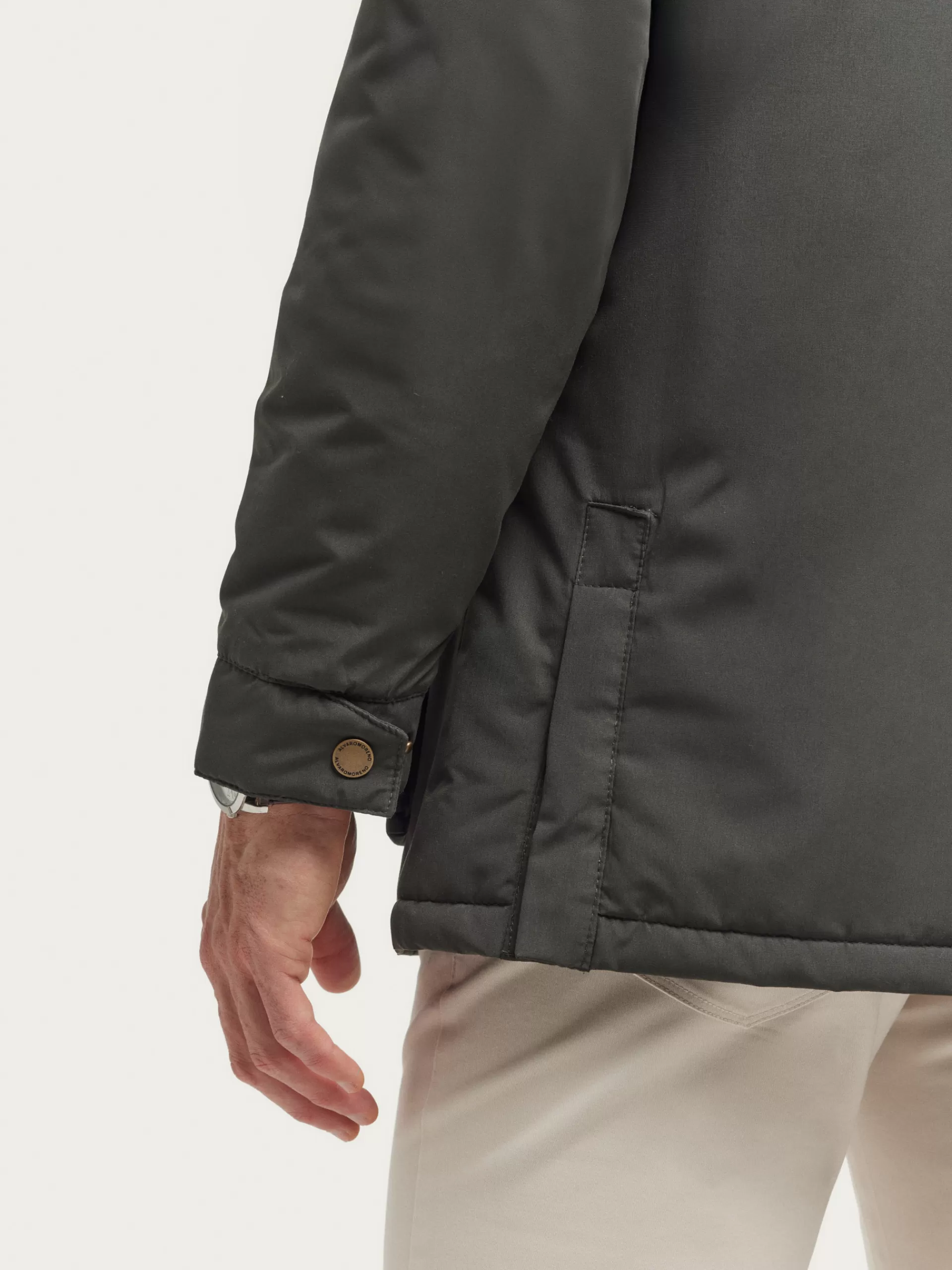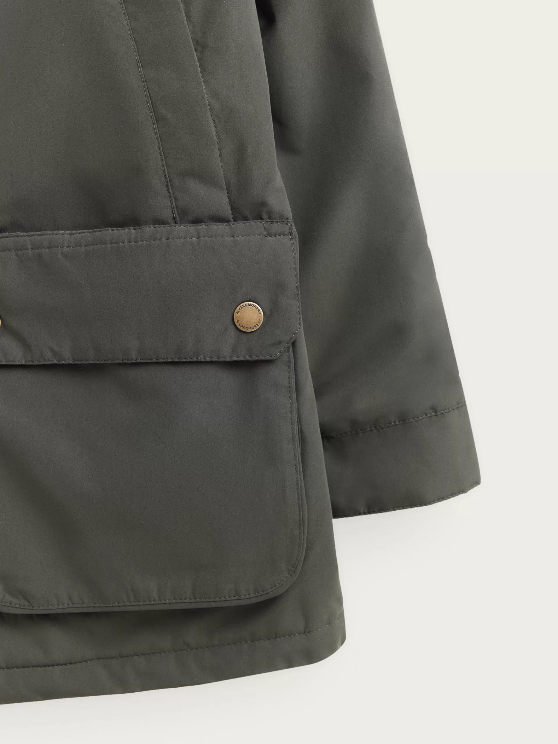 Parka con cuello a contraste y cortavientos interior desmontable. Cierre central mediante cremallera oculta por tapeta de botones a presión, cuatro bolsillos en el frontal y detalle personalizado en una de las mangas. Manga larga con puños ajustables. Forrada y con bolsillos en el interior.