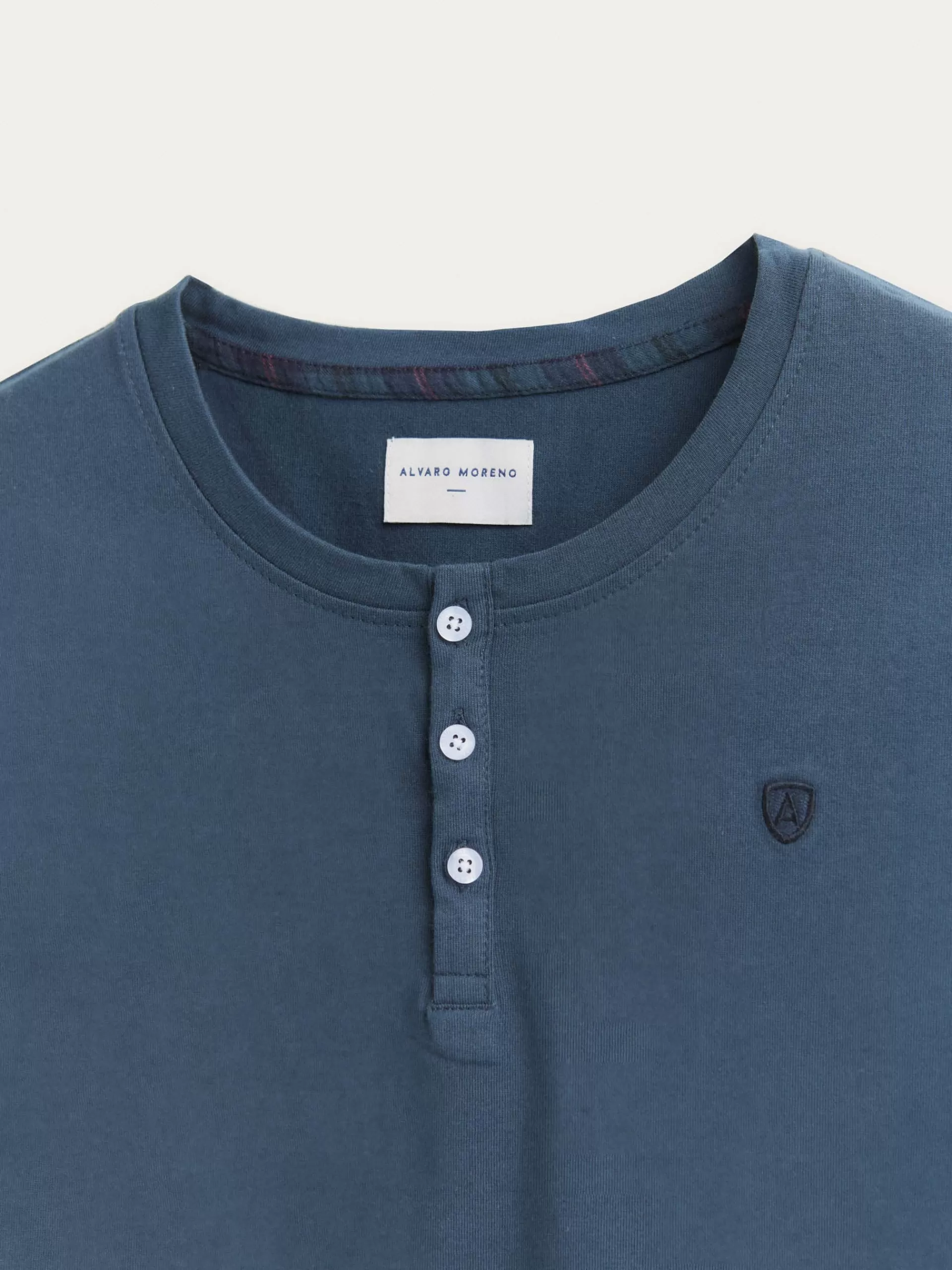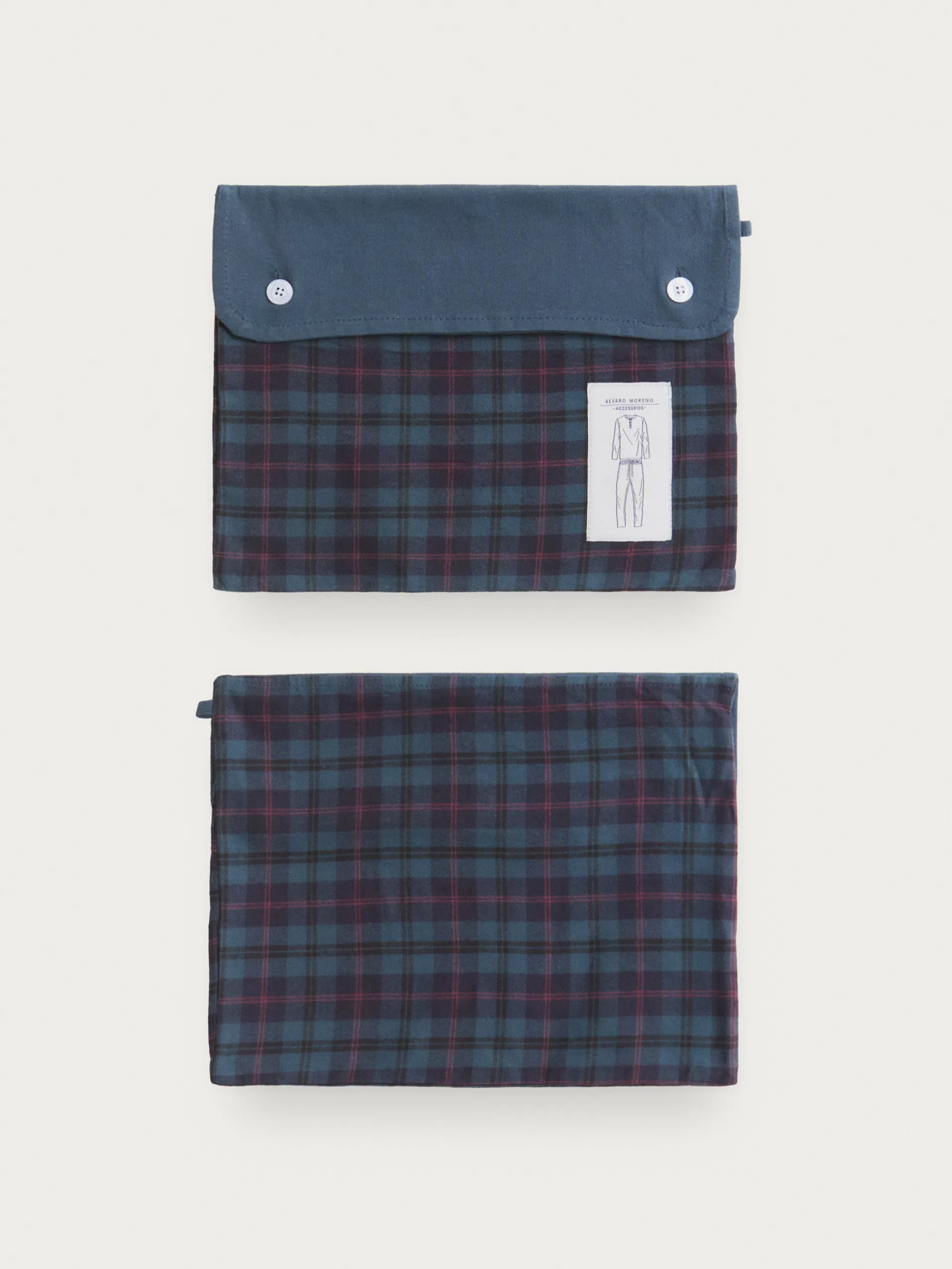Pijama compuesto por dos piezas, superior e inferior. Parte superior camiseta de manga larga con cierre mediante tres botones en el cuello. Pantalón a cuadros con cinturilla elástica y cordón ajustable.