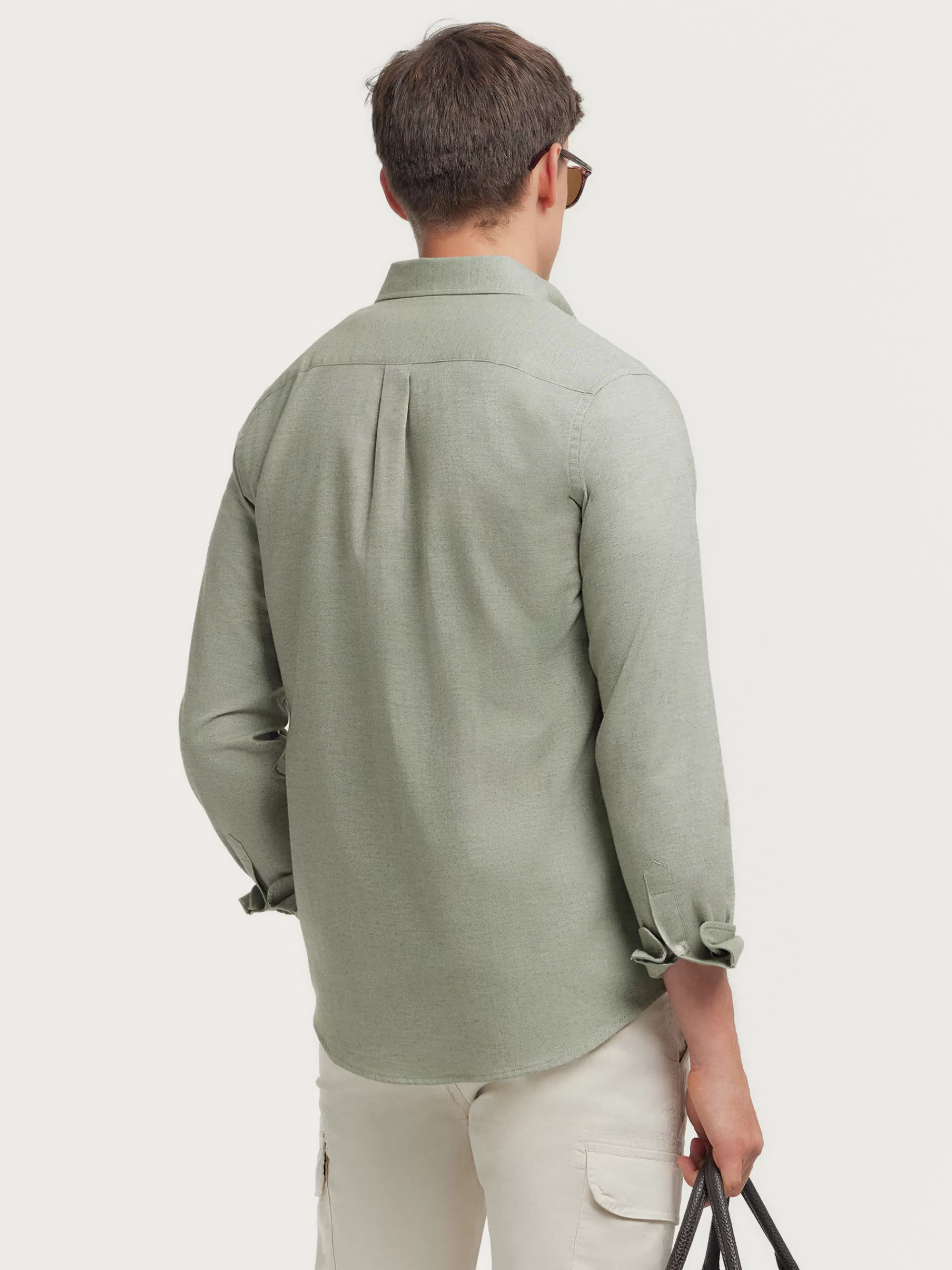 Camisa confeccionada en tejido de franela con cuello clásico de botón, manga larga con puños simples y logo de marca grabado en el frontal. Corte regular fit.