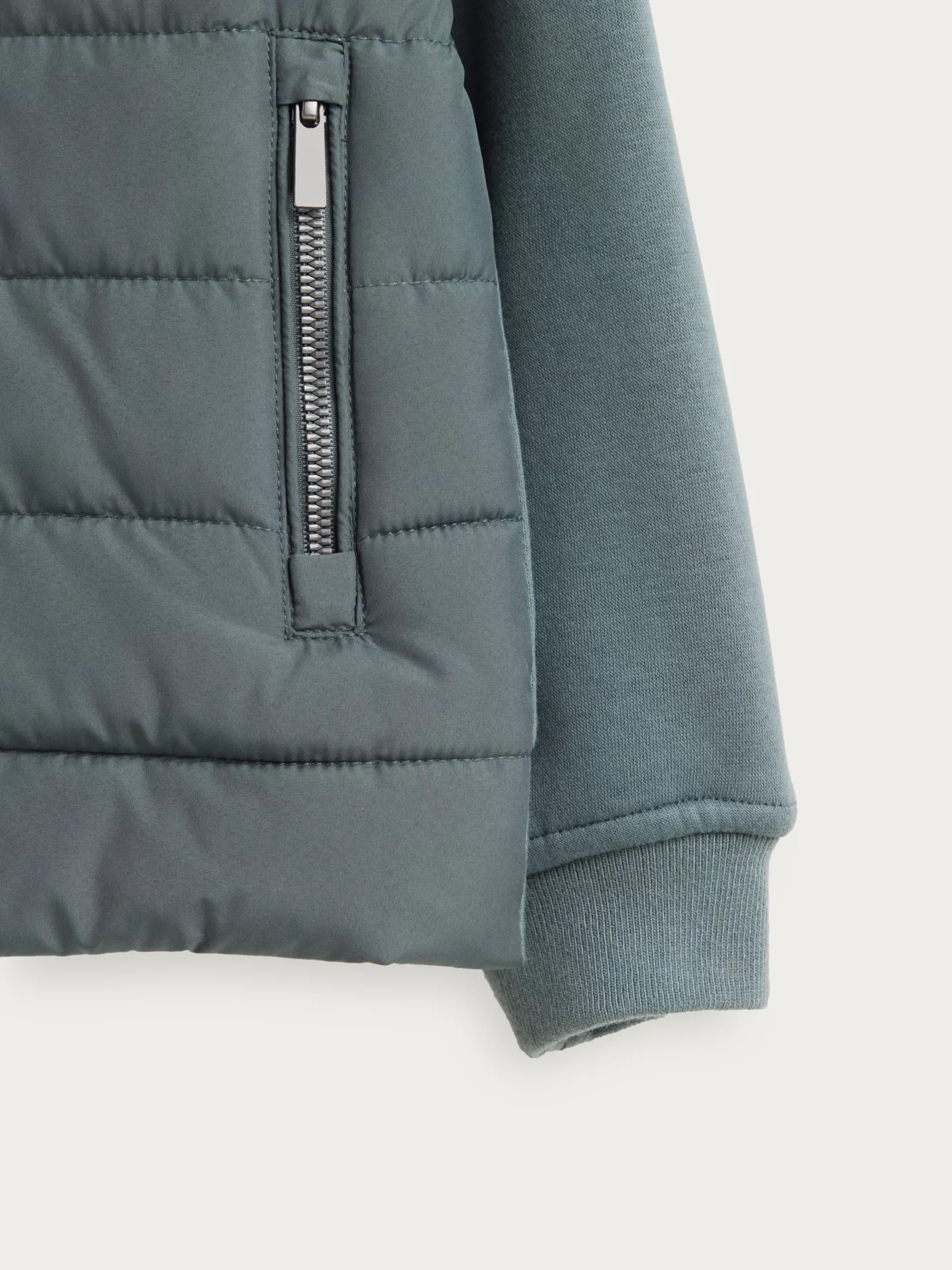 Cazadora estilo bomber con cuello y mangas en tejido de punto. Cuenta en su parte delantera con cierre central mediante …