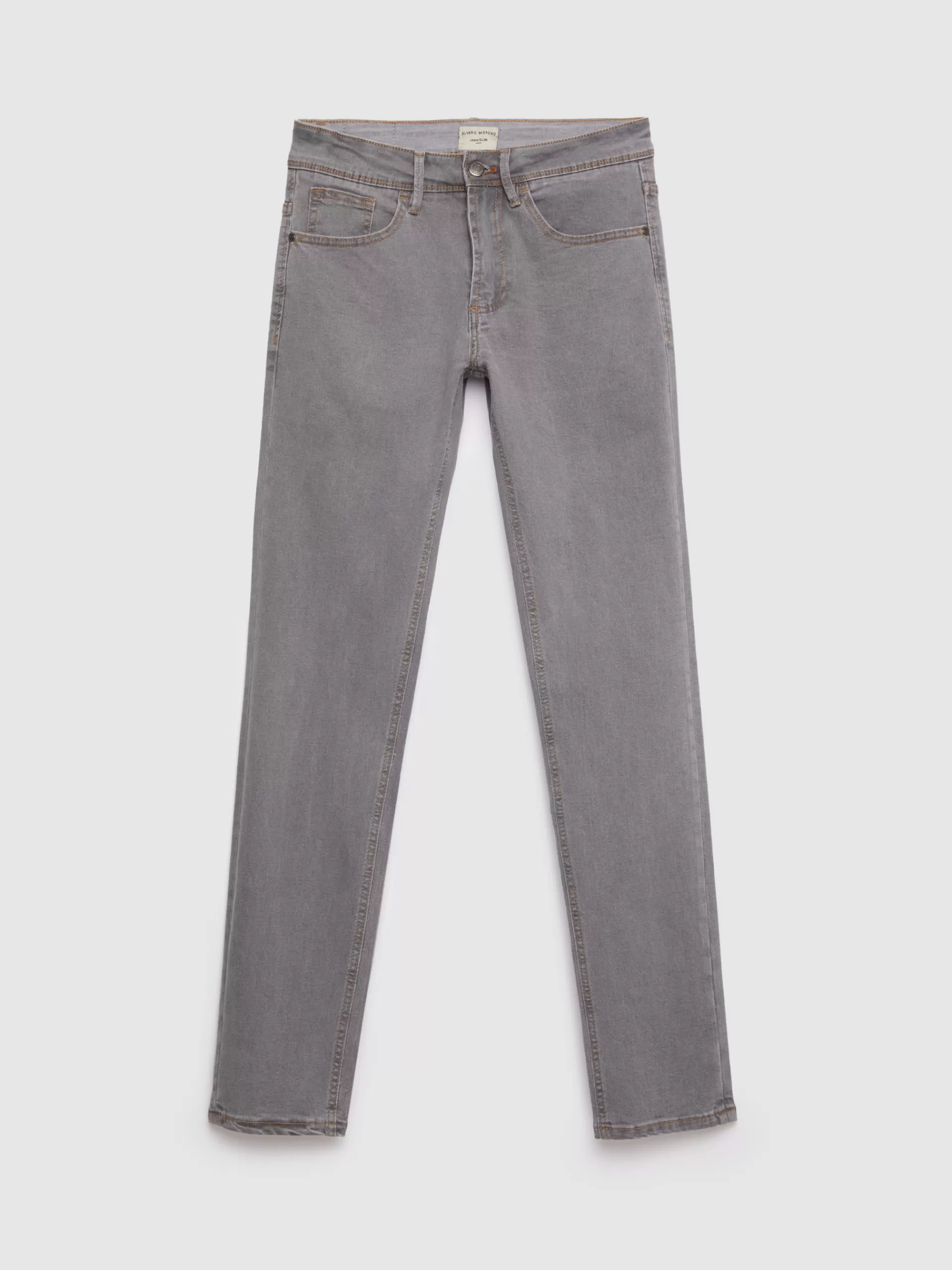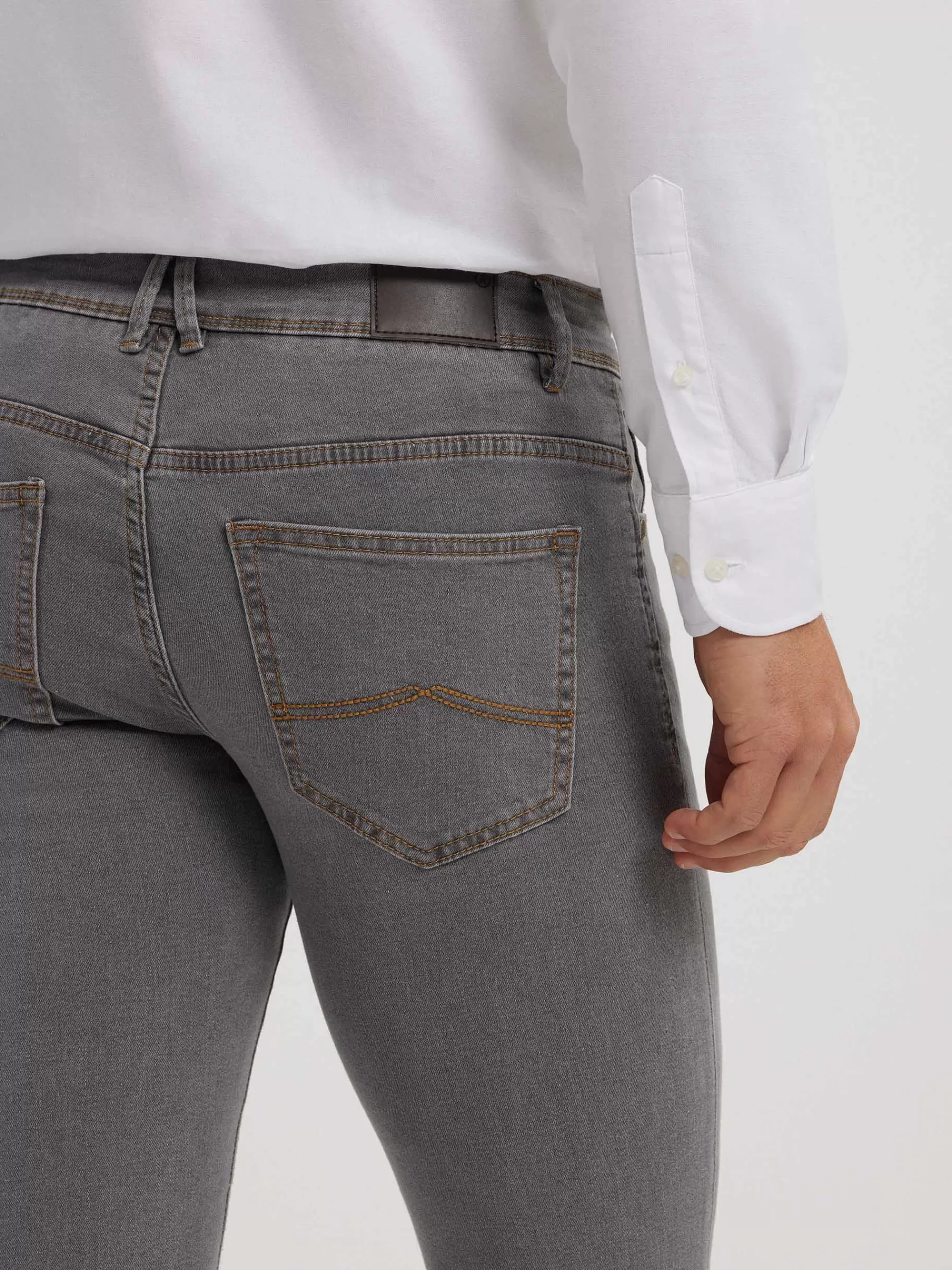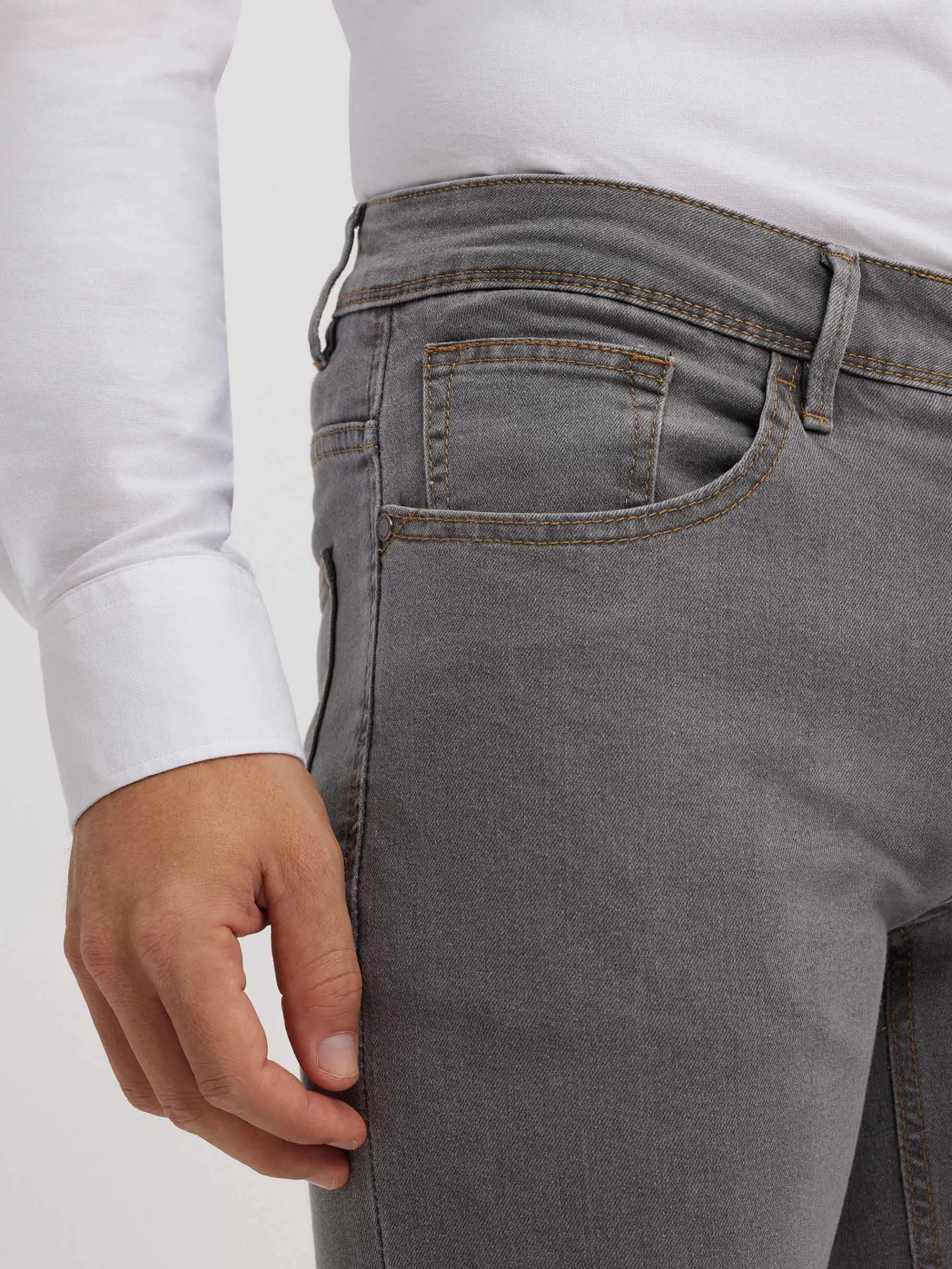 Pantalón denim de corte slim fit con cinco bolsillos y cierre central mediante botón y cremallera, pespuntes en color …