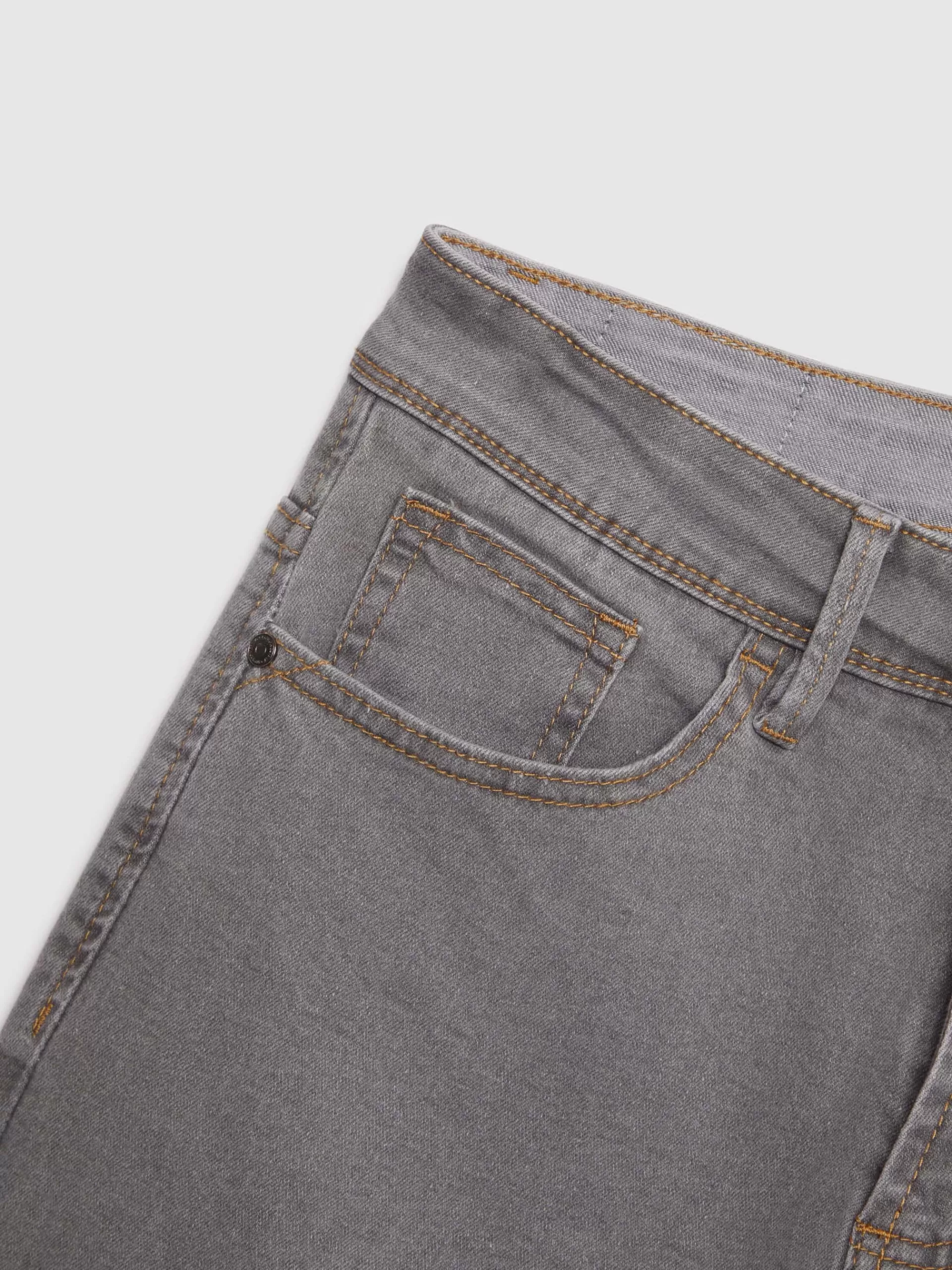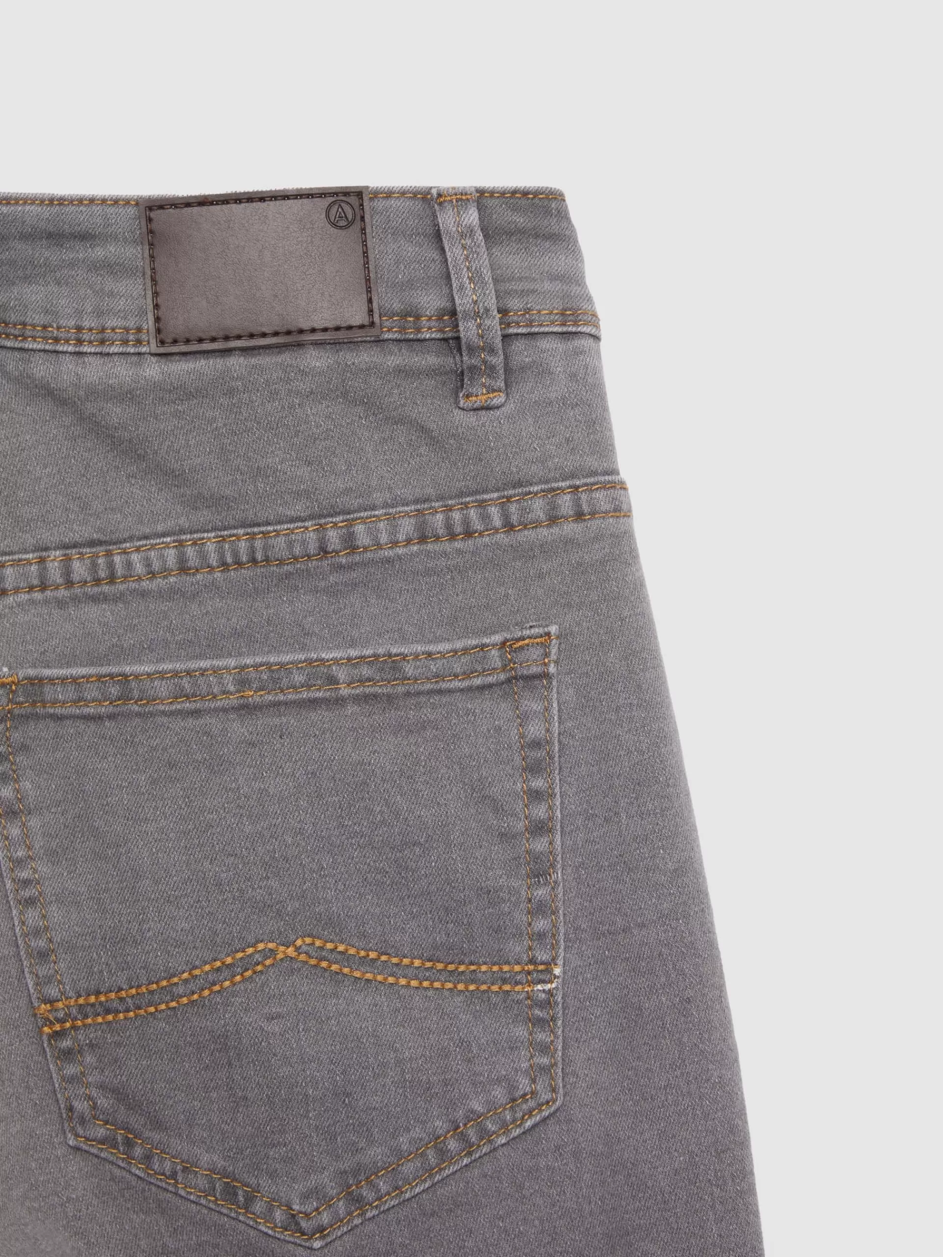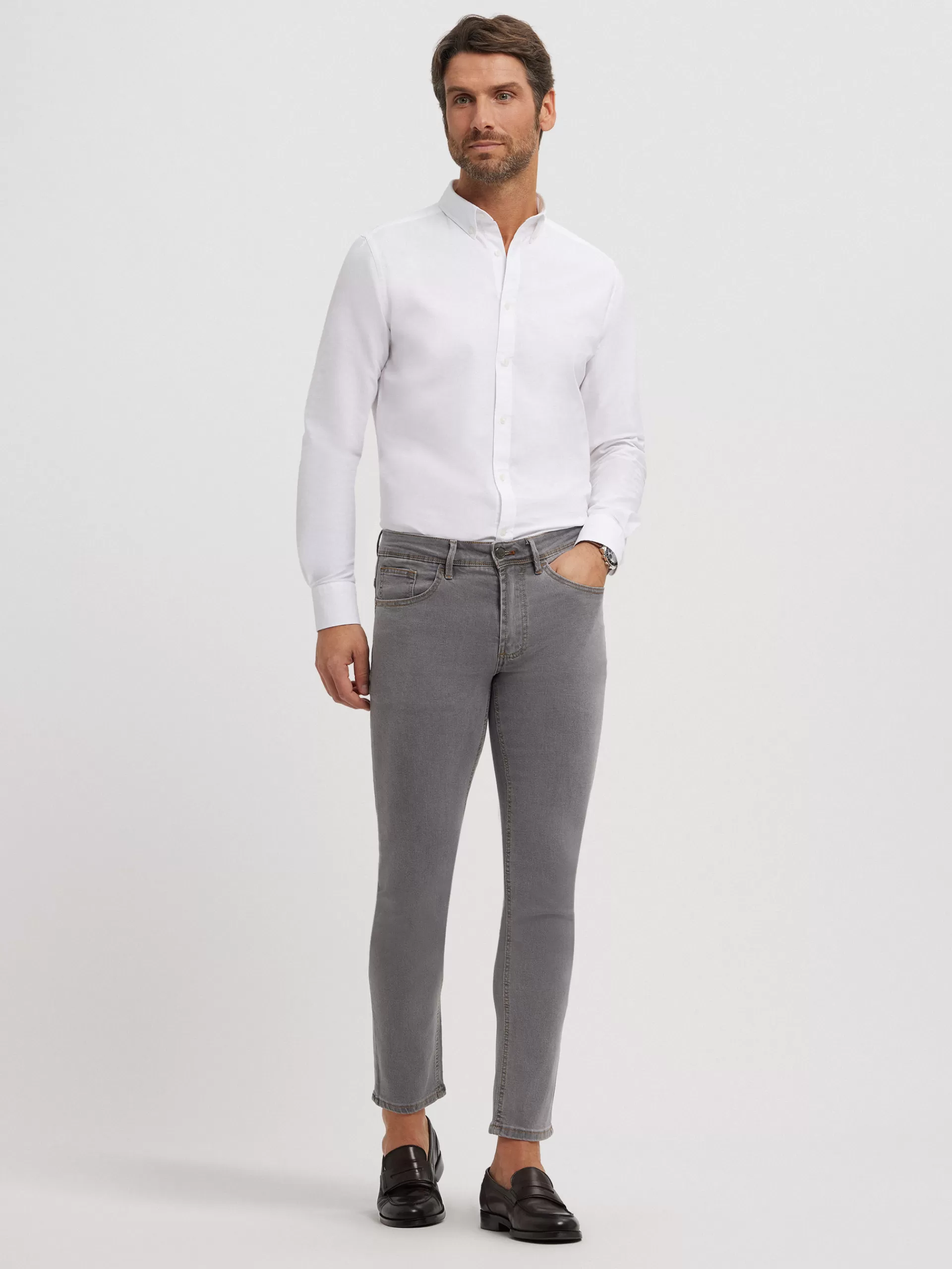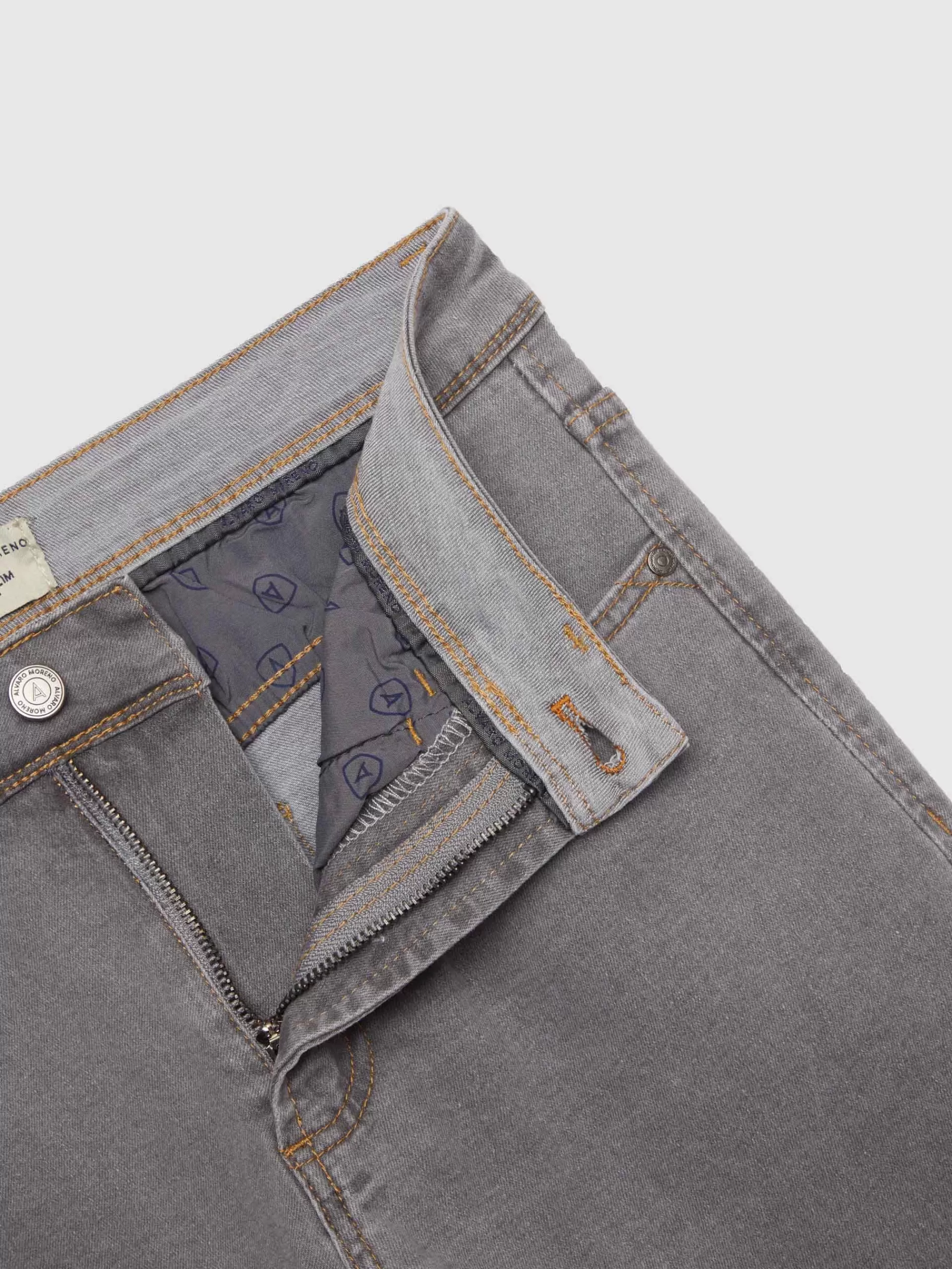 Pantalón denim de corte slim fit con cinco bolsillos y cierre central mediante botón y cremallera, pespuntes en color …