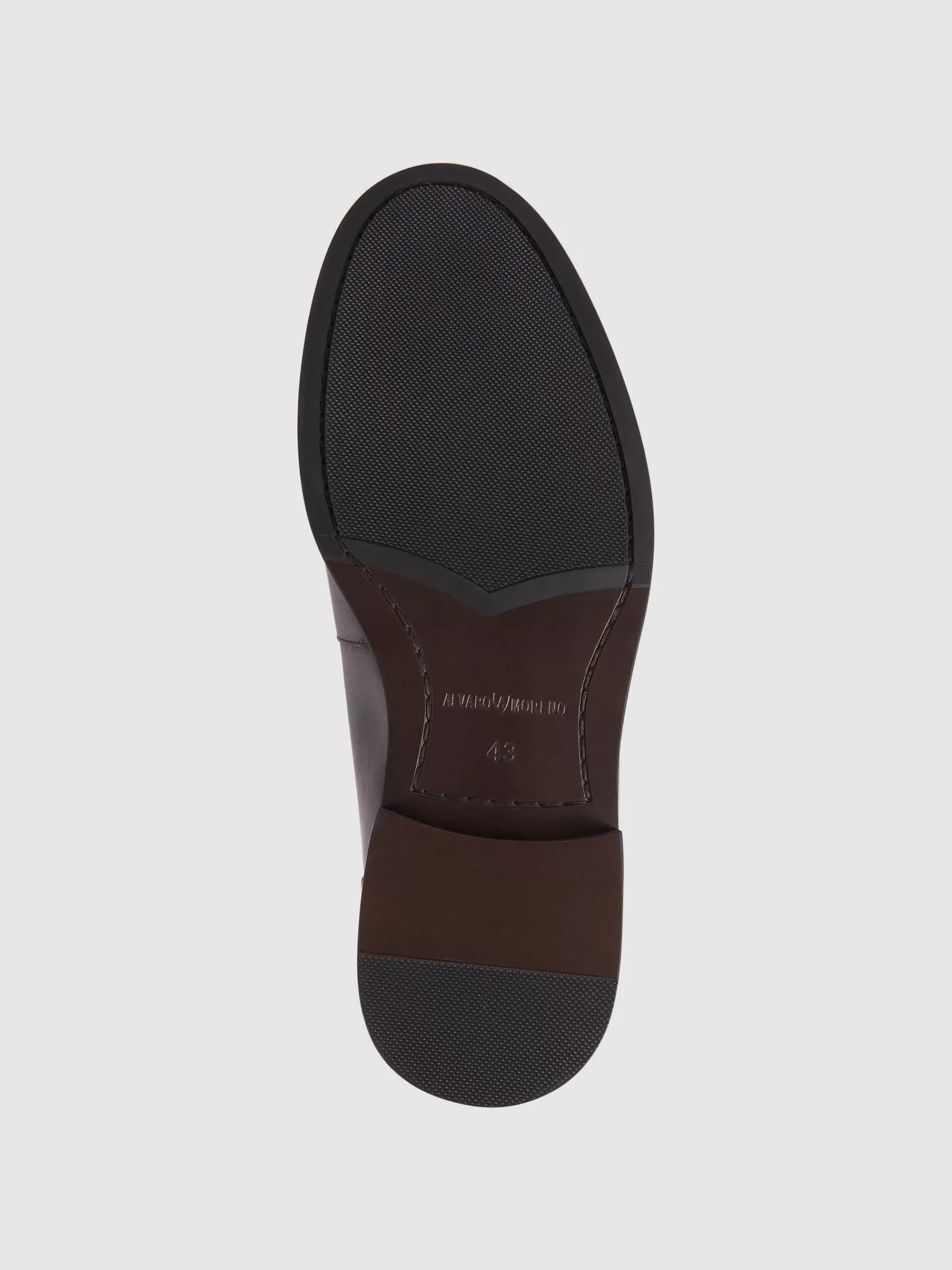Mocasines confeccionados en piel. Cuenta con detalle en forma de antifaz en el frontal, puntera redonda y suela cosida al corte con dos partes laminadas en goma antideslizante.