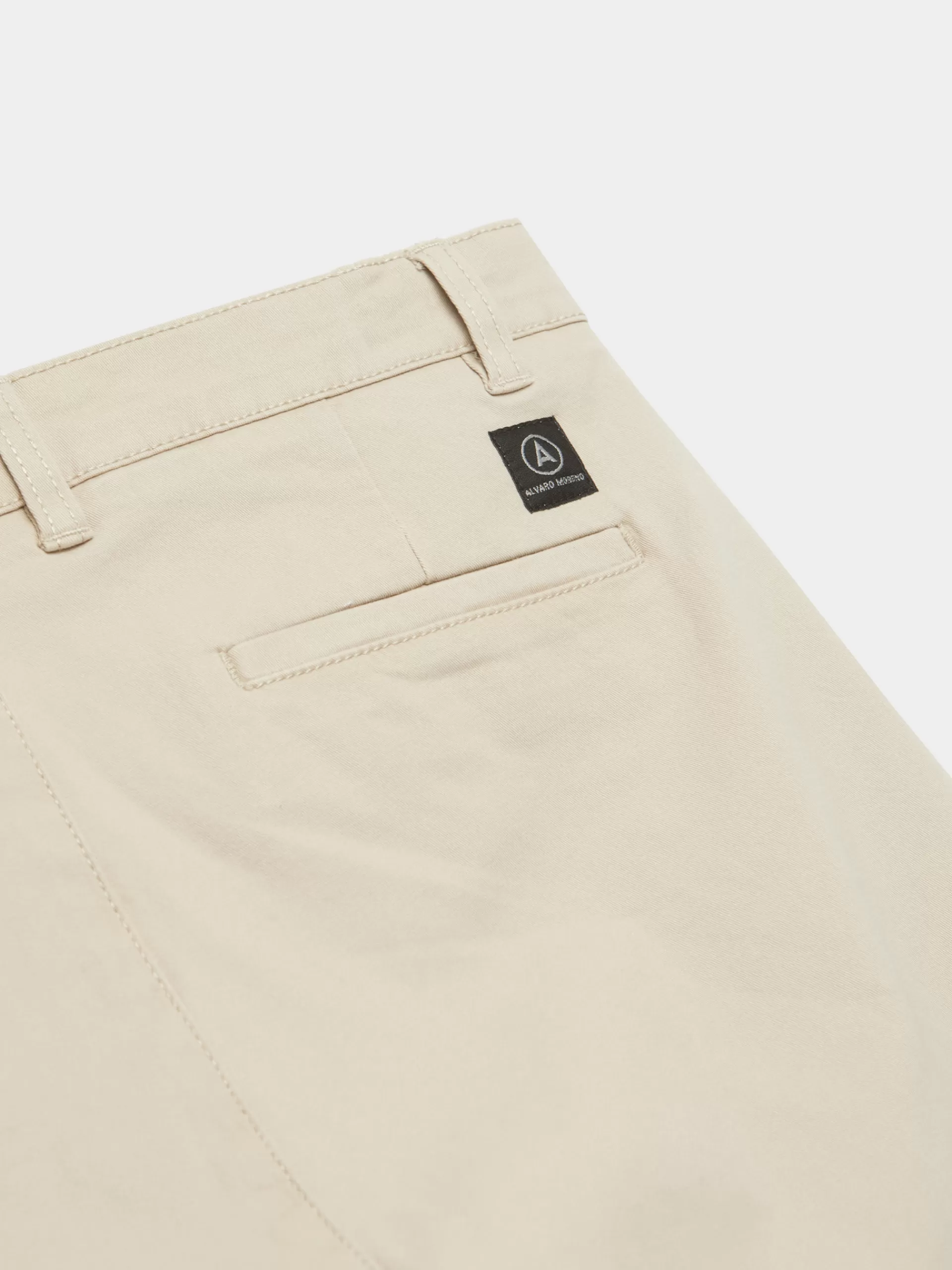 Pantalón estilo chino con tejido confort que cuenta con cierre central mediante botón y cremallera, dos bolsillos en el frontal y dos en la parte trasera con detalle personalizado sobre uno de ellos. Corte slim fit.