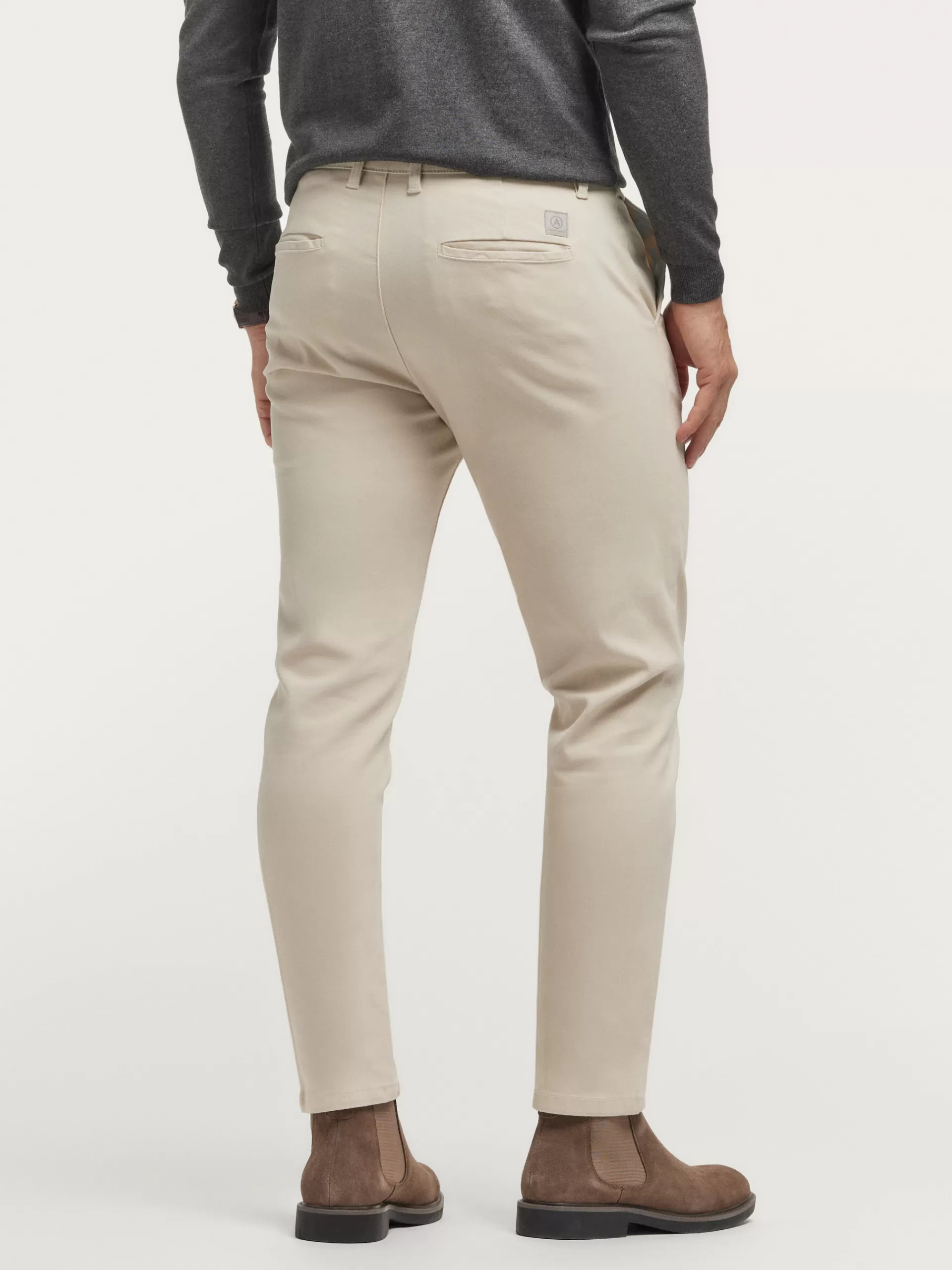 Pantalón chino con cierre central mediante botón y cremallera, dos bolsillos en el frontal y dos en la parte trasera. Detalle personalizado a contraste sobre uno de ellos. Corte slim fit.