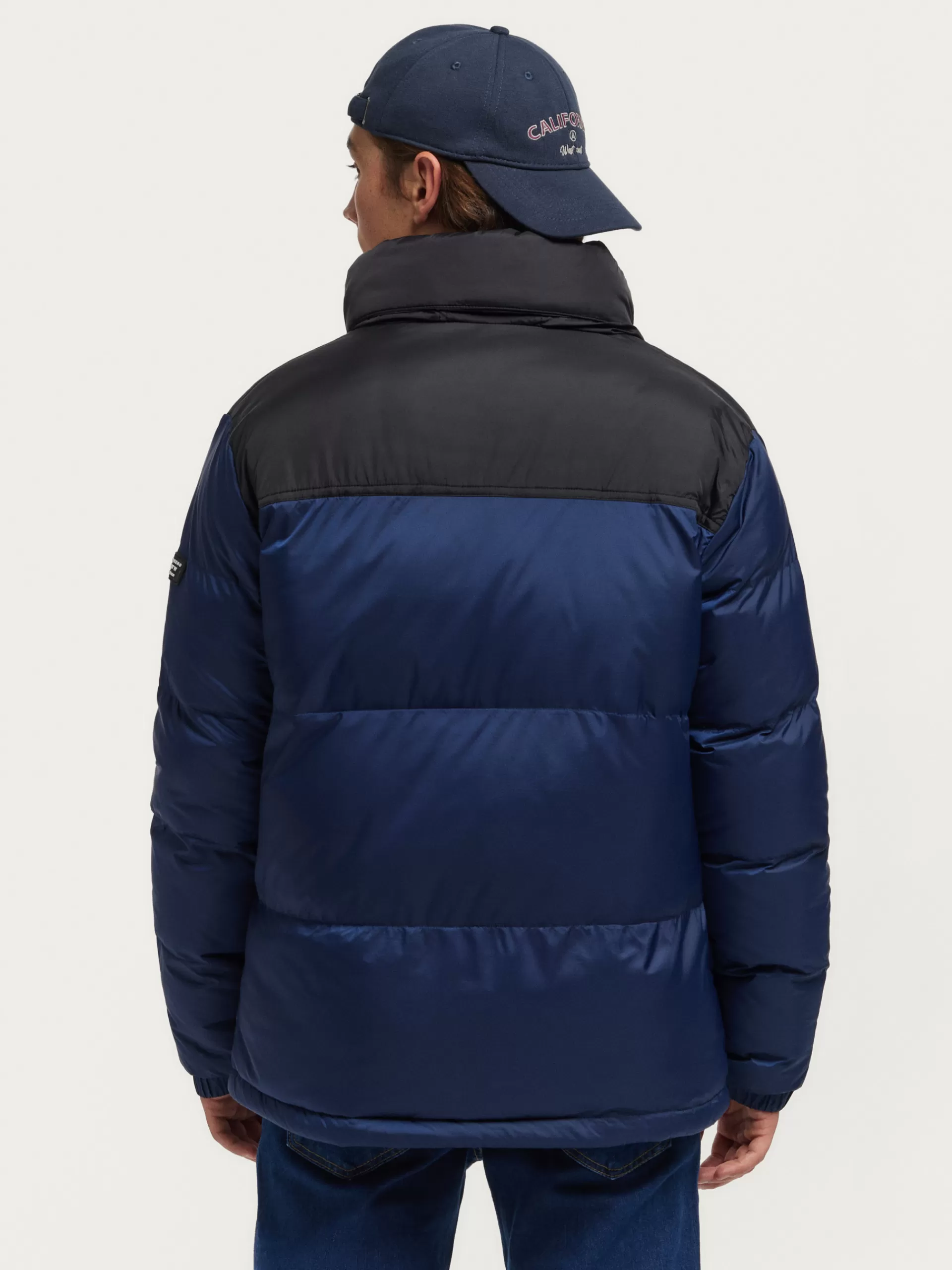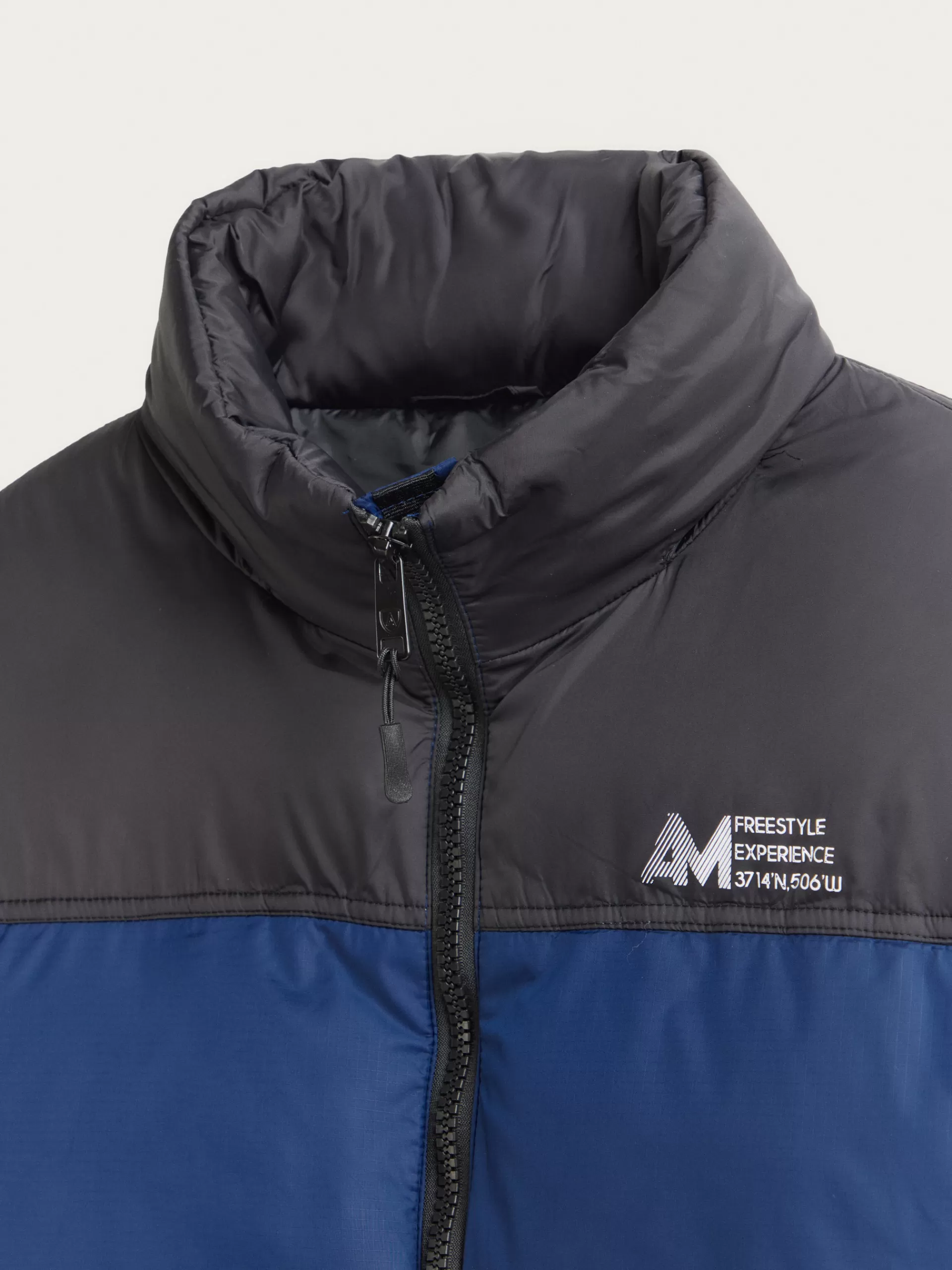 Parka acolchada bicolor con cuello subido y gorro oculto. Cuenta con cierre central mediante cremallera, dos bolsillo en la cintura con cierre de cremallera y puños elásticos ajustables. Detalle personalizado grabado en el frontal y en una de sus mangas. Bolsillo en el interior. Corte regular fit.