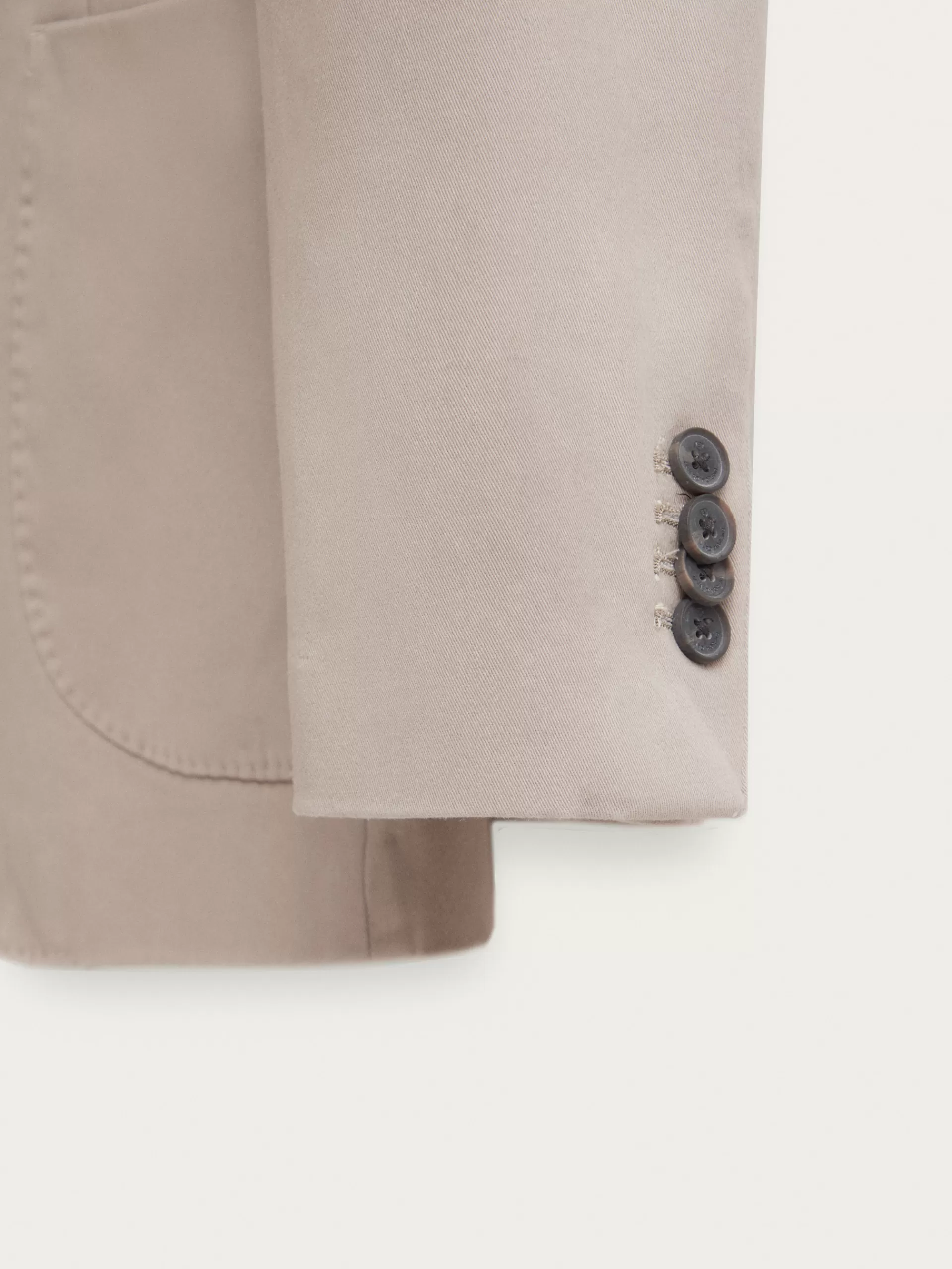 Americana confeccionada en tejido de algodón de corte slim fit. Cuenta con cuello y solapa, cierre central simple mediante dos botones y puños con botones decorativos. Pinzas en el frontal, dos bolsillos de parche en la cintura y un bolsillo a la altura del pecho. Dos bolsillos en su interior.