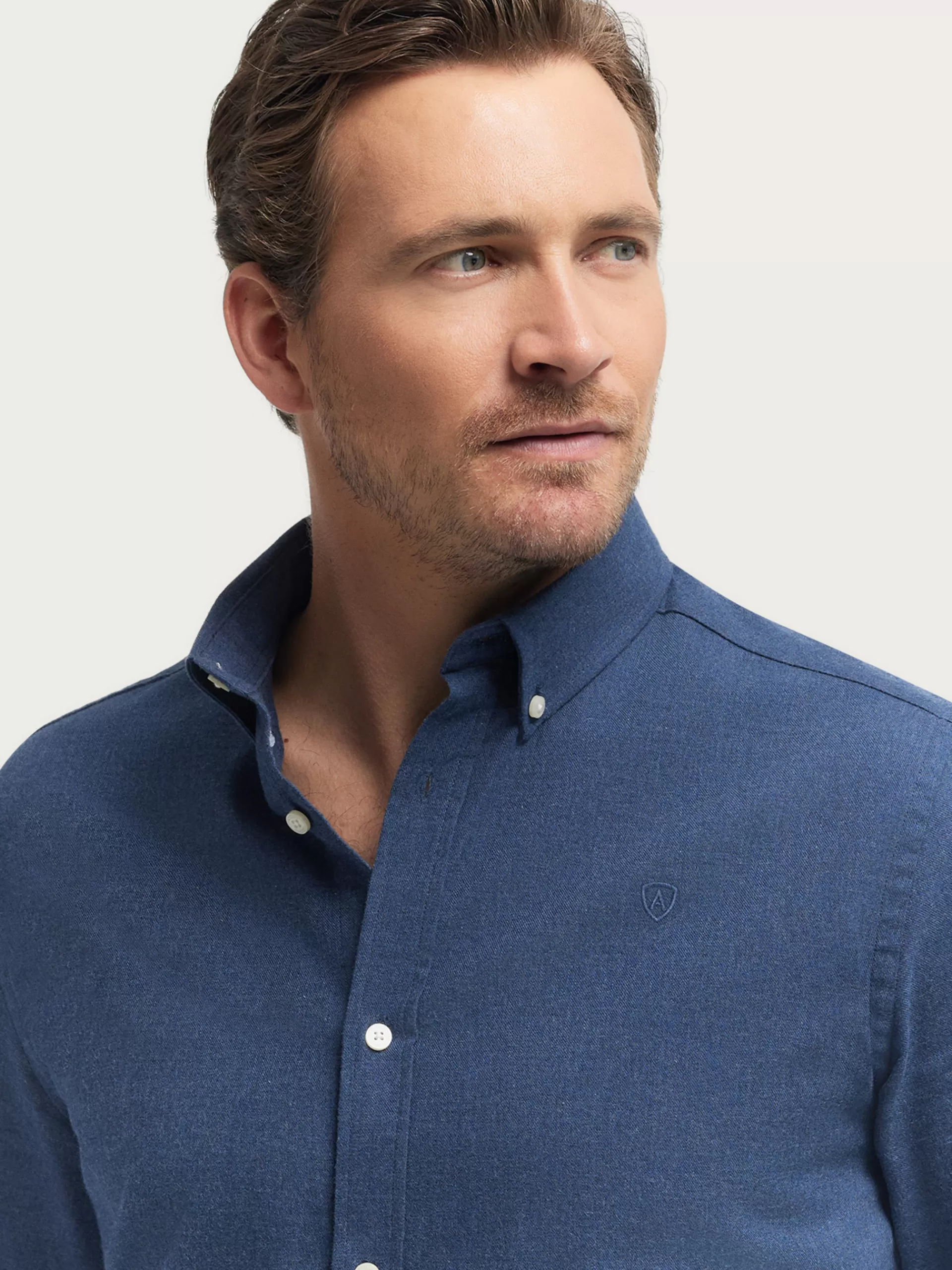 Camisa confeccionada en tejido de franela con cuello clásico de botón, manga larga con puños simples y logo de marca grabado en el frontal. Corte regular fit.