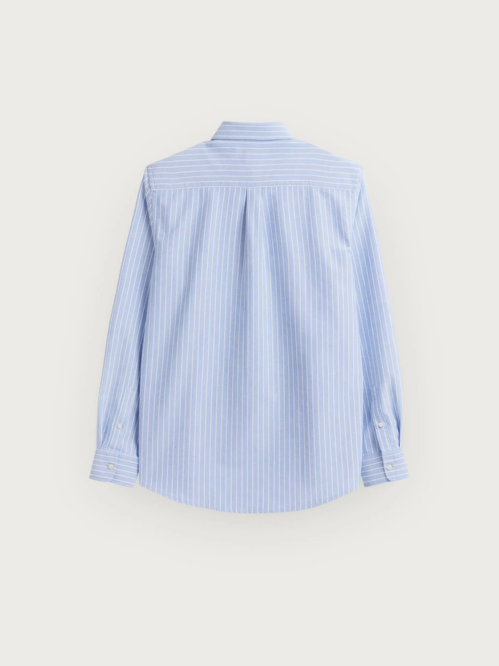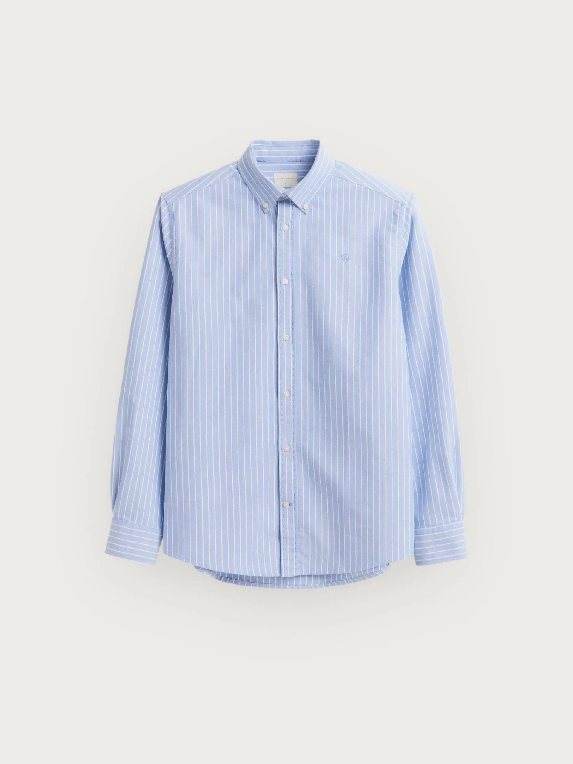 Camisa a rayas confeccionada en algodón con cuello clásico de botón, manga larga con puños simples y logo de la marca grabado en el frontal al tono. Corte regular fit.