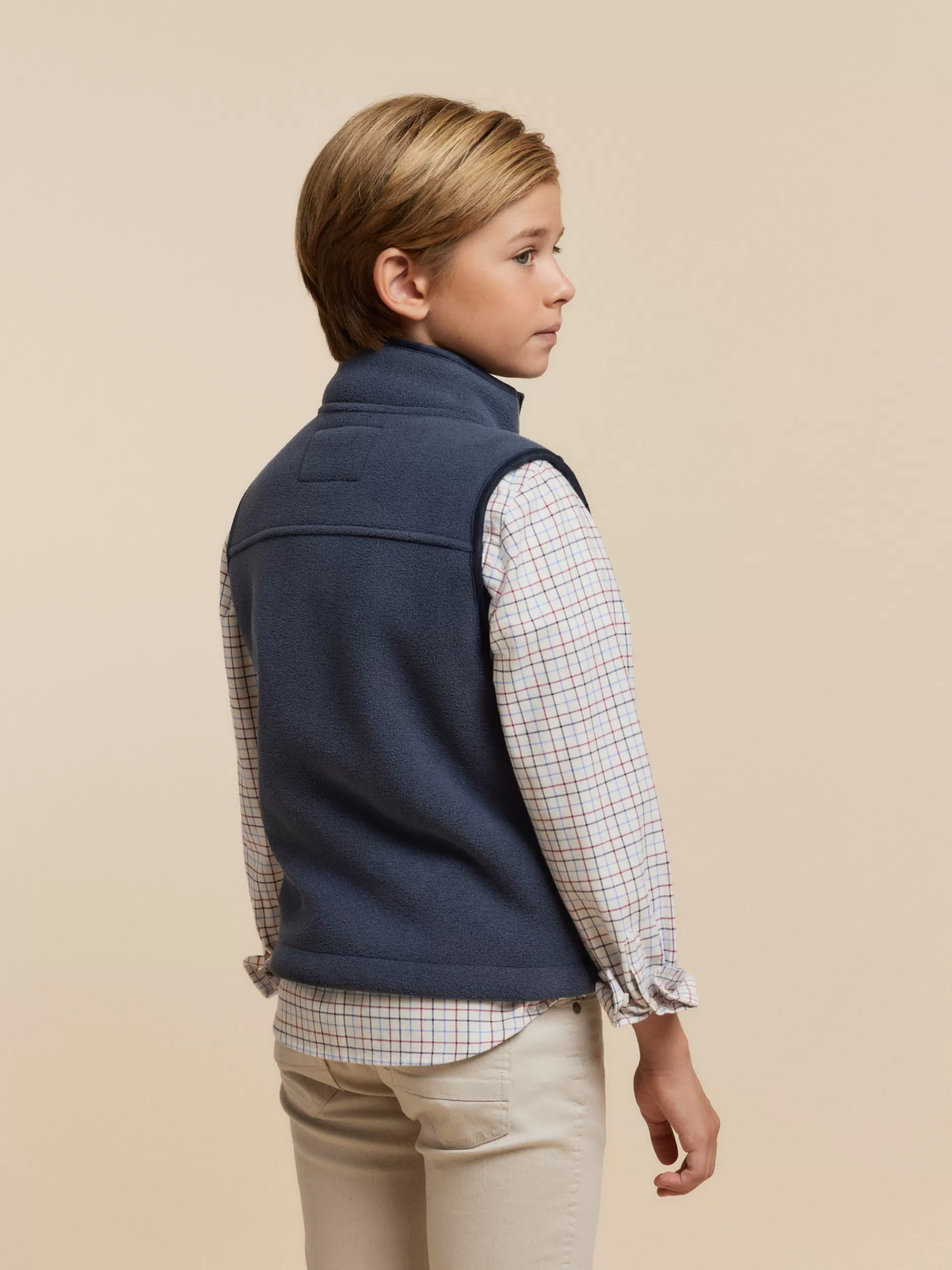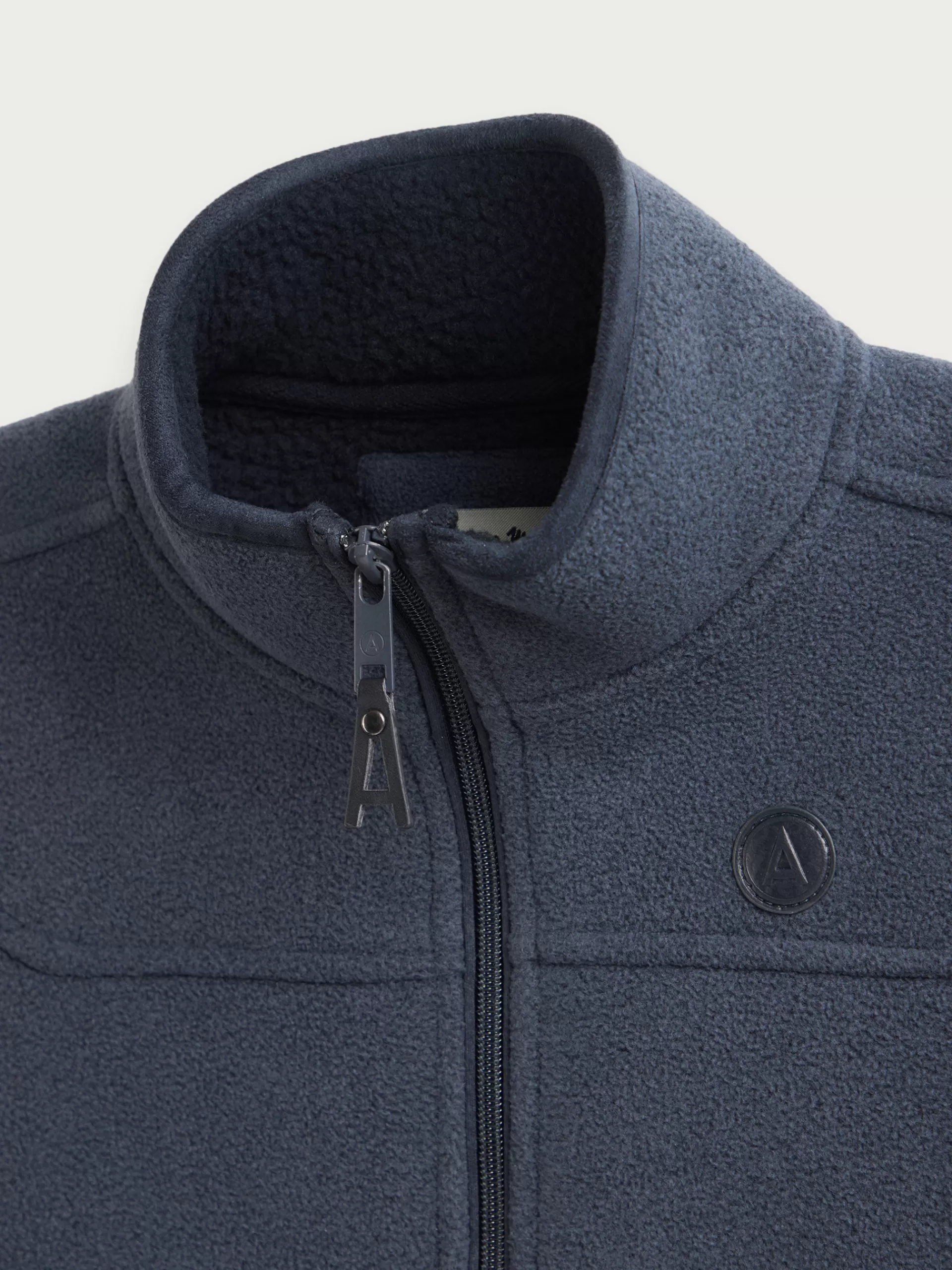 Chaleco confeccionado en tejido avivado en antelina en su exterior y forrado en su interior en borreguillo. Cuenta con cierre central mediante cremallera personalizada, dos bolsillos en su exterior y logo grabado en su frontal. Corte regular fit.