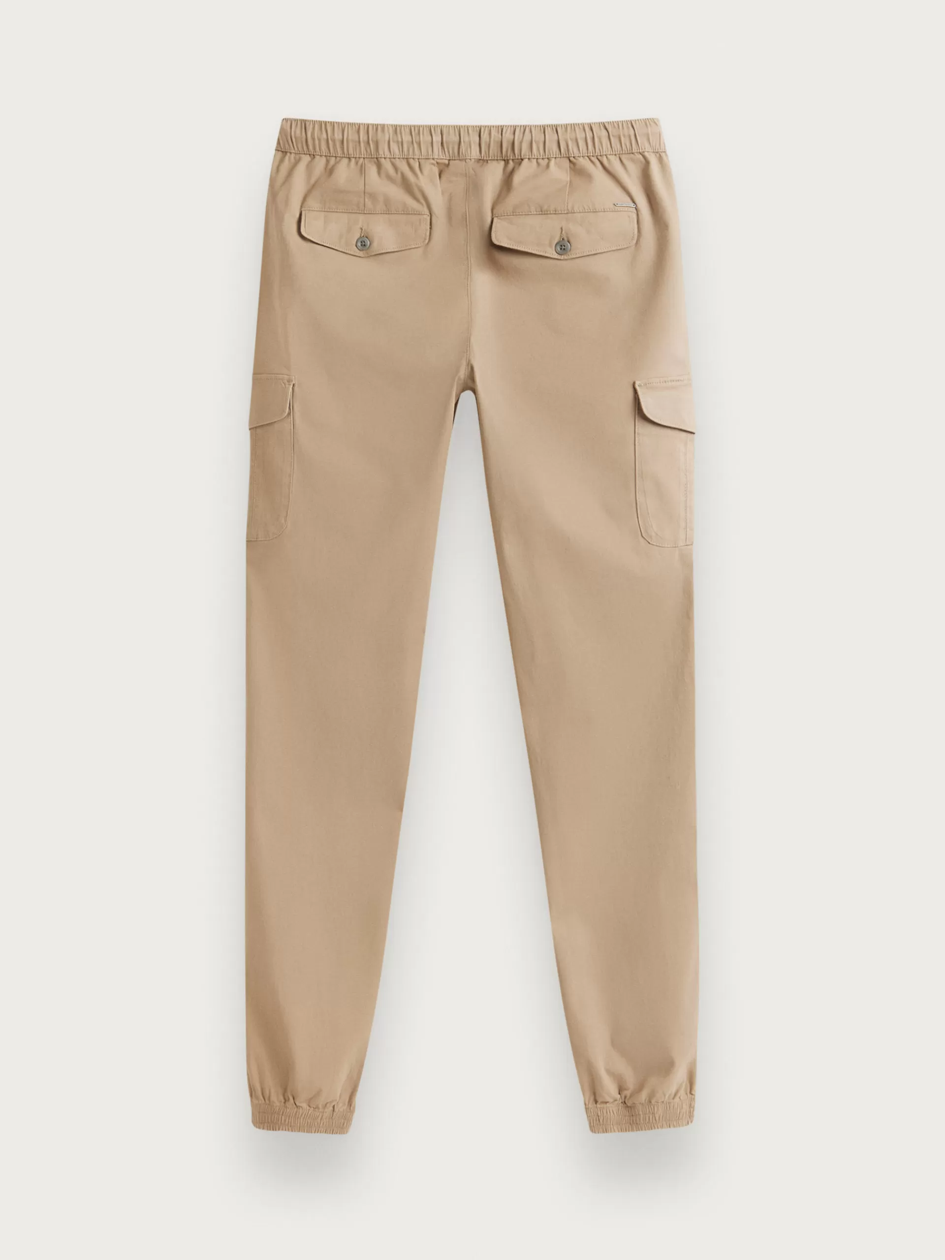 Pantalón cargo con cierre central mediante botón, cremallera y cordón ajustable al tono. Cinturilla elástica, bajo acabado en puño elástico y detalle personalizado en la parte trasera. Dos bolsillos frontales, dos en el lateral con cierre mediante tapeta y botón y dos bolsillos traseros. Corte regular fit.