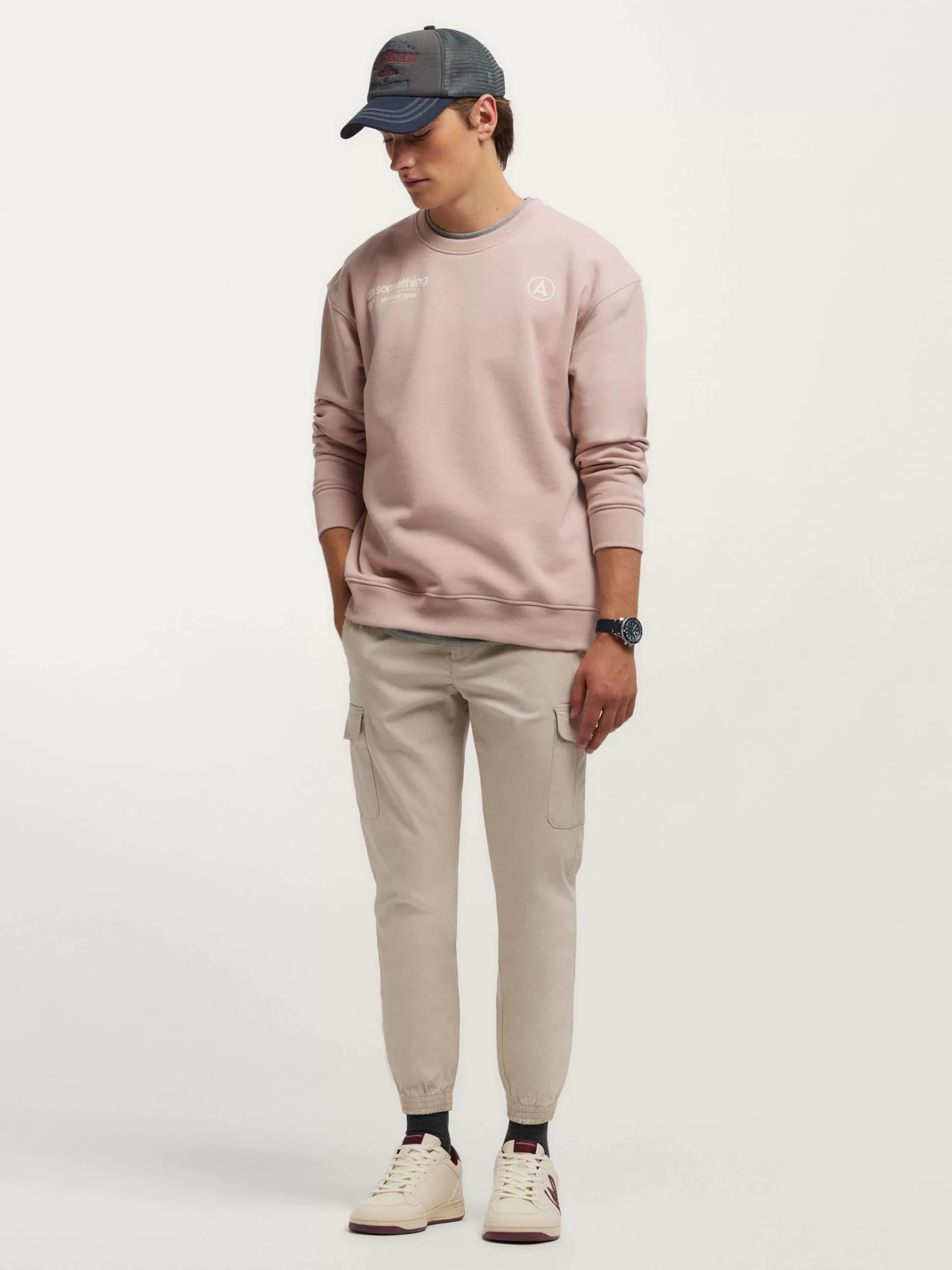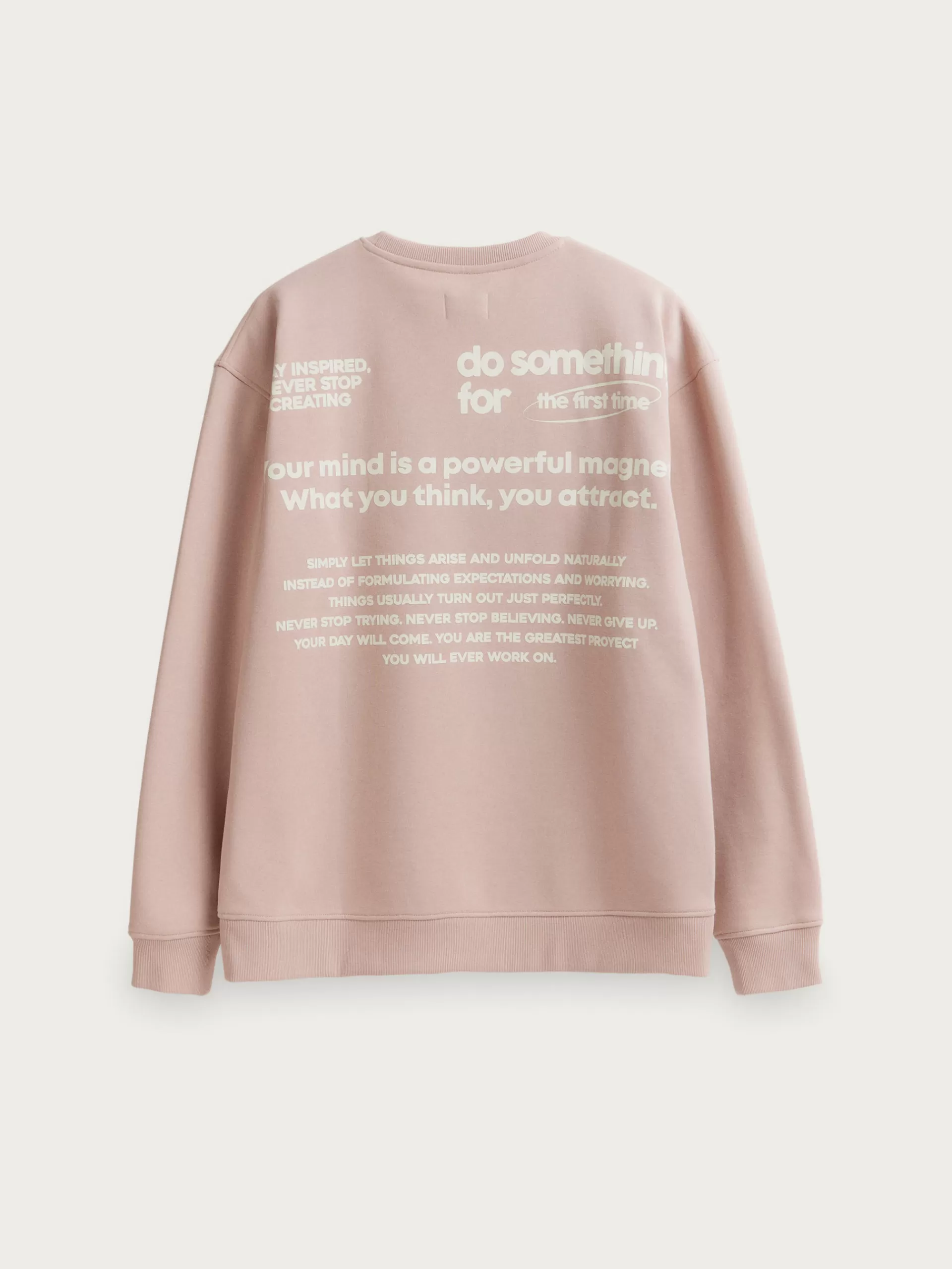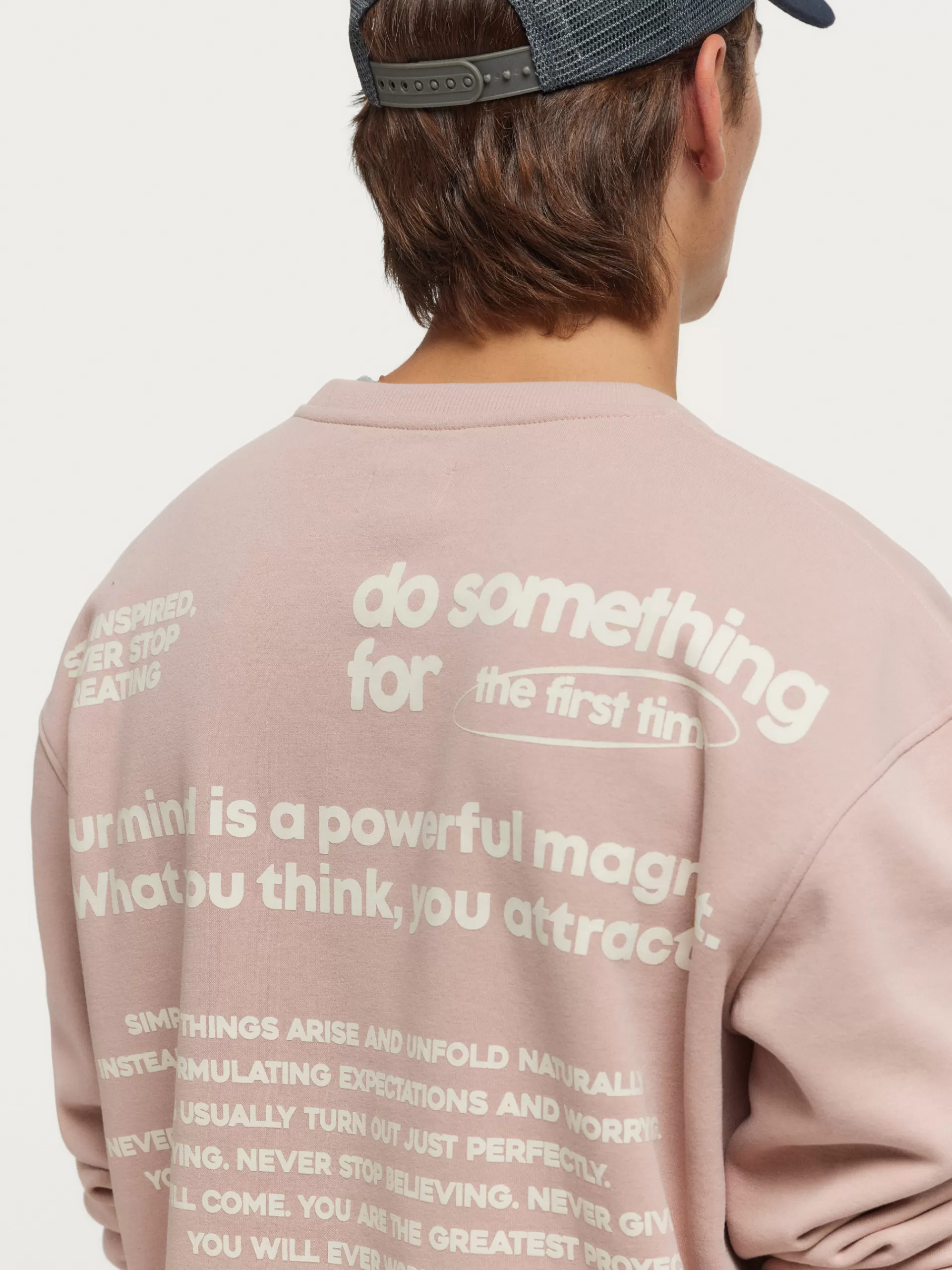 Sudadera estilo relaxed fit aportando un corte más relajado. Cuello redondo, manga larga y estampación personalizada en el frontal y en la parte trasera. Cuello, puños y bajos en acabado elástico.