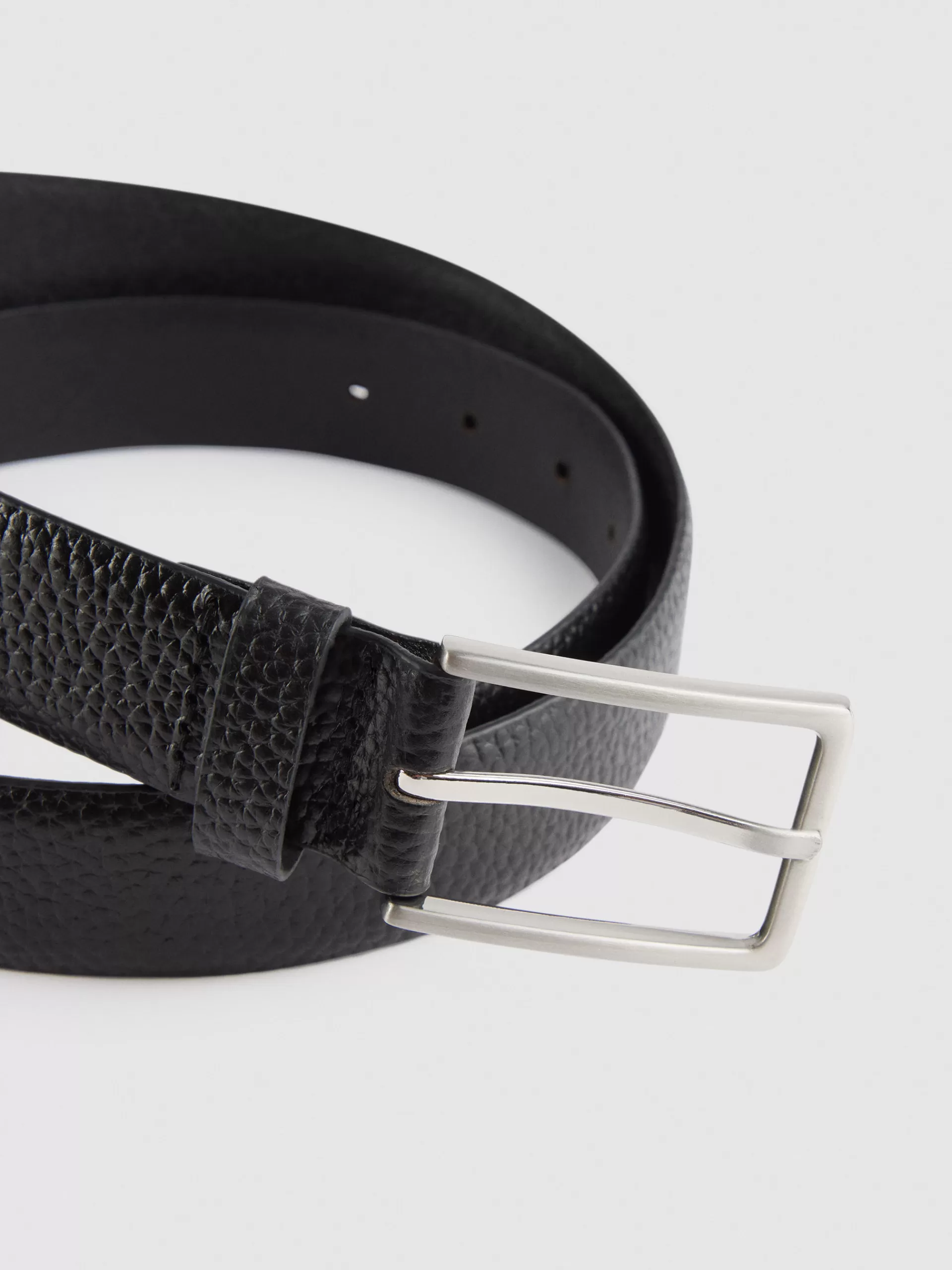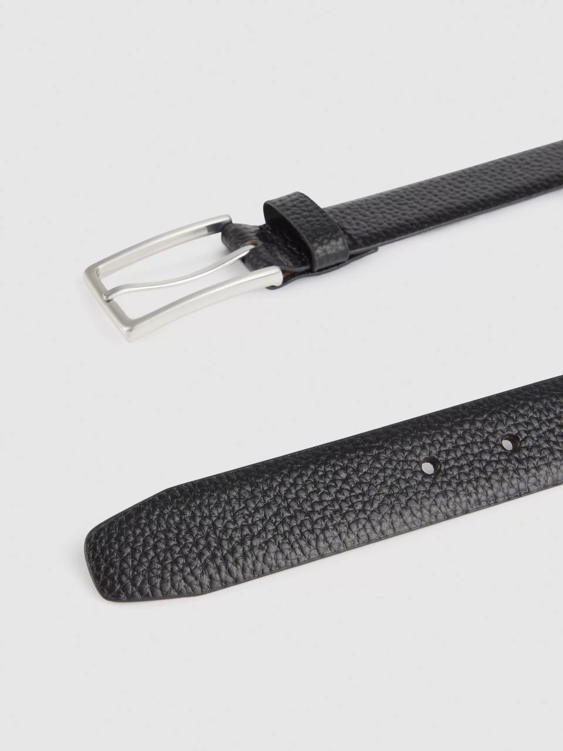 Cinturón confeccionado en piel con textura rugosa, cierre mediante hebilla metálica a contraste y pasador al tono. Det…