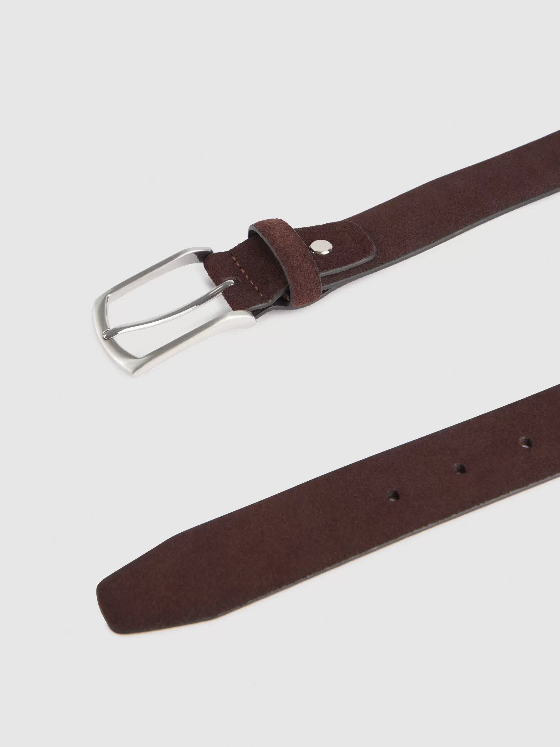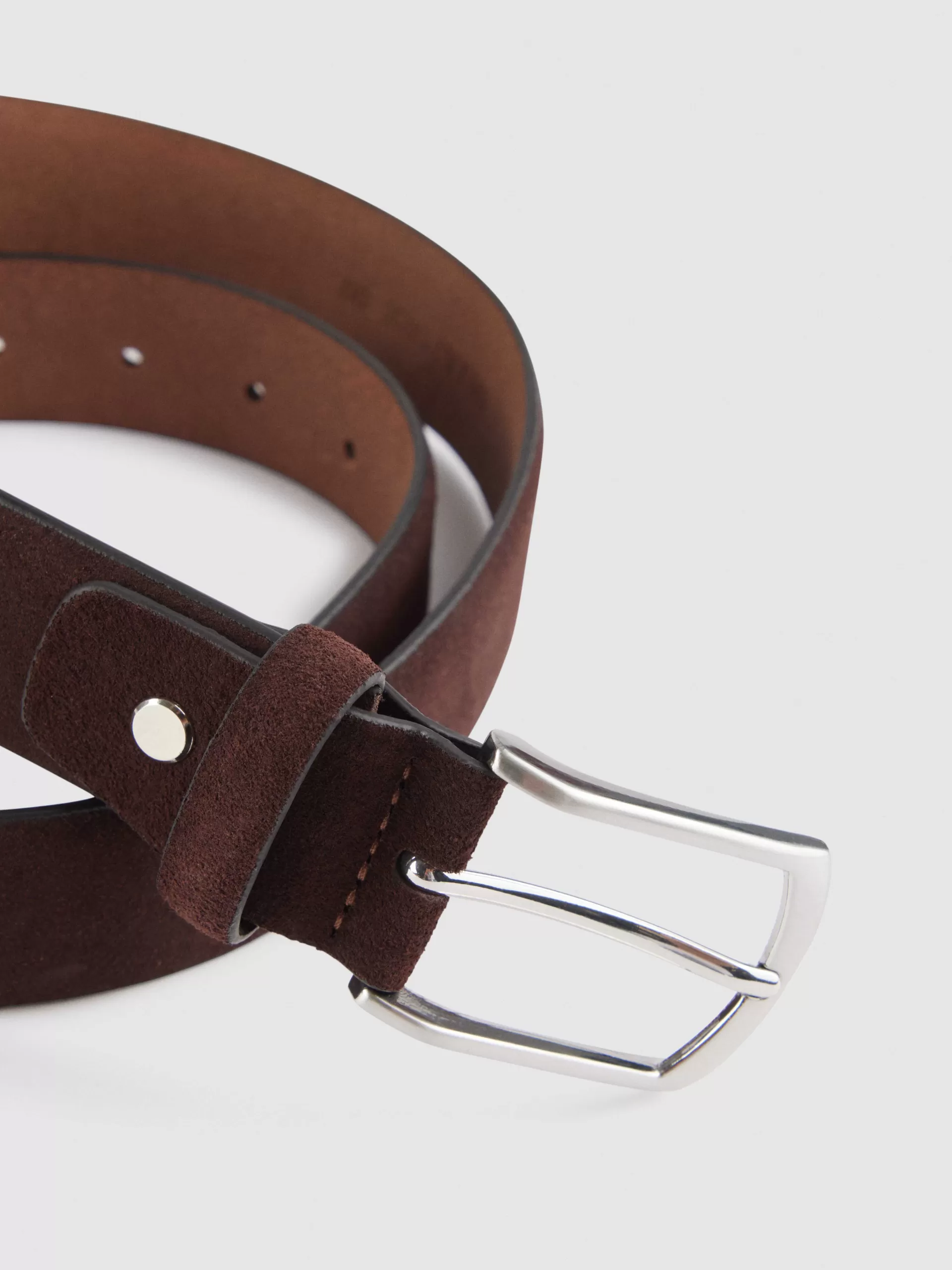Cinturón de vestir confeccionado en cuero con cierre central mediante hebilla metálica y pasador al tono.
