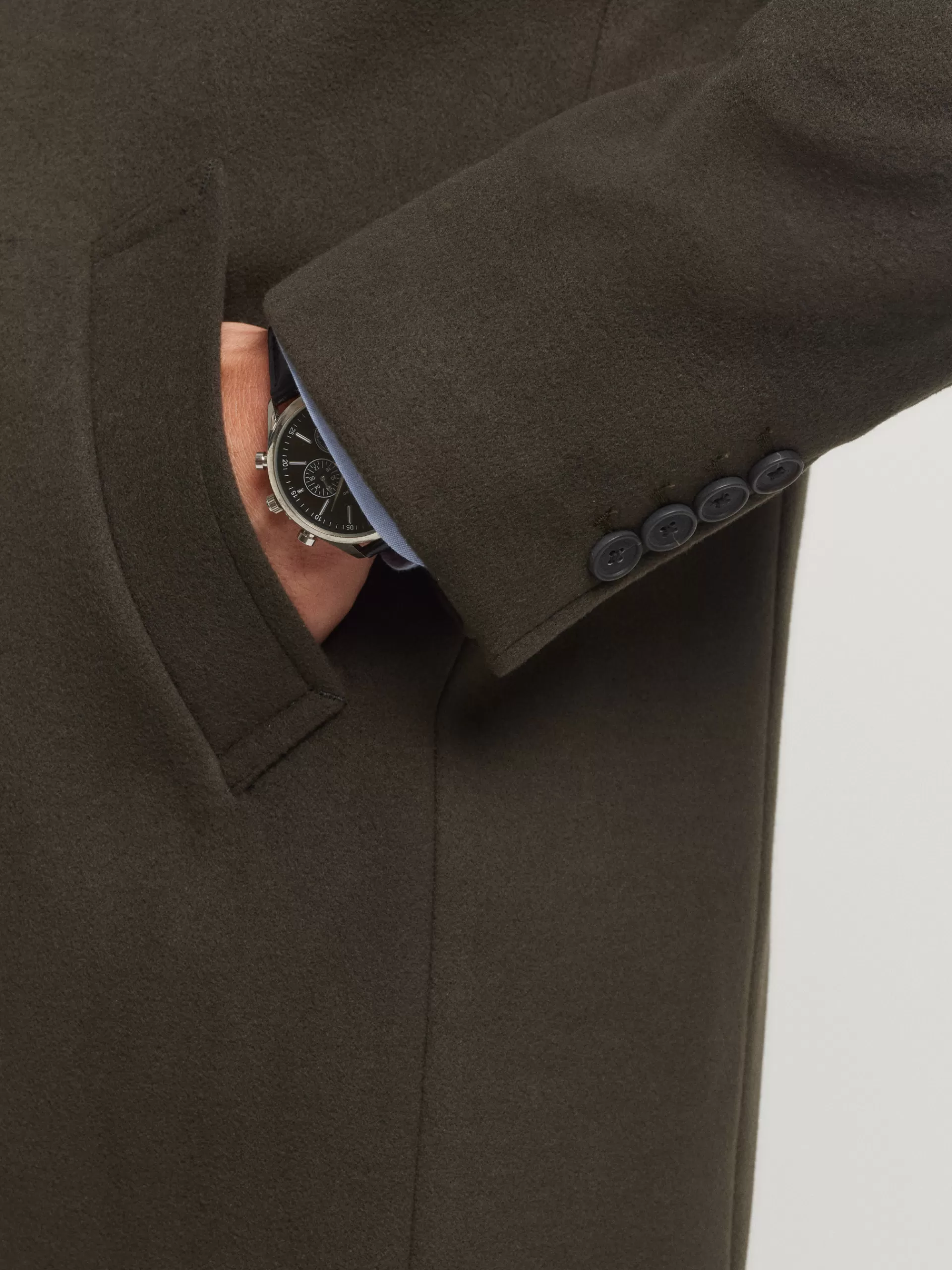 Abrigo de paño liso con cuello y solapa. Cierre central mediante botones, manga larga con botones en su terminación y dos bolsillos a la altura de la cintura. Abertura central en el bajo de la espalda. Corte regular fit.